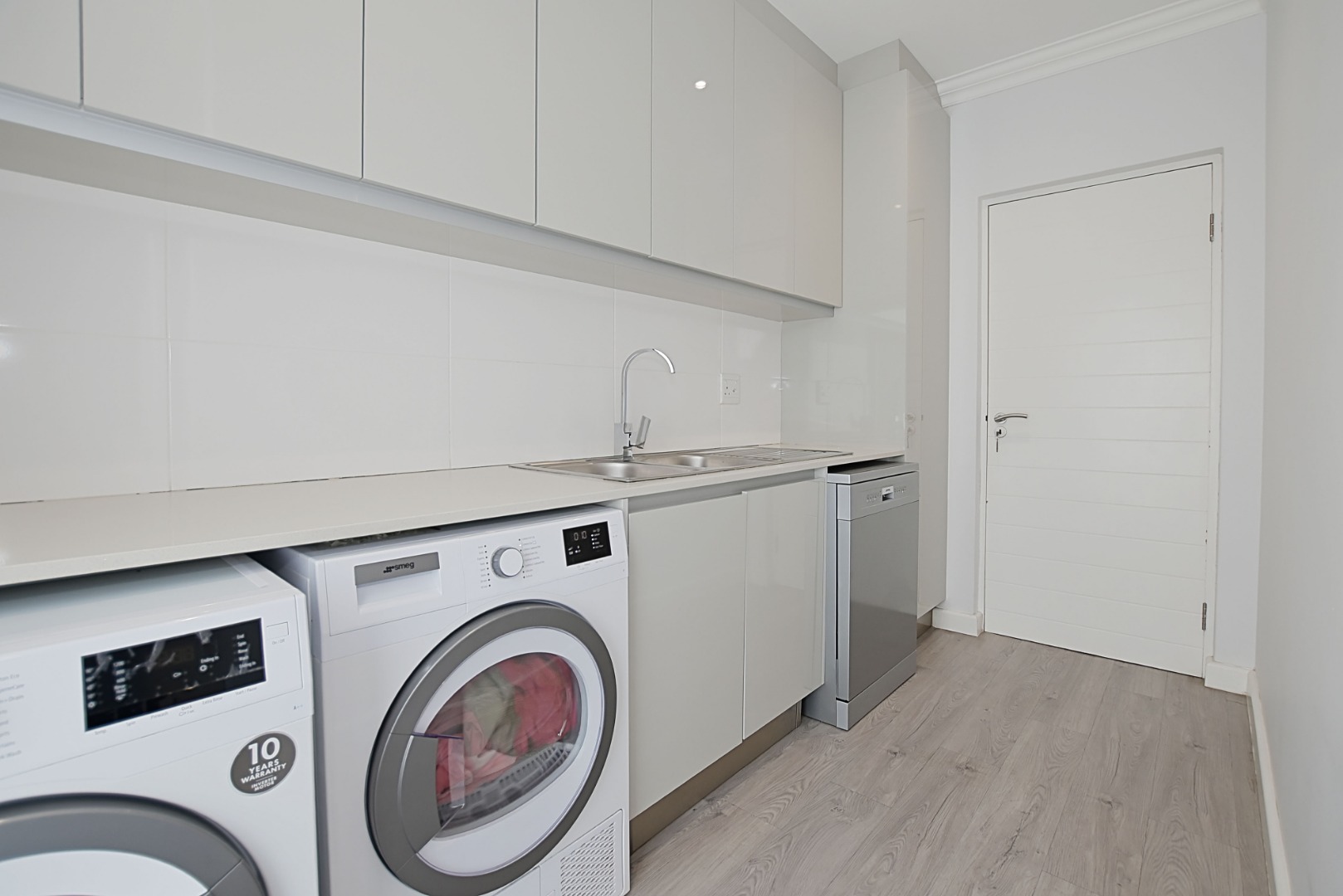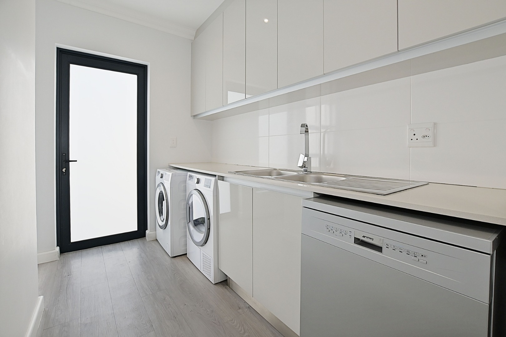 Downstairs, the open-plan lounge, dining, and kitchen area is bathed in natural light, designed for seamless flow and modern family living. The sleek kitchen boasts waterfall-edge engineered stone counters, a stylish free-standing gas and electric oven unit, and a practical scullery with space for three appliances – perfect for the home chef. The lounge features air-conditioning for year-round comfort, complemented by a convenient guest bathroom.