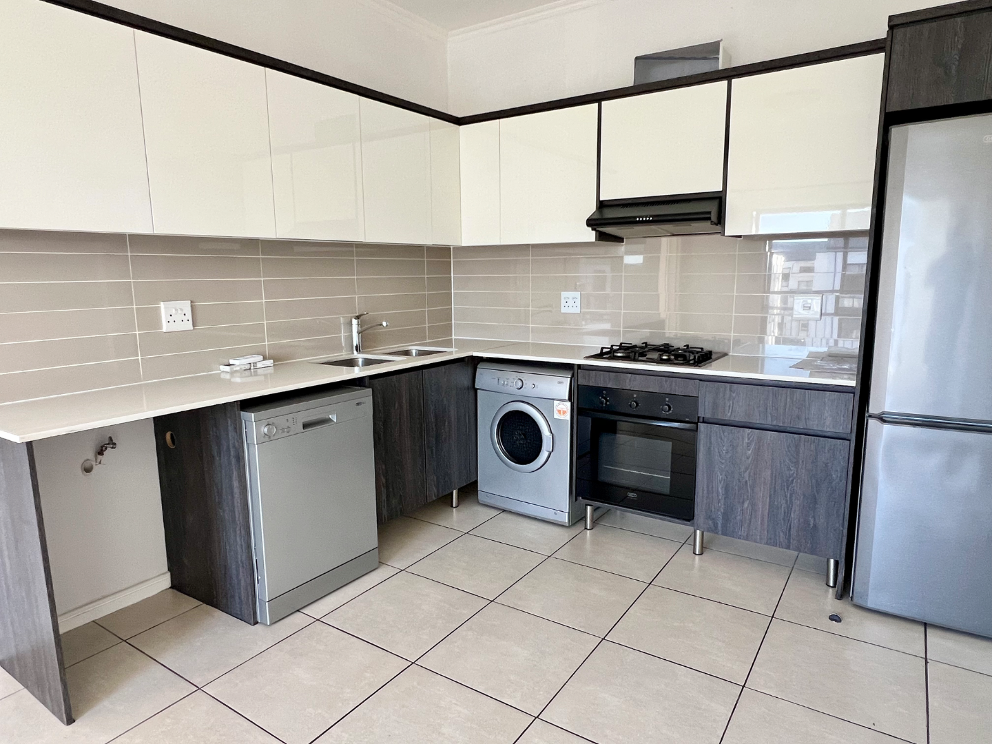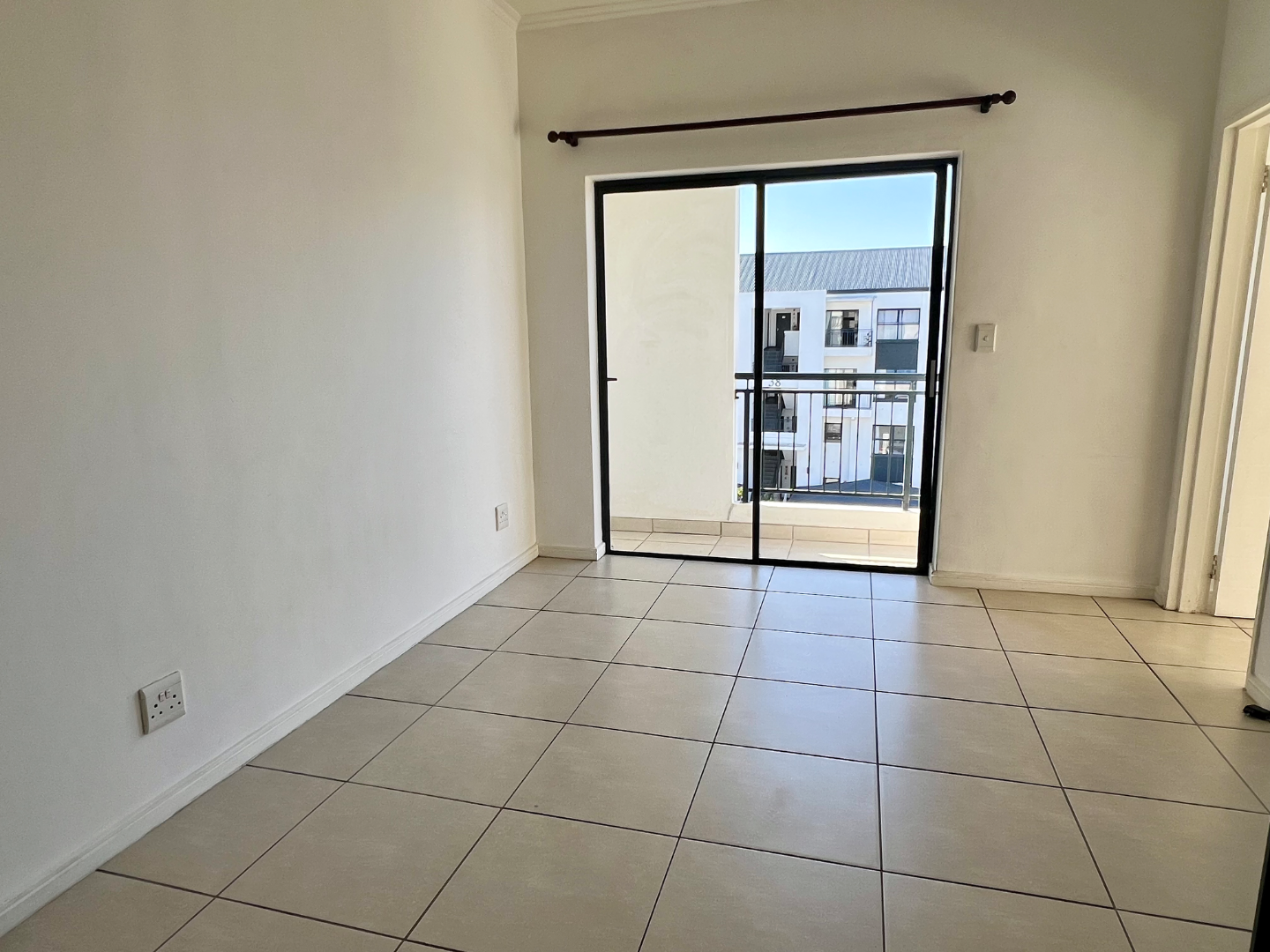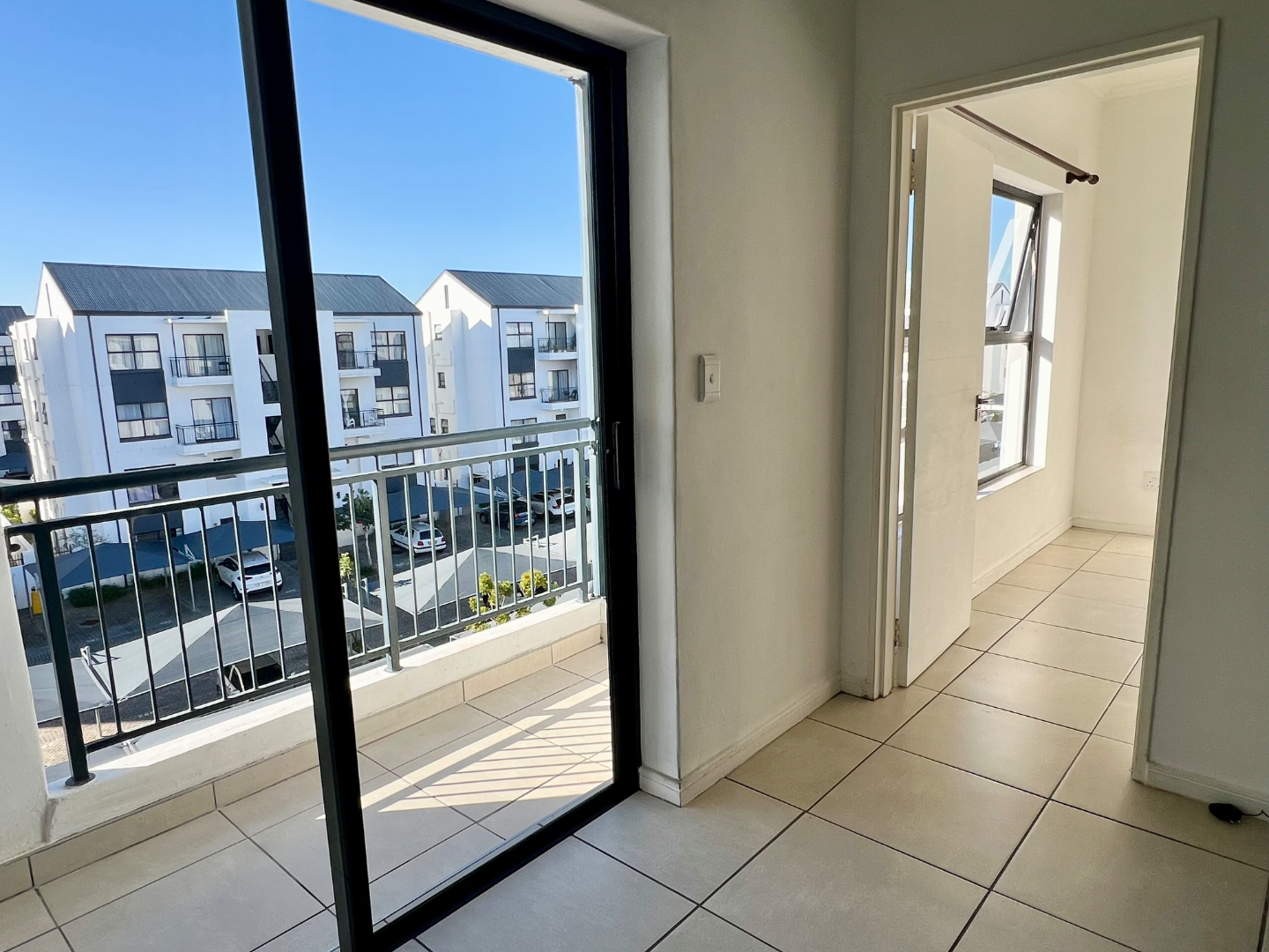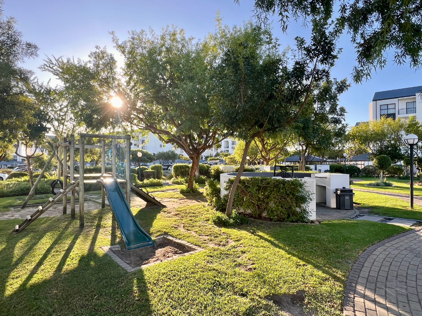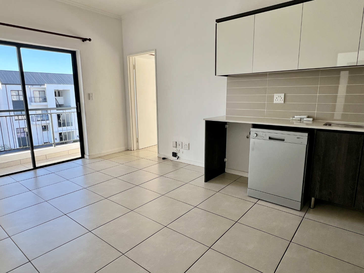 Situated in a quiet pocket of the estate, this lovely sunny apartment has a generous sized tiled lounge which is overlooked by an open plan type kitchen fitted with plenty of built in cupboards, oven, hob and extractor as well as washing machine, dishwasher and fridge. The lounge then leads out to a private north facing balcony.
