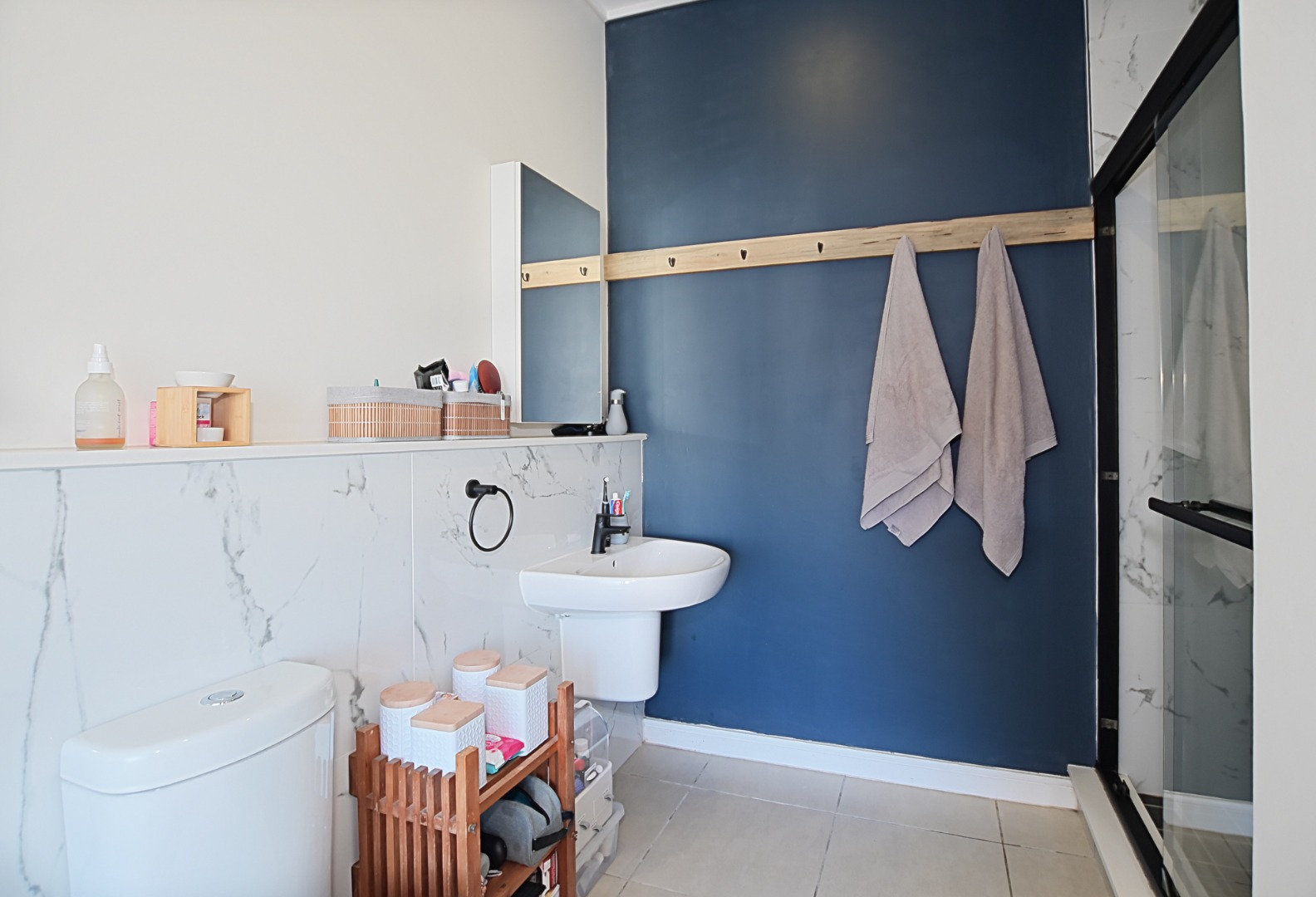 Tiled main bedroom with fitted cupboards and en-suite bathroom consisting of shower, basin and toilet.