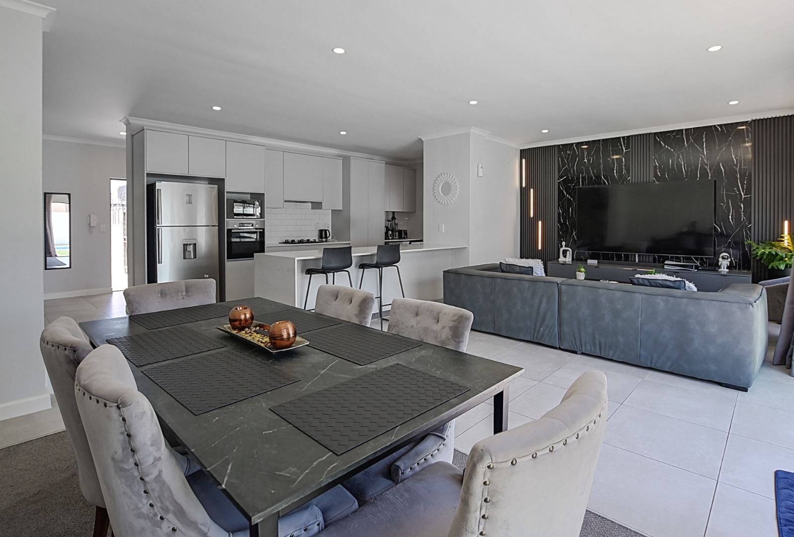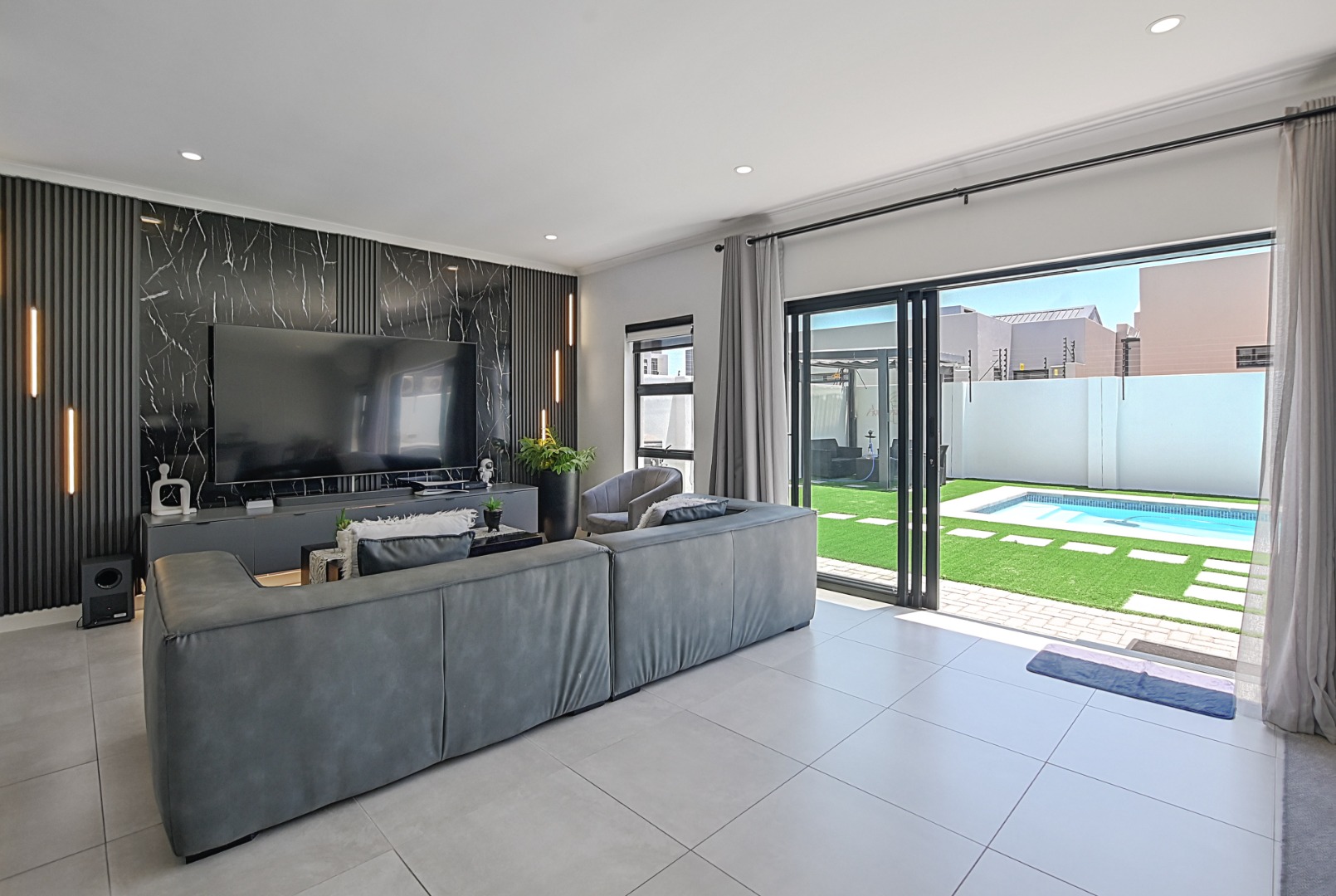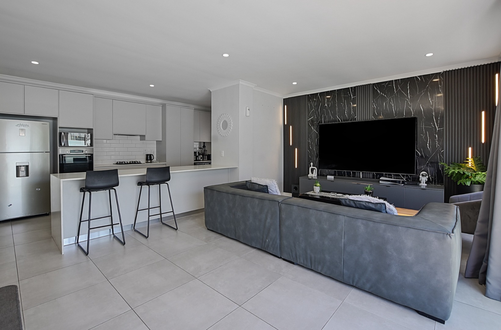 - Living Room/lounge 1 Tiled Floors, Air Conditioner, Curtain Rails, TV Port, Open Plan