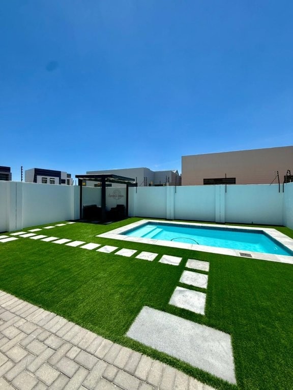 The ground floor features a spacious open-plan lounge, dining, and kitchen area, ideal for family time or entertaining guests. A sliding door from the lounge opens onto a maintenance-free garden and a lovely pool area, creating a seamless indoor-outdoor lifestyle.
