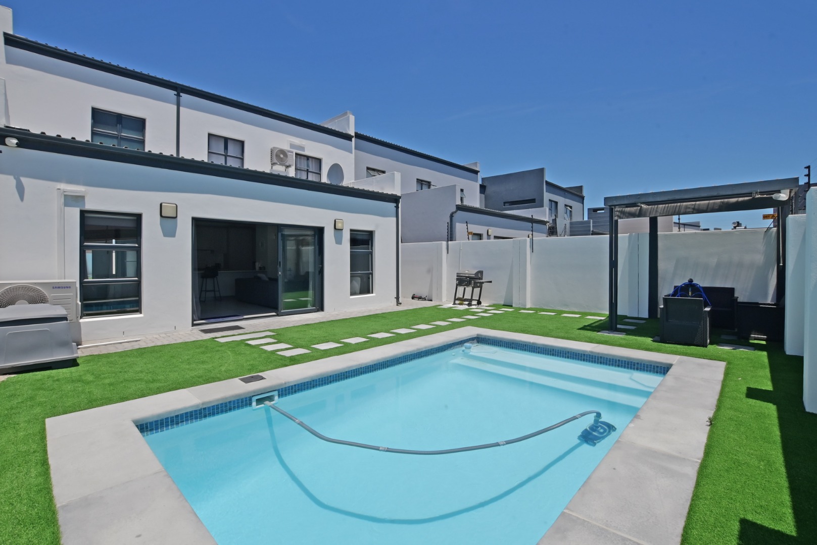 The home features aluminium windows throughout and excellent security, including an alarm system and electric security on the perimeter of the property, offering peace of mind.
