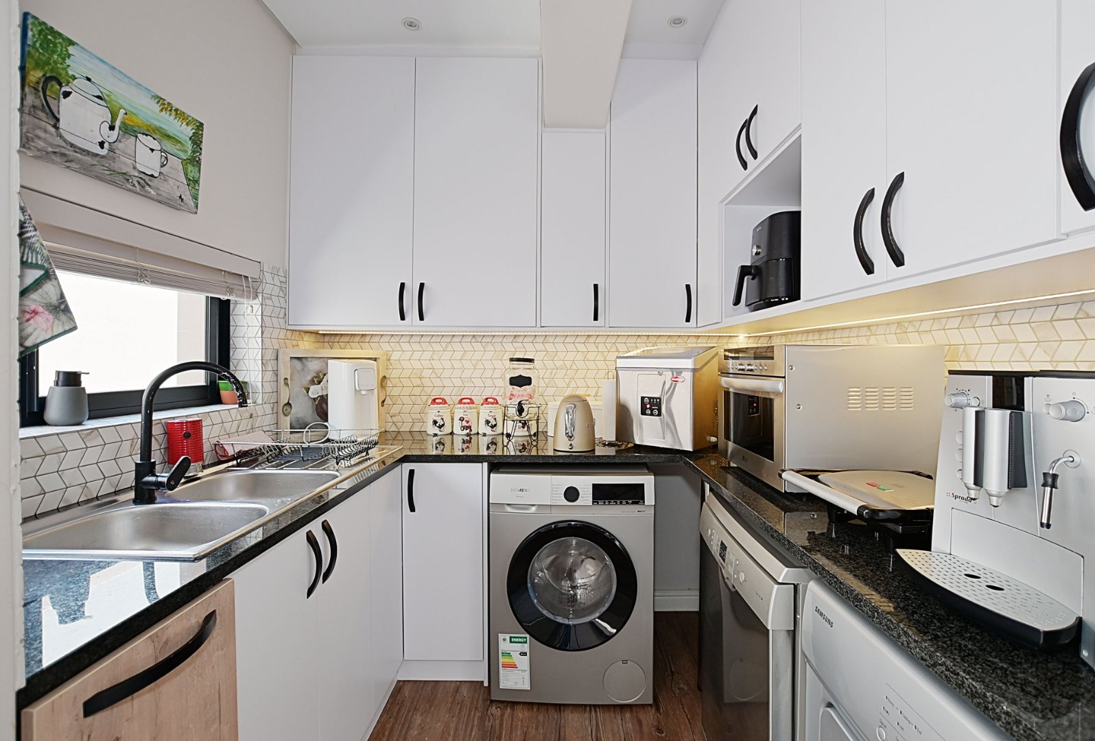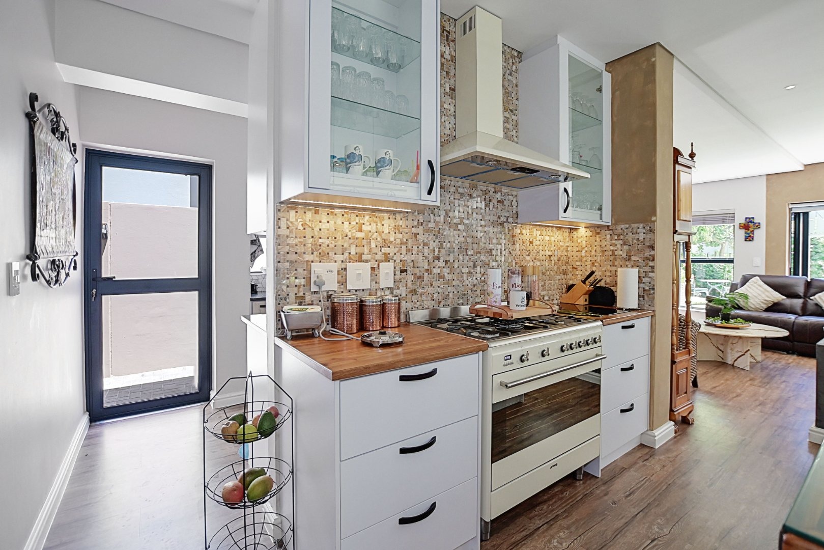 Designed for seamless indoor-outdoor living, the open-plan living areas flow effortlessly through stack-away doors to a sunny, private, and secure garden oasis complete with tranquil water features — ideal for both entertaining and unwinding. The stylish open-plan kitchen is fitted with a Smeg stove featuring a gas hob and electric oven, complemented by a separate scullery leading to a dedicated utility area.
