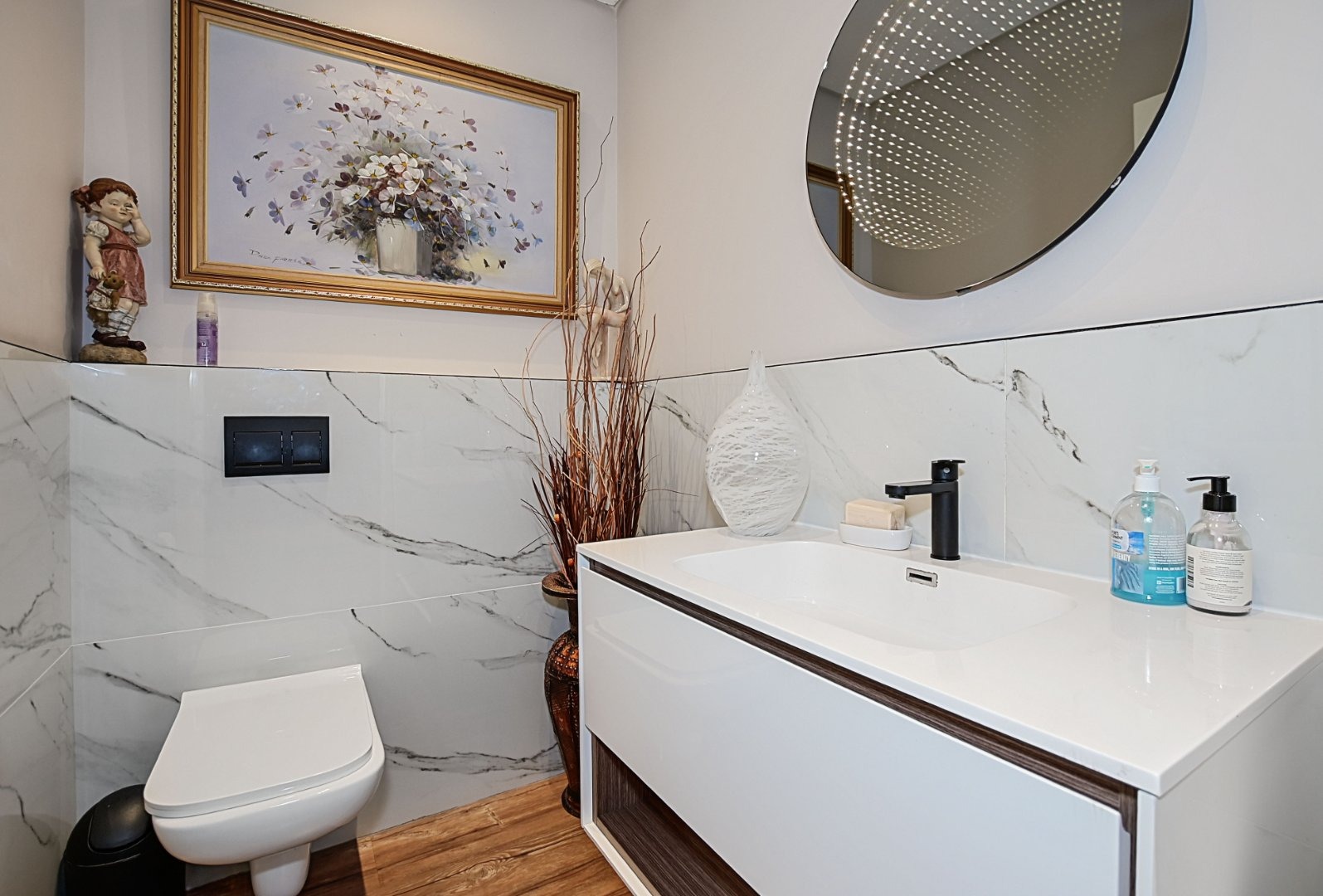 The home offers exceptional accommodation: a guest bedroom with en-suite bathroom, a guest cloakroom, and a statement fireplace anchoring the main living space. The master suite is truly expansive, featuring its own private lounge and tranquil views over a tree-lined avenue and park, along with a dressing room and luxurious full en-suite bathroom. A second generously proportioned bedroom also enjoys a full en-suite bathroom, while a dedicated office area caters perfectly to work-from-home living.