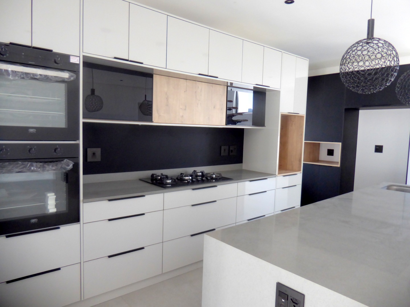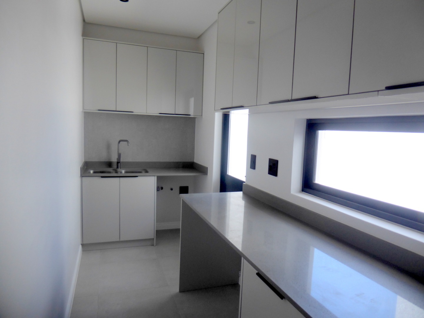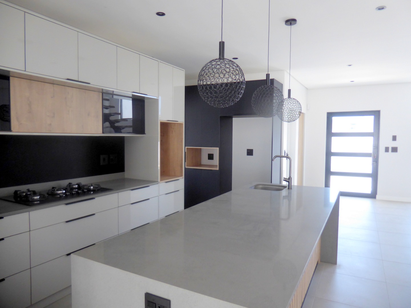 The entrance features a koi pond at the front door. A large glass pivot front door leads into the entrance hall, which houses the stairwell and flows to the spacious living area, including the dining room and living room. Large windows floods the space with light and afternoon sun. The living area opens to the covered, wind protected patio, braai area and garden, with stack away doors. The state of the art kitchen offers top class finishes and is designed to thrill the home chef! It is open plan with a large centre island and a large seperate scullery, that integrates seemlessly into the main kitchen, but is hidden. Fabulous two toned shades stands out. The kitchen has two eye level ovens, a gas hob, coffee station and space for the microwave . There is space for a double door fridge and all your appliances in the scullery.