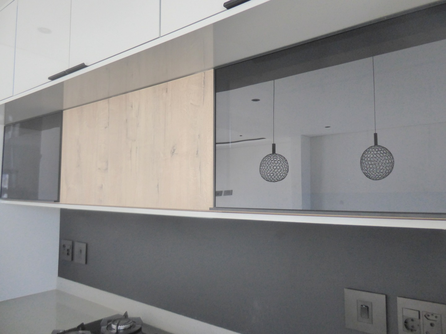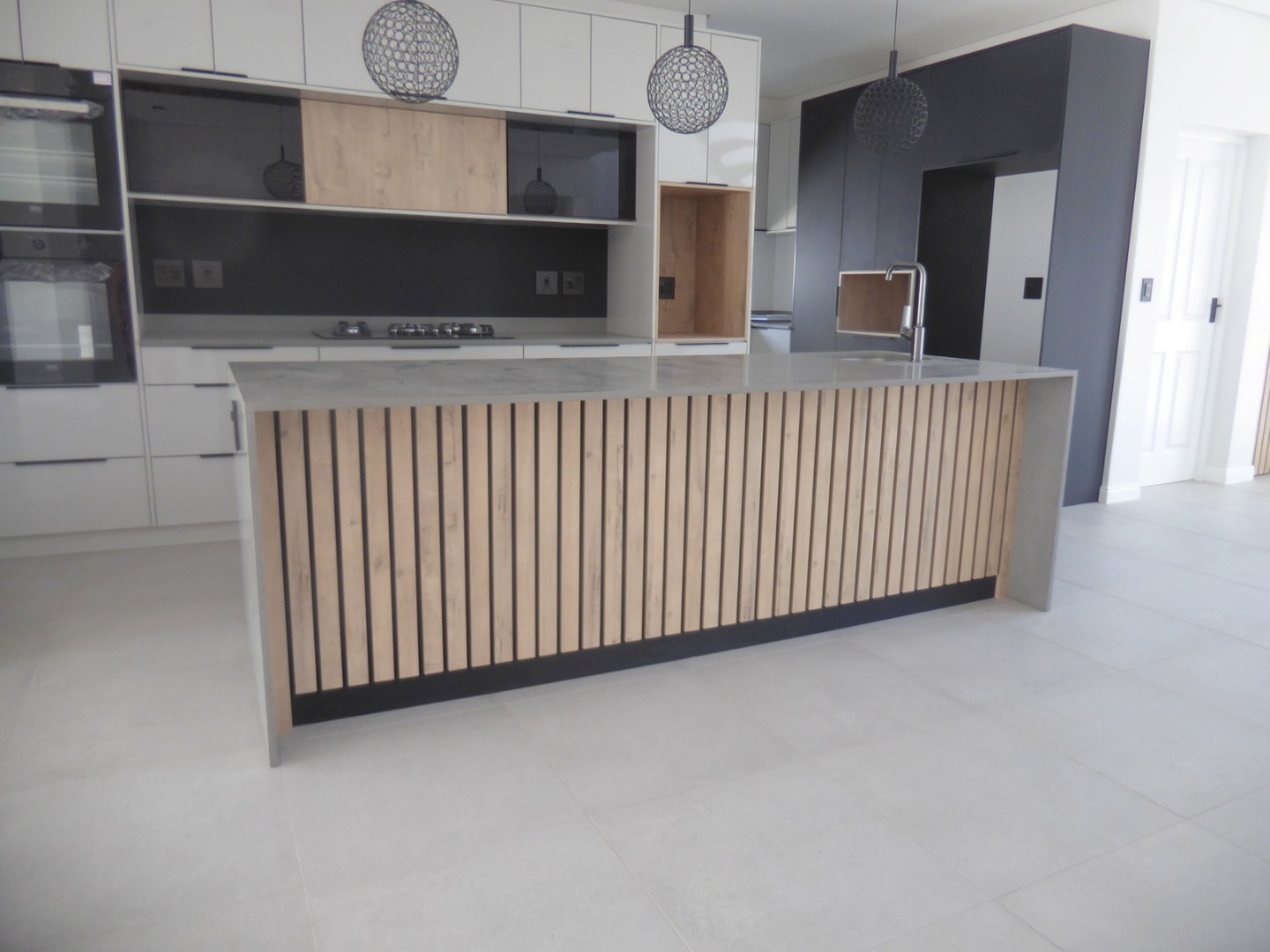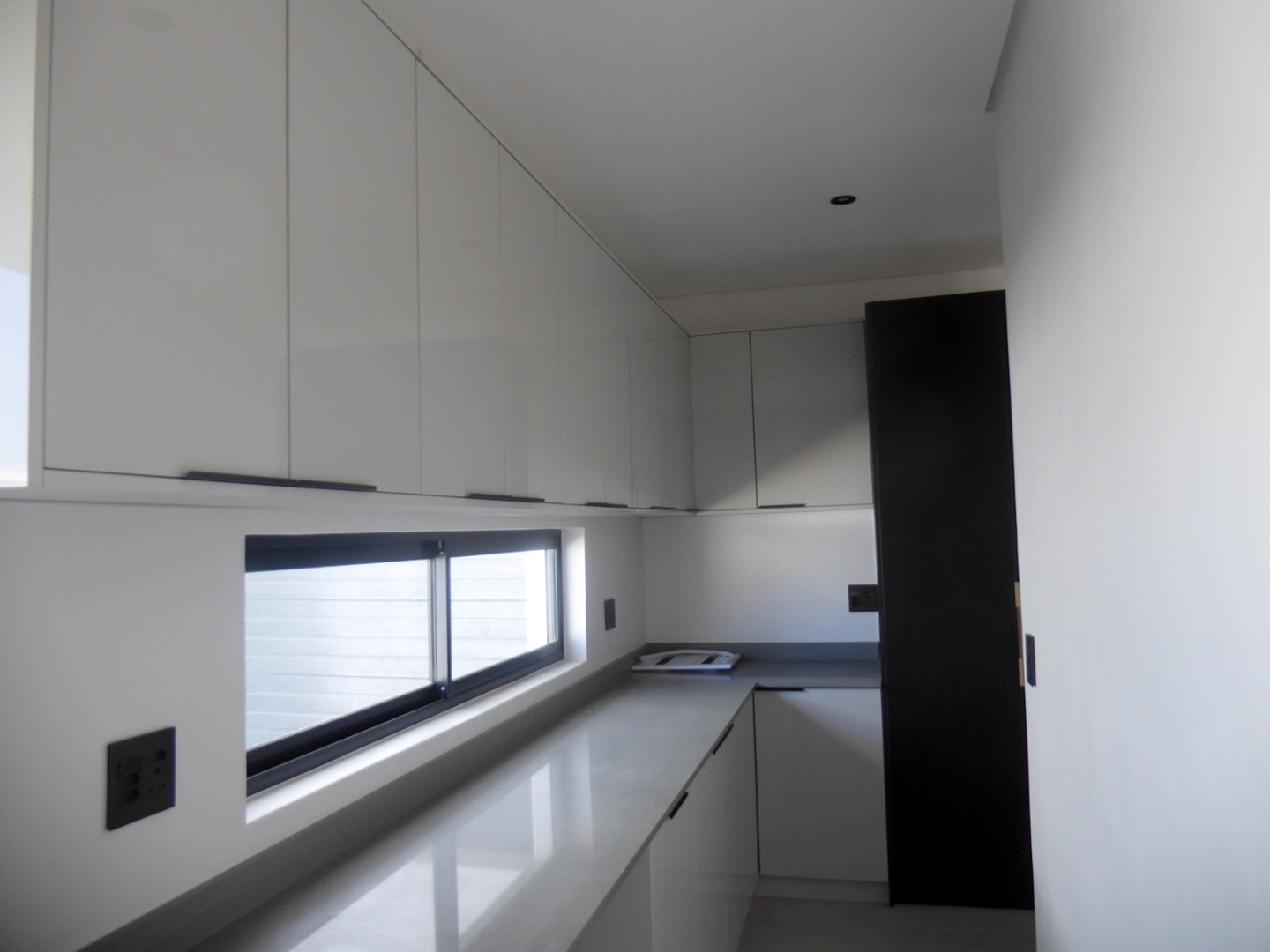 The entrance features a koi pond at the front door. A large glass pivot front door leads into the entrance hall, which houses the stairwell and flows to the spacious living area, including the dining room and living room. Large windows floods the space with light and afternoon sun. The living area opens to the covered, wind protected patio, braai area and garden, with stack away doors. The state of the art kitchen offers top class finishes and is designed to thrill the home chef! It is open plan with a large centre island and a large seperate scullery, that integrates seemlessly into the main kitchen, but is hidden. Fabulous two toned shades stands out. The kitchen has two eye level ovens, a gas hob, coffee station and space for the microwave . There is space for a double door fridge and all your appliances in the scullery.