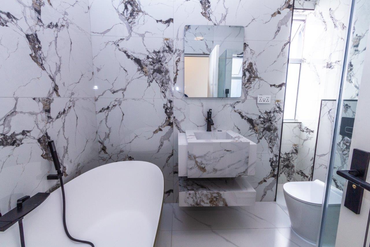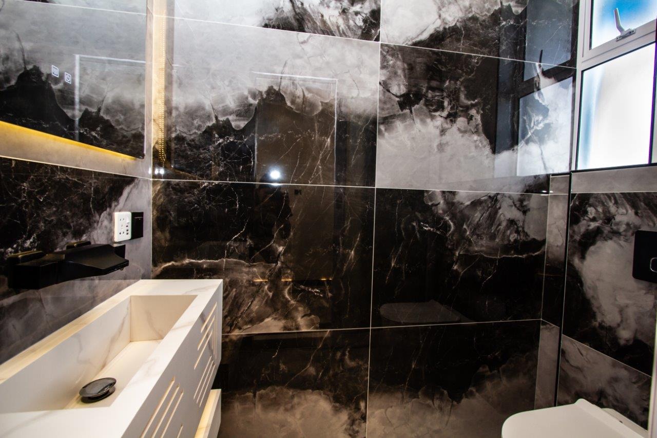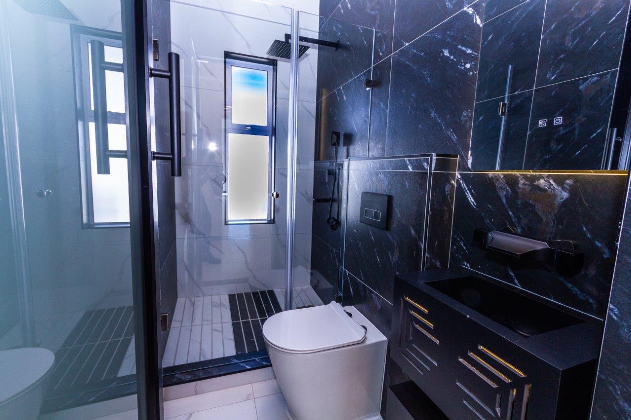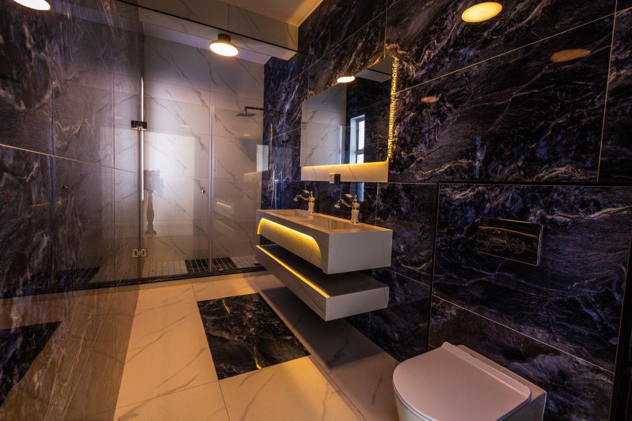 • 4 Ultra-modern, James Bond style Bathrooms boasting floating Vanities and high end Button Flush toilets, with Frameless Glass Showers with Rain heads in 3.