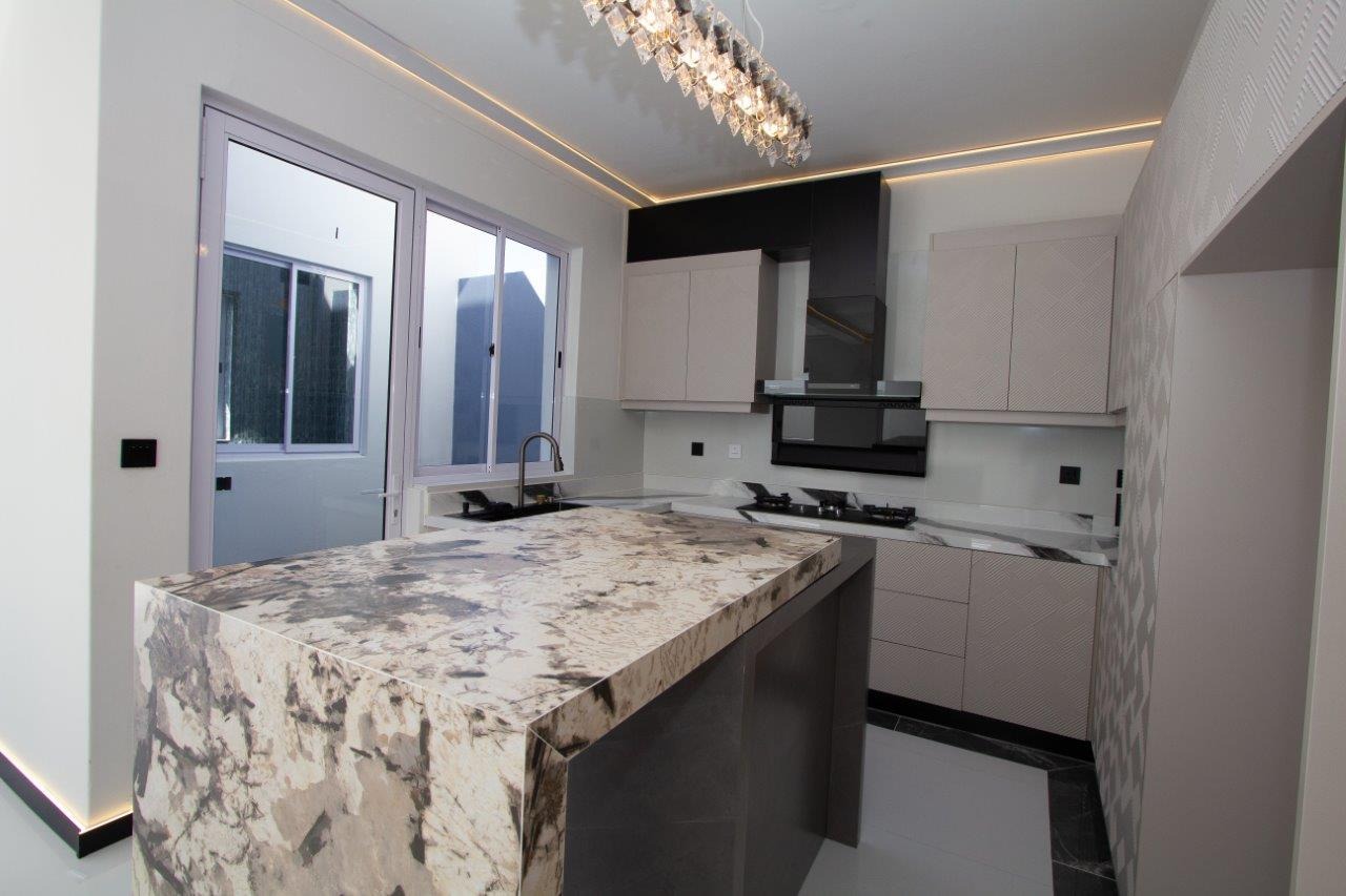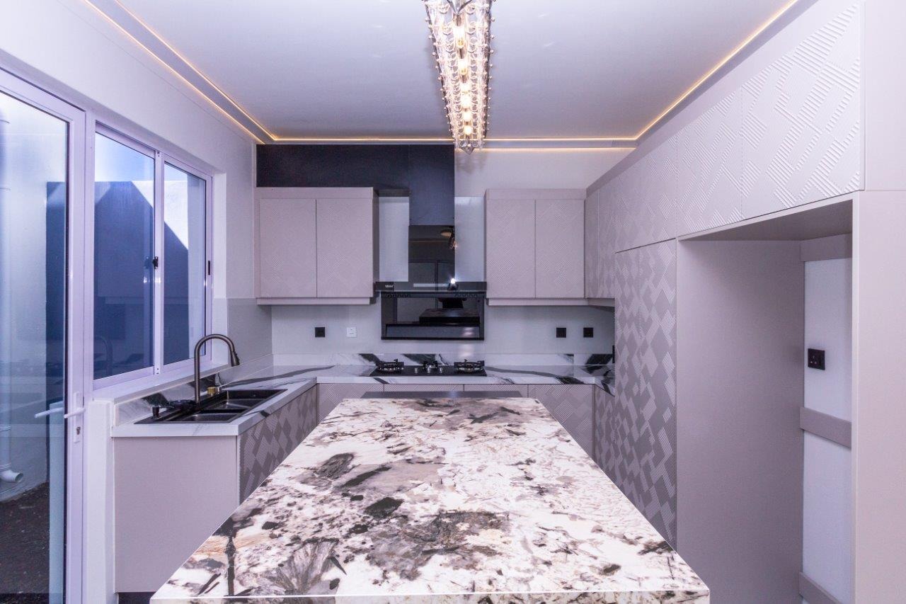 • State of the art, voice-activated, custom Kitchen with Gas Cooker, floating Prep-Island, Caesarstone tops and separate Scullery