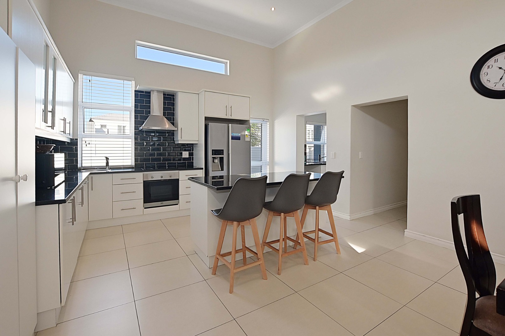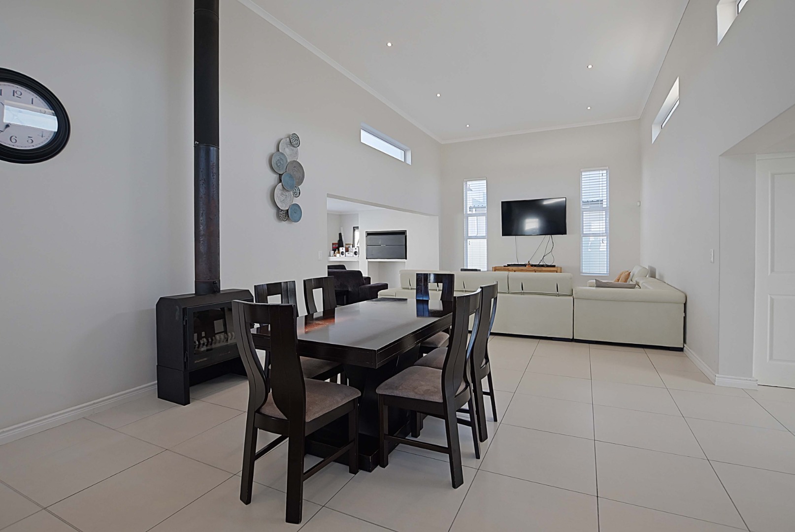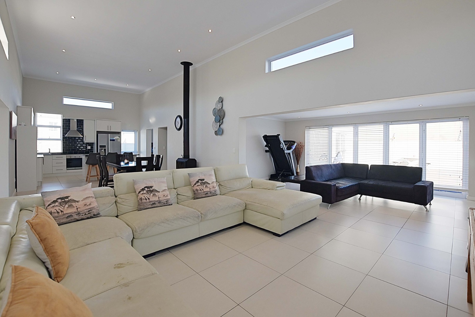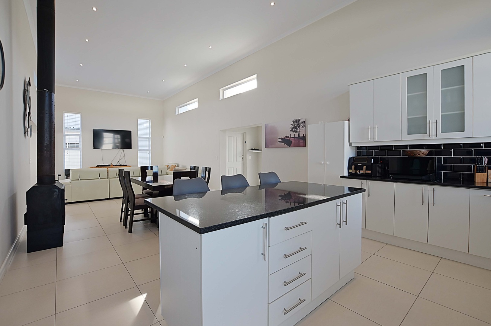 Gourmet kitchen with engineered countertops, Expansive open-plan living room, dining areas with high ceilings, fireplace and indoor Braai room perfect for entertaining.