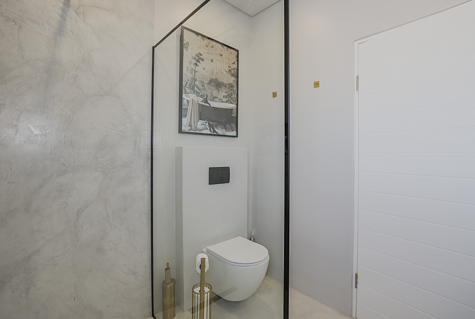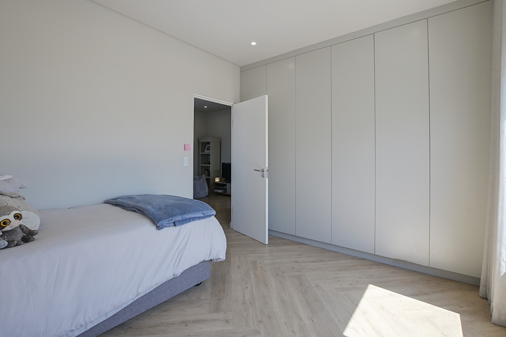 Upstairs, the beautiful staircase leads to a spacious landing with a built-in desk, ideal for a study or work-from-home space. Large windows allow natural light to flood the area while offering lovely views of the surrounding area with the Durbanville Hills in the distance. A stylish black chandelier adds a modern design touch.