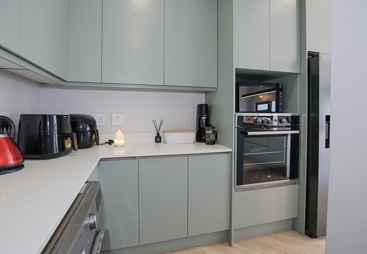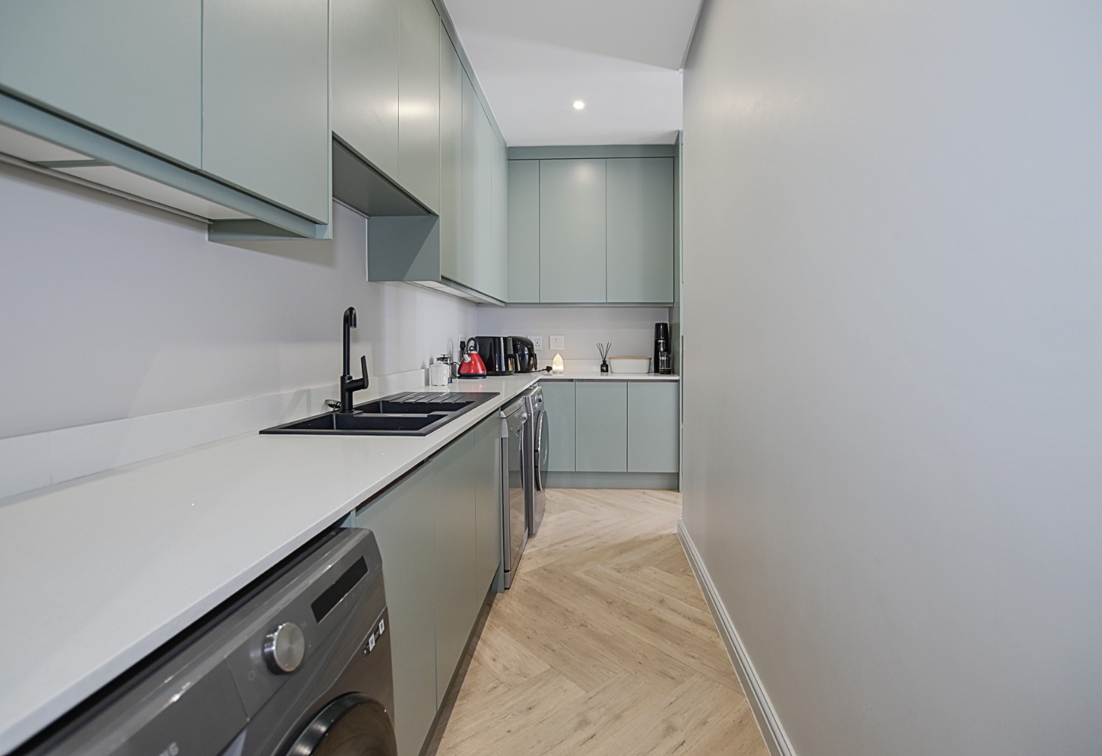 The heart of the home is the stunning open-plan kitchen, beautifully finished with stone countertops and bold, modern tones. Designed with both practicality and style in mind, the kitchen offers ample cupboard space and drawers, a large central island with prep bowl and seating for family or guests, a fitted gas hob with extractor fan, and an eye-level oven with space for an integrated microwave and double-door fridge. The separate scullery is neatly tucked away and provides ample additional cupboard space as well as plumbing for a dishwasher, washing machine and space for a tumble dryer.