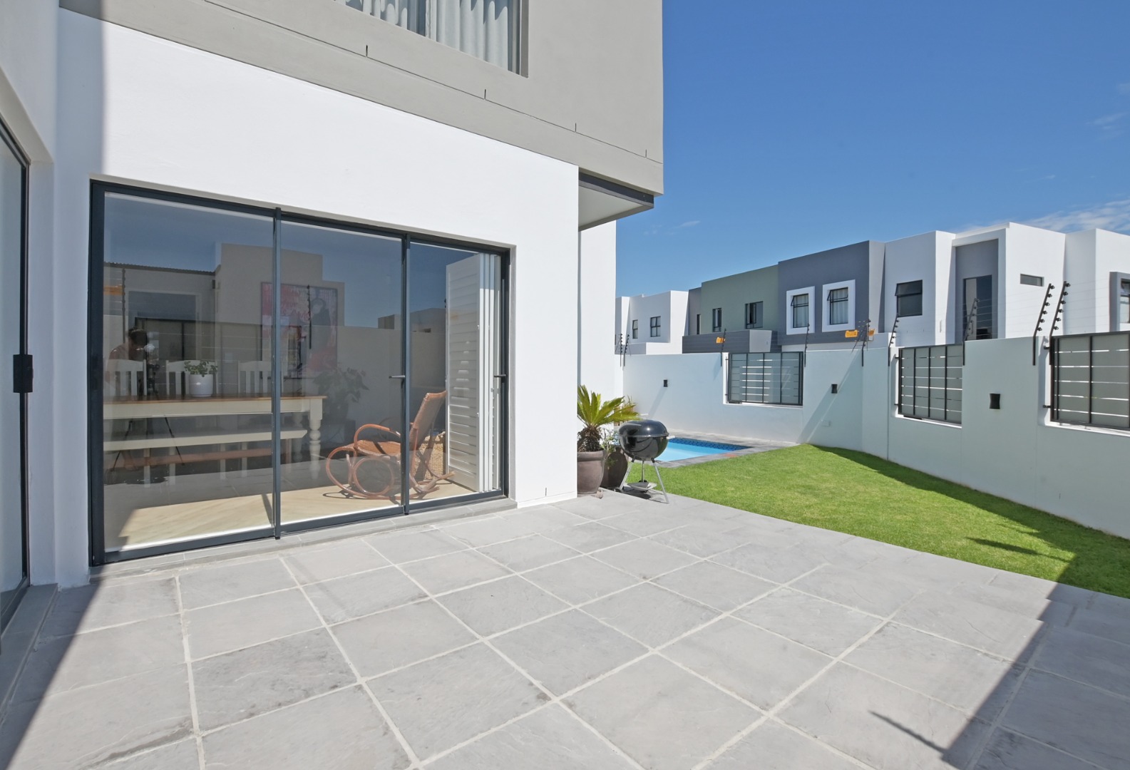 The dining area flows seamlessly from the kitchen and lounge and features a large built-in open braai or fireplace, ideal for warming the entire living space