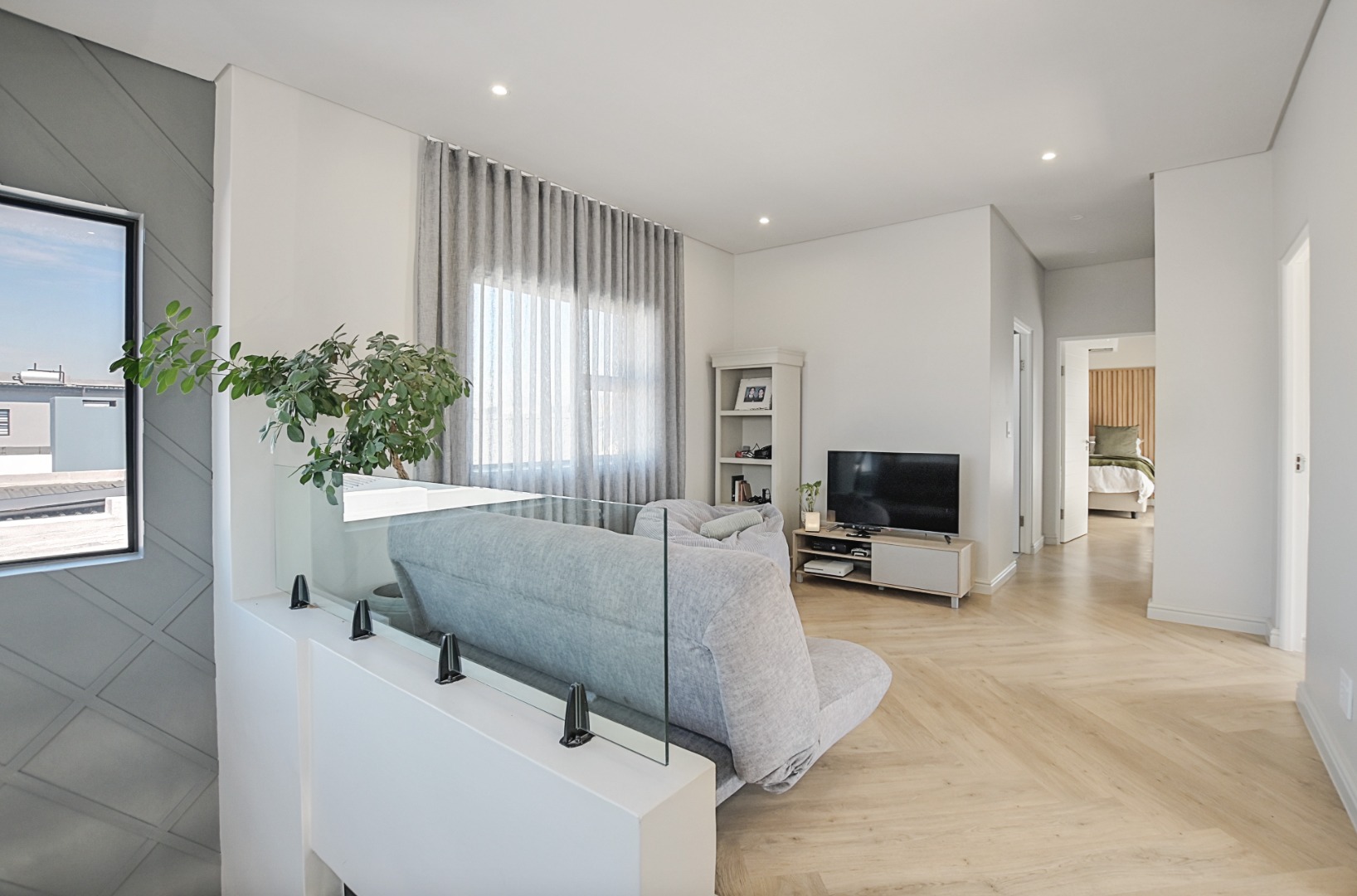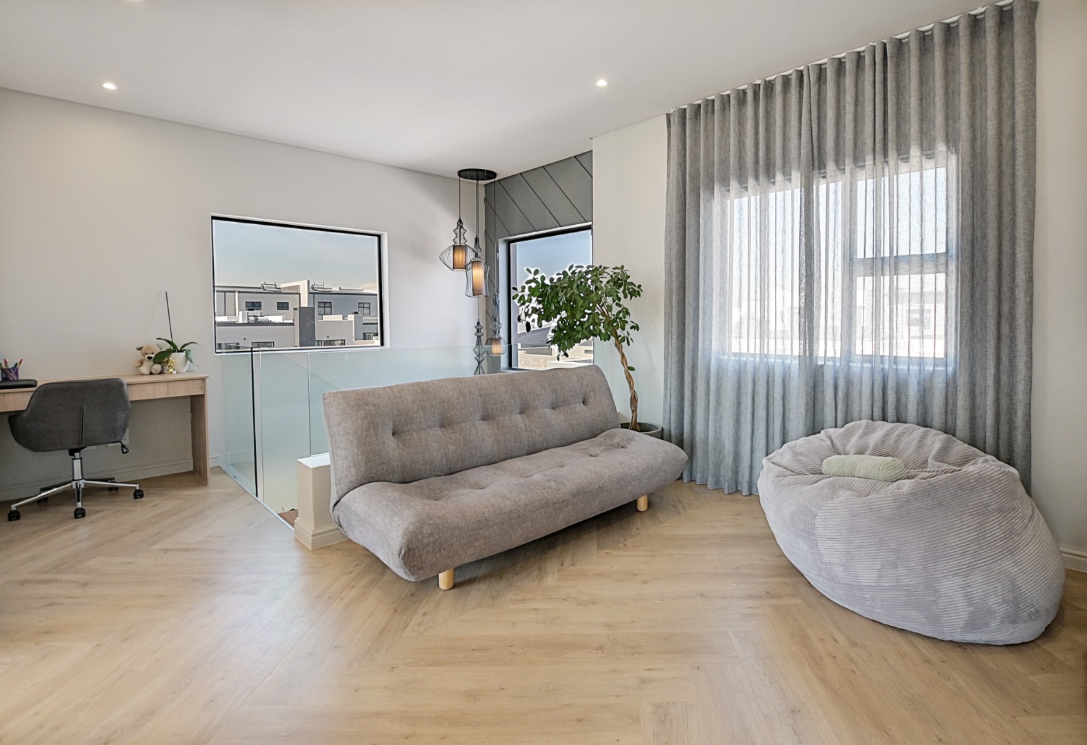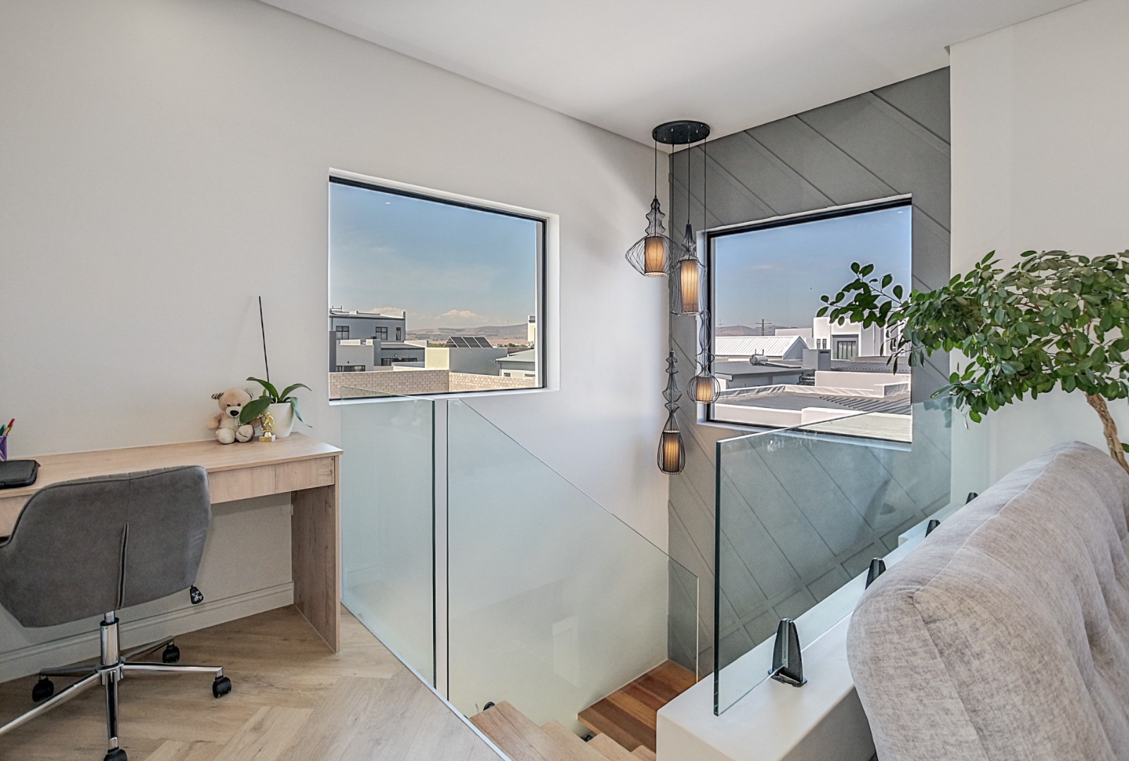 Upstairs, the beautiful staircase leads to a spacious landing with a built-in desk, ideal for a study or work-from-home space. Large windows allow natural light to flood the area while offering lovely views of the surrounding area with the Durbanville Hills in the distance. A stylish black chandelier adds a modern design touch.