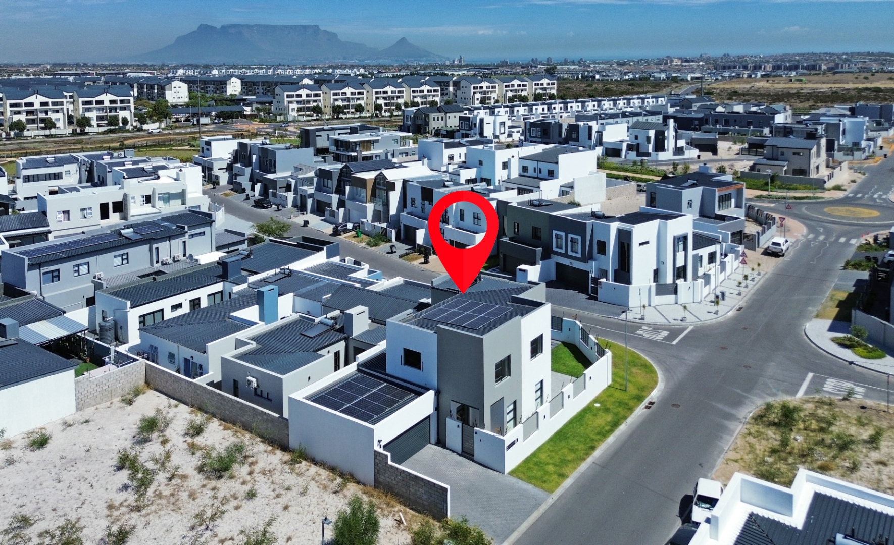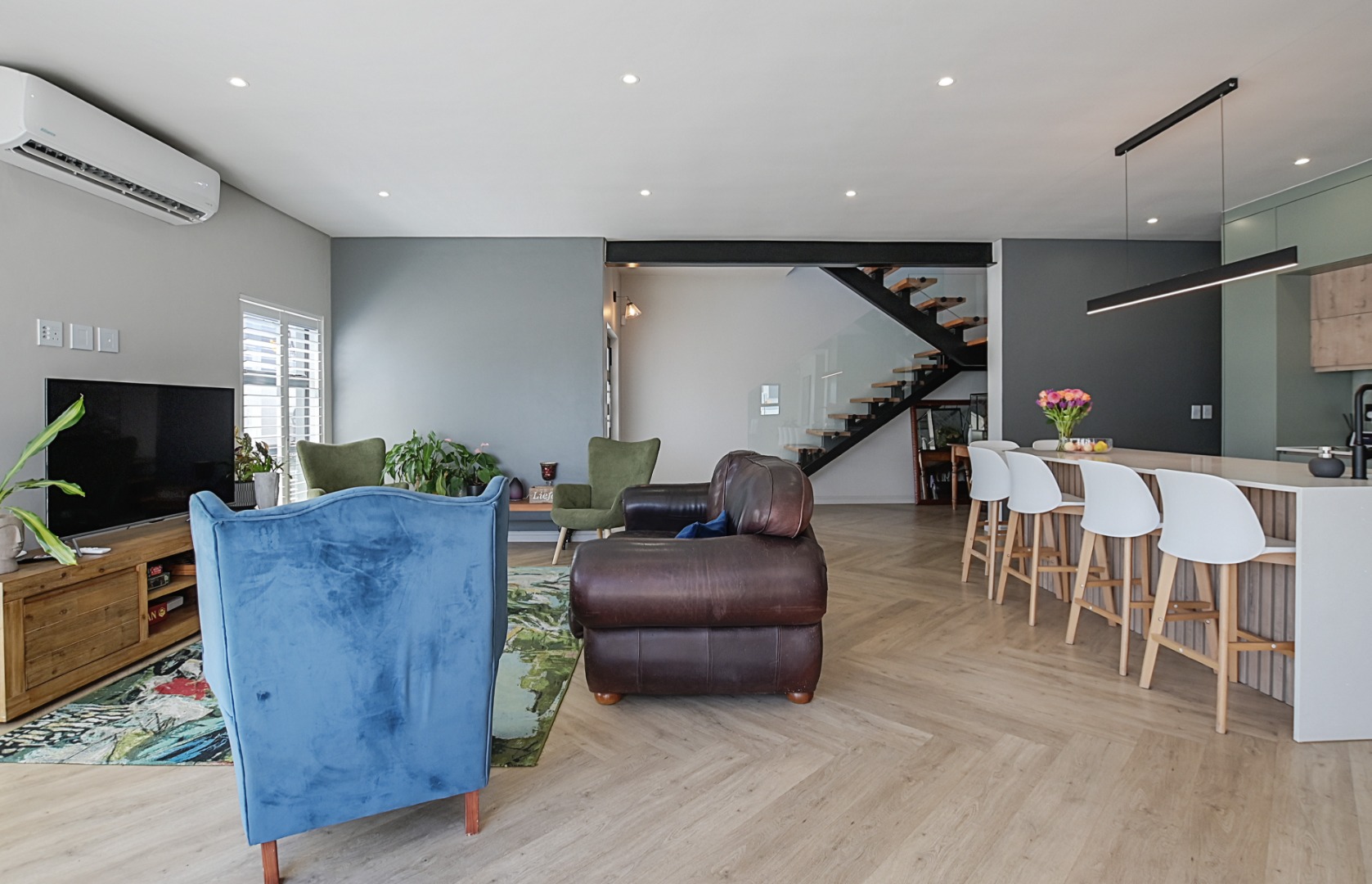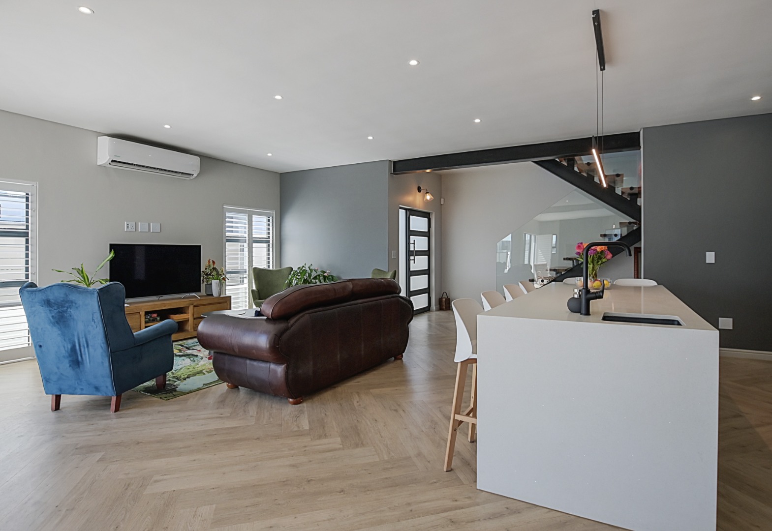 Upstairs, the beautiful staircase leads to a spacious landing with a built-in desk, ideal for a study or work-from-home space. Large windows allow natural light to flood the area while offering lovely views of the surrounding area with the Durbanville Hills in the distance. A stylish black chandelier adds a modern design touch.