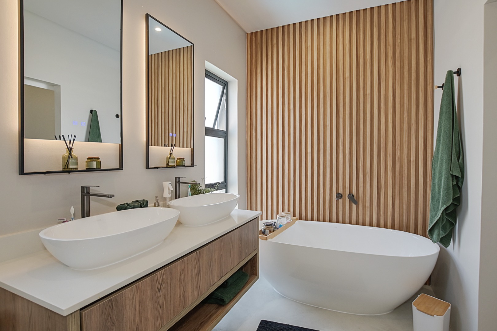 The luxurious main suite offers a private dressing area with ample built-in cupboards and a beautifully designed en-suite bathroom complete with a slipper bath, large walk-in shower, double vanity and toilet.