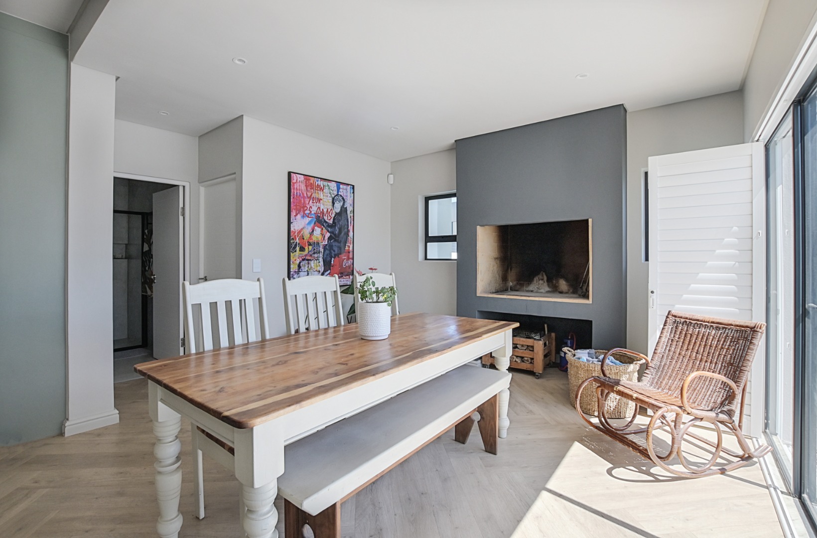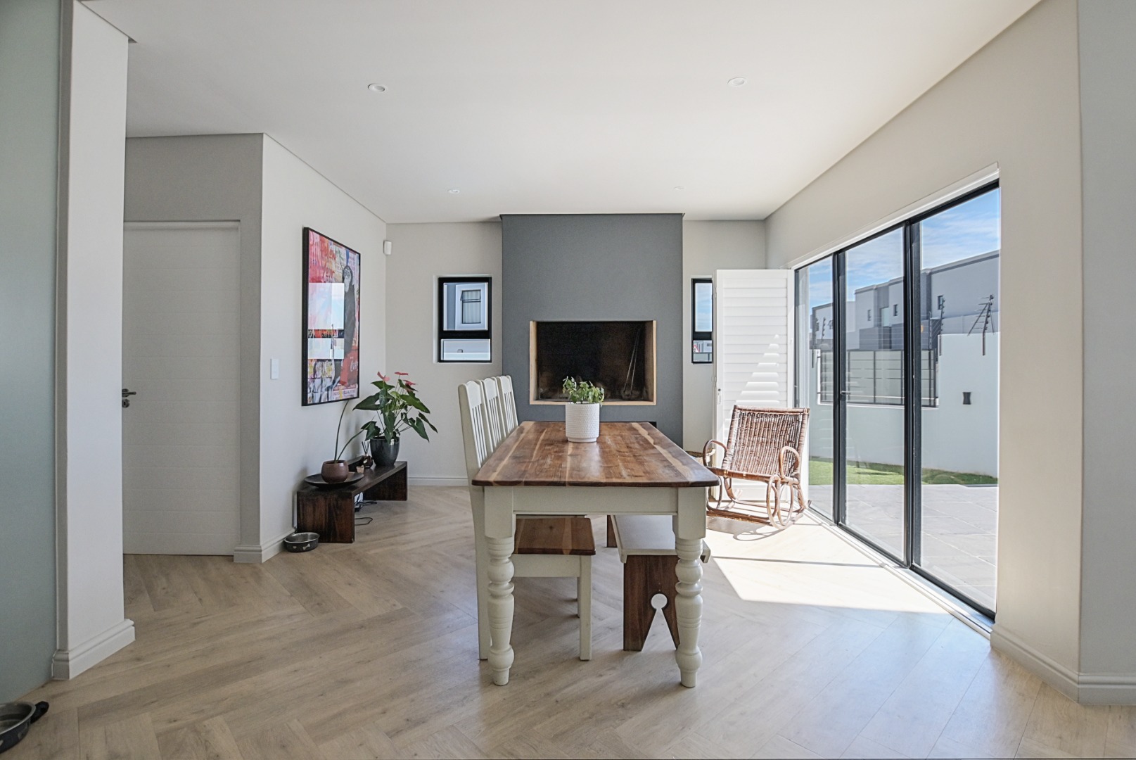 The dining area flows seamlessly from the kitchen and lounge and features a large built-in open braai or fireplace, ideal for warming the entire living space