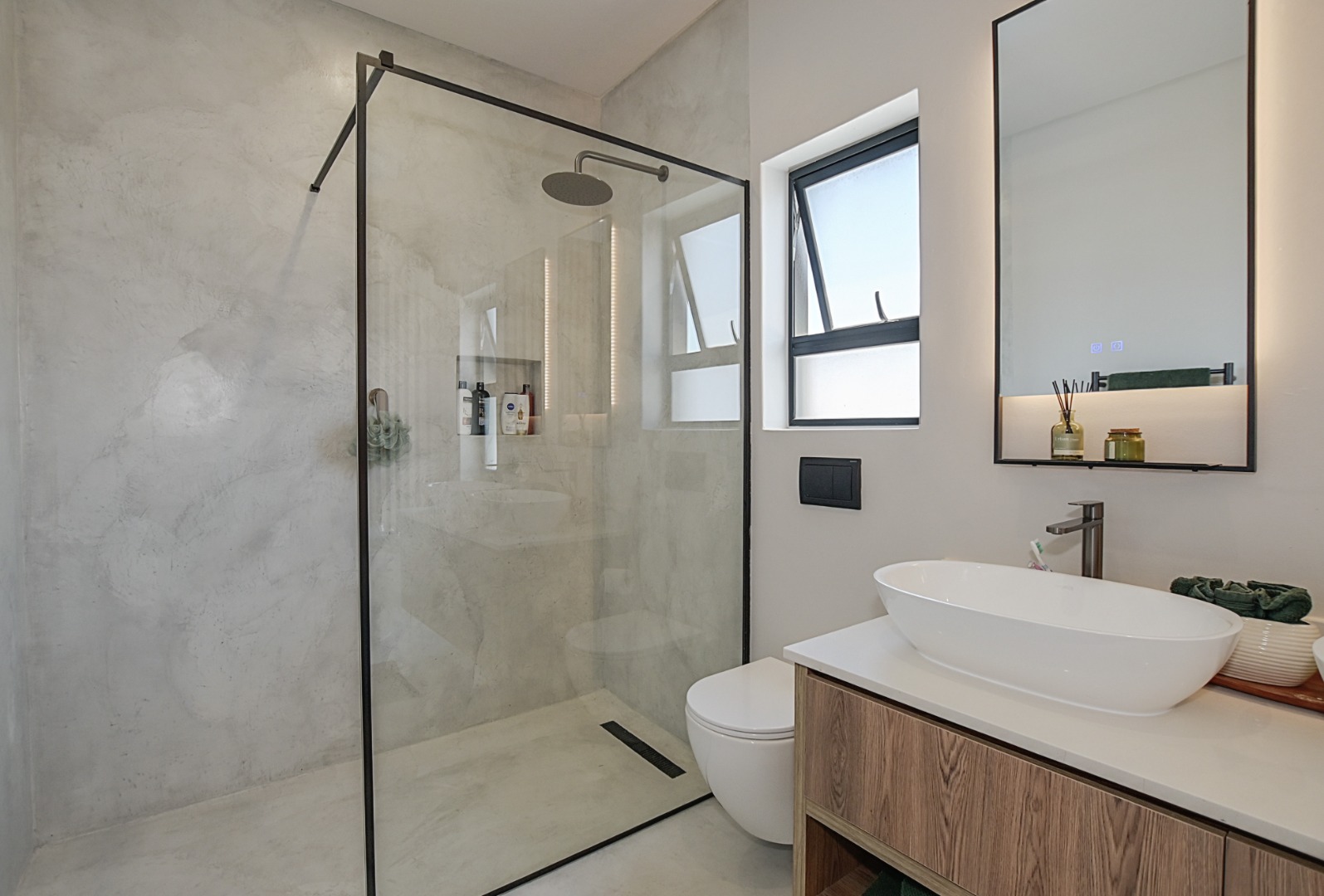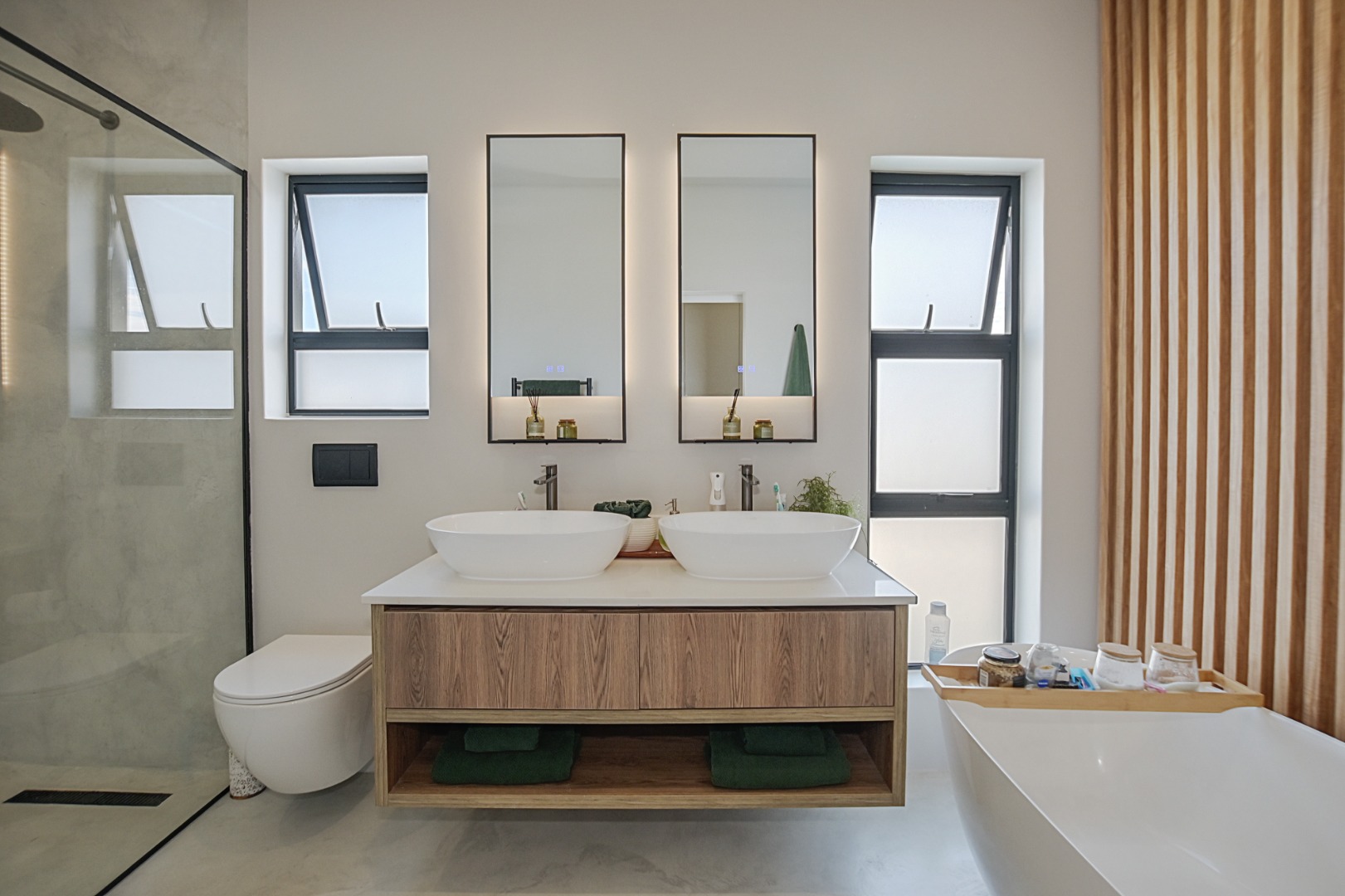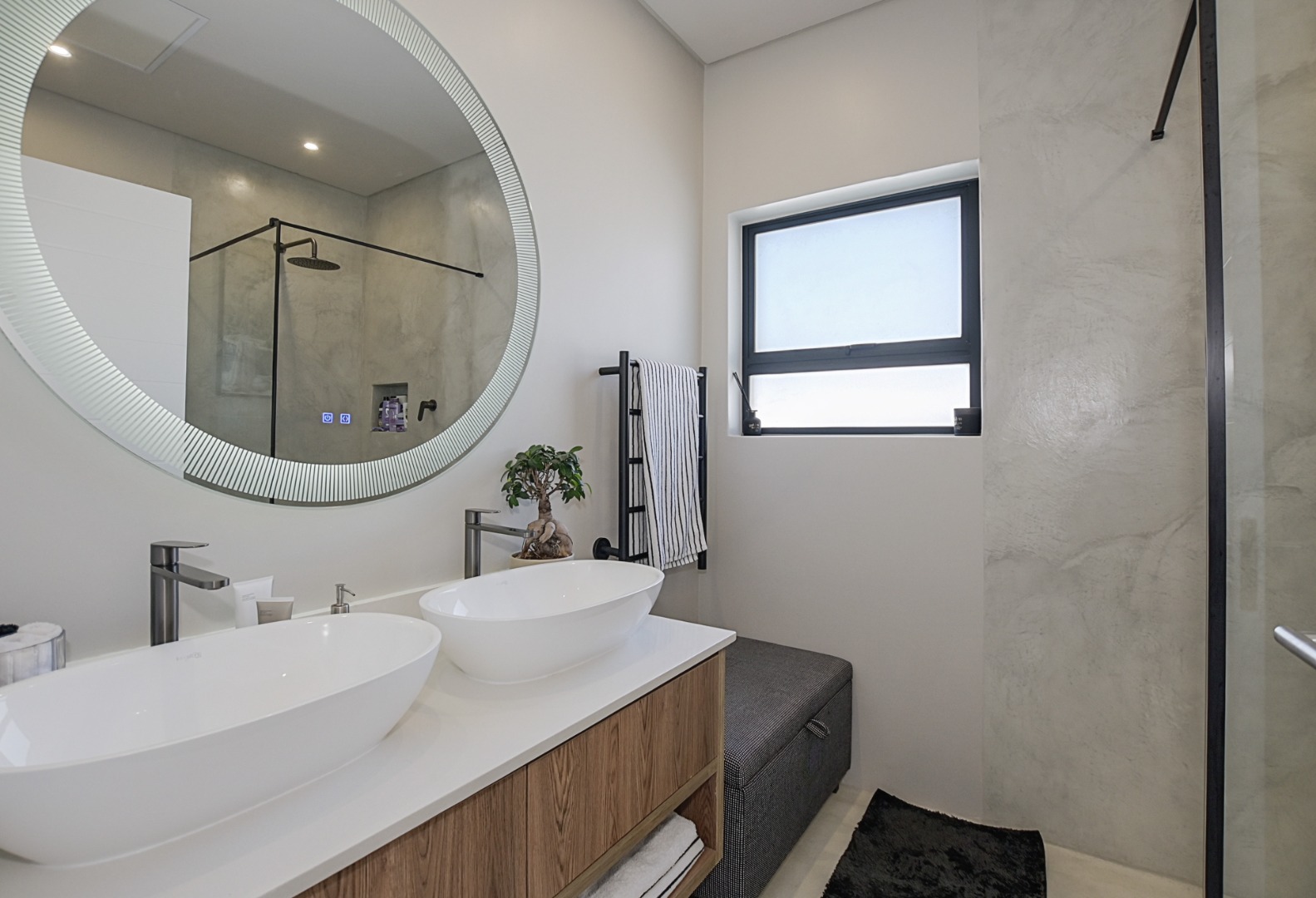 The family bathroom features a double vanity, frameless walk-in shower and toilet.