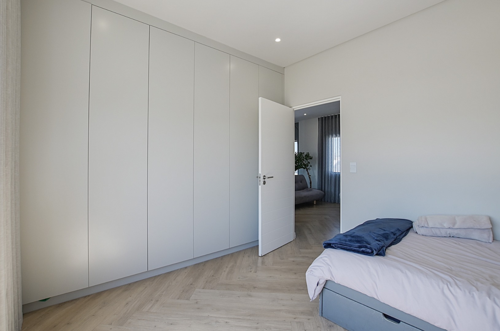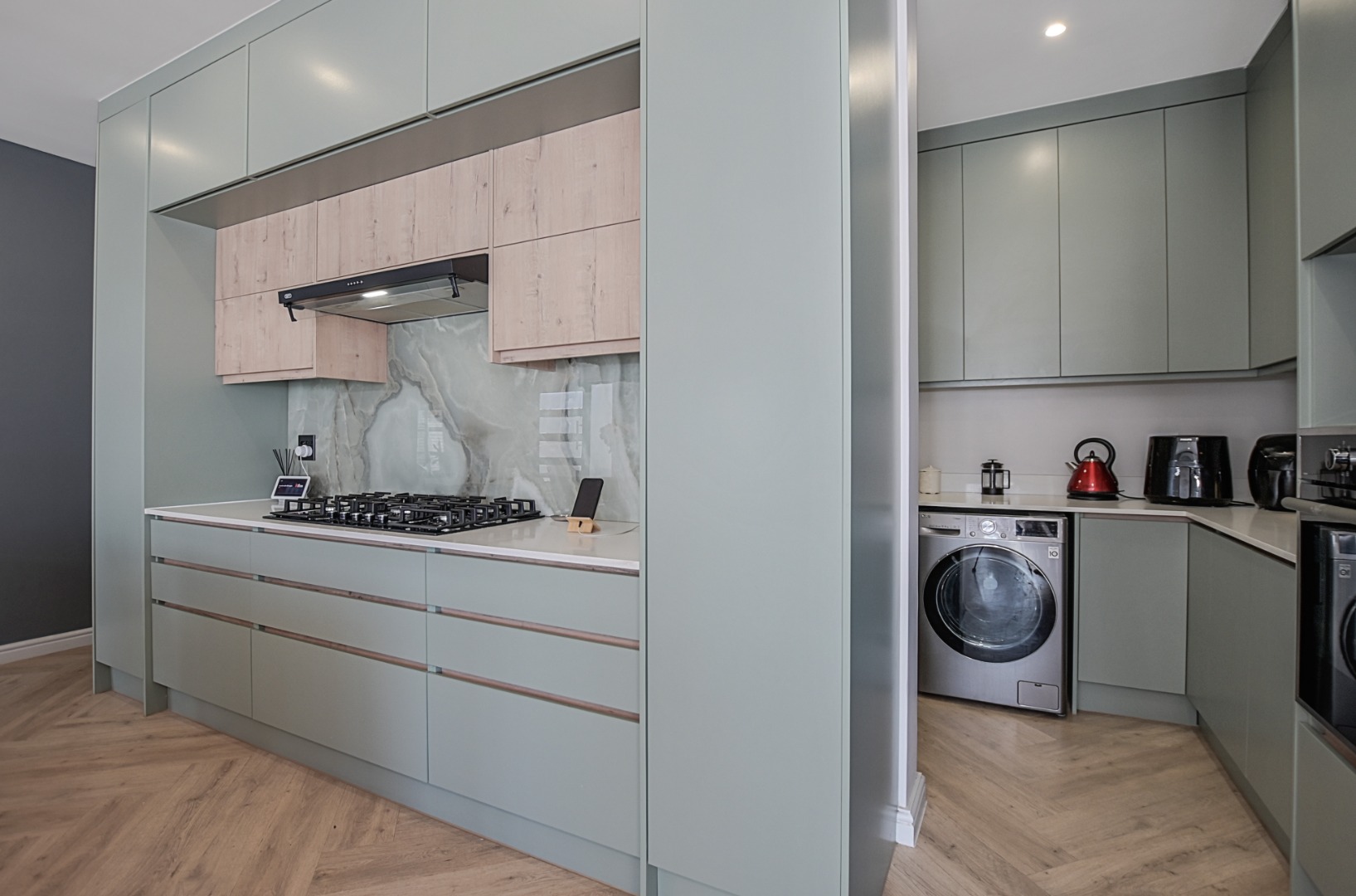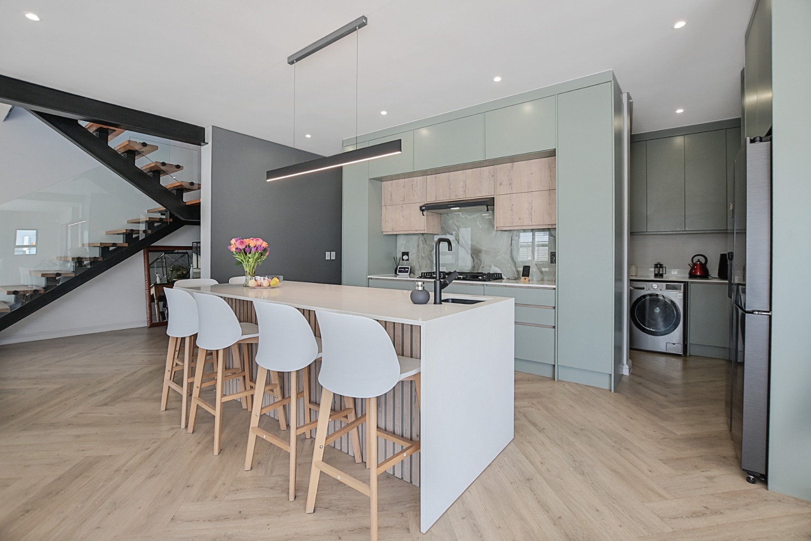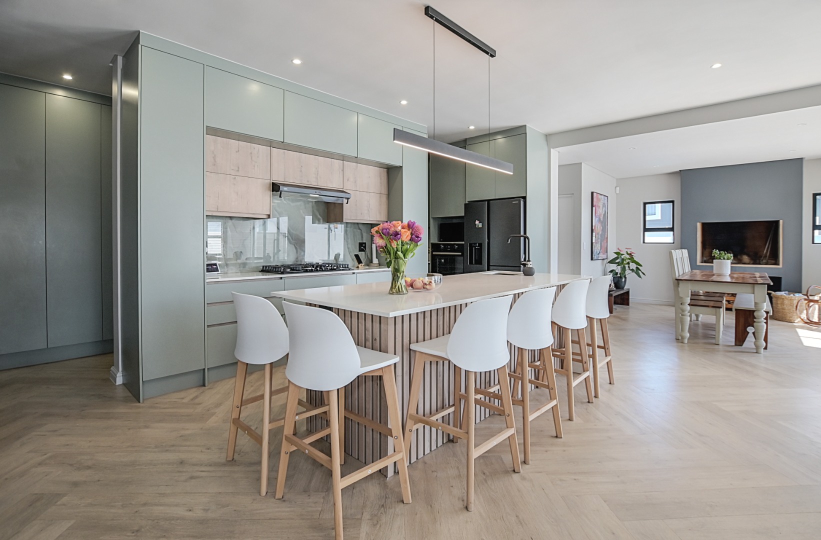 The heart of the home is the stunning open-plan kitchen, beautifully finished with stone countertops and bold, modern tones. Designed with both practicality and style in mind, the kitchen offers ample cupboard space and drawers, a large central island with prep bowl and seating for family or guests, a fitted gas hob with extractor fan, and an eye-level oven with space for an integrated microwave and double-door fridge. The separate scullery is neatly tucked away and provides ample additional cupboard space as well as plumbing for a dishwasher, washing machine and space for a tumble dryer.
