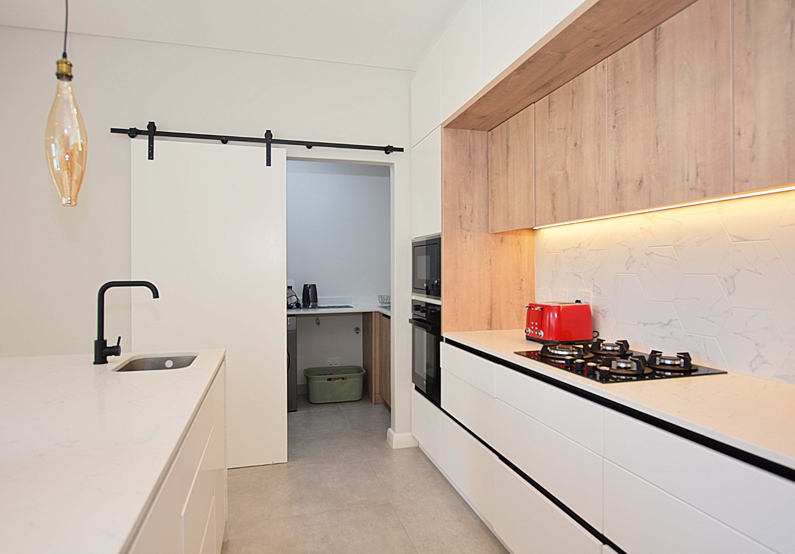 This double storey home offers open plan living areas that flows to the garden. The kitchen is open plan with a centre island and has a seperate scullery. There is a bedroom on the ground floor with a en-suite bathroom , ideal for guests or an office.