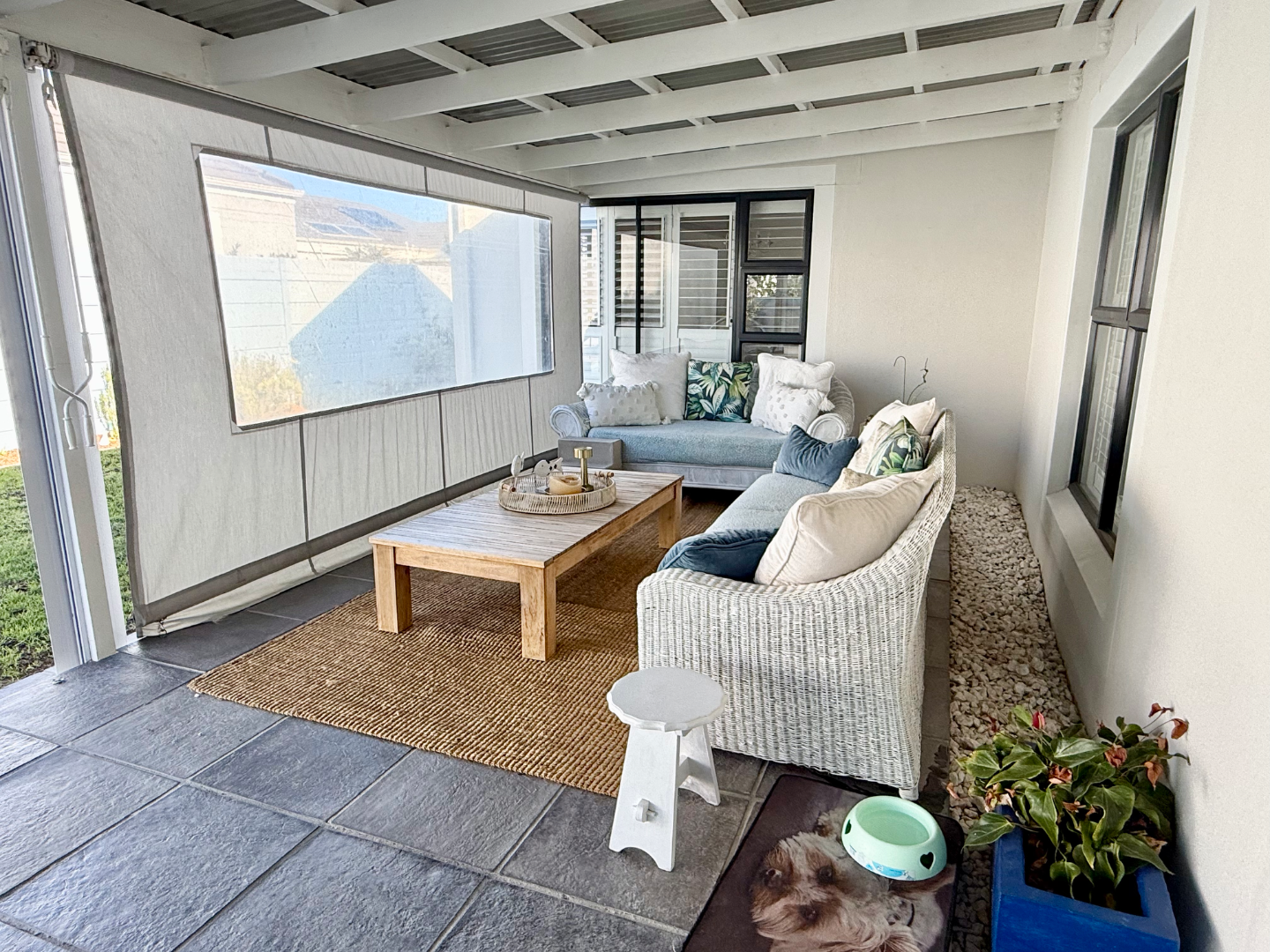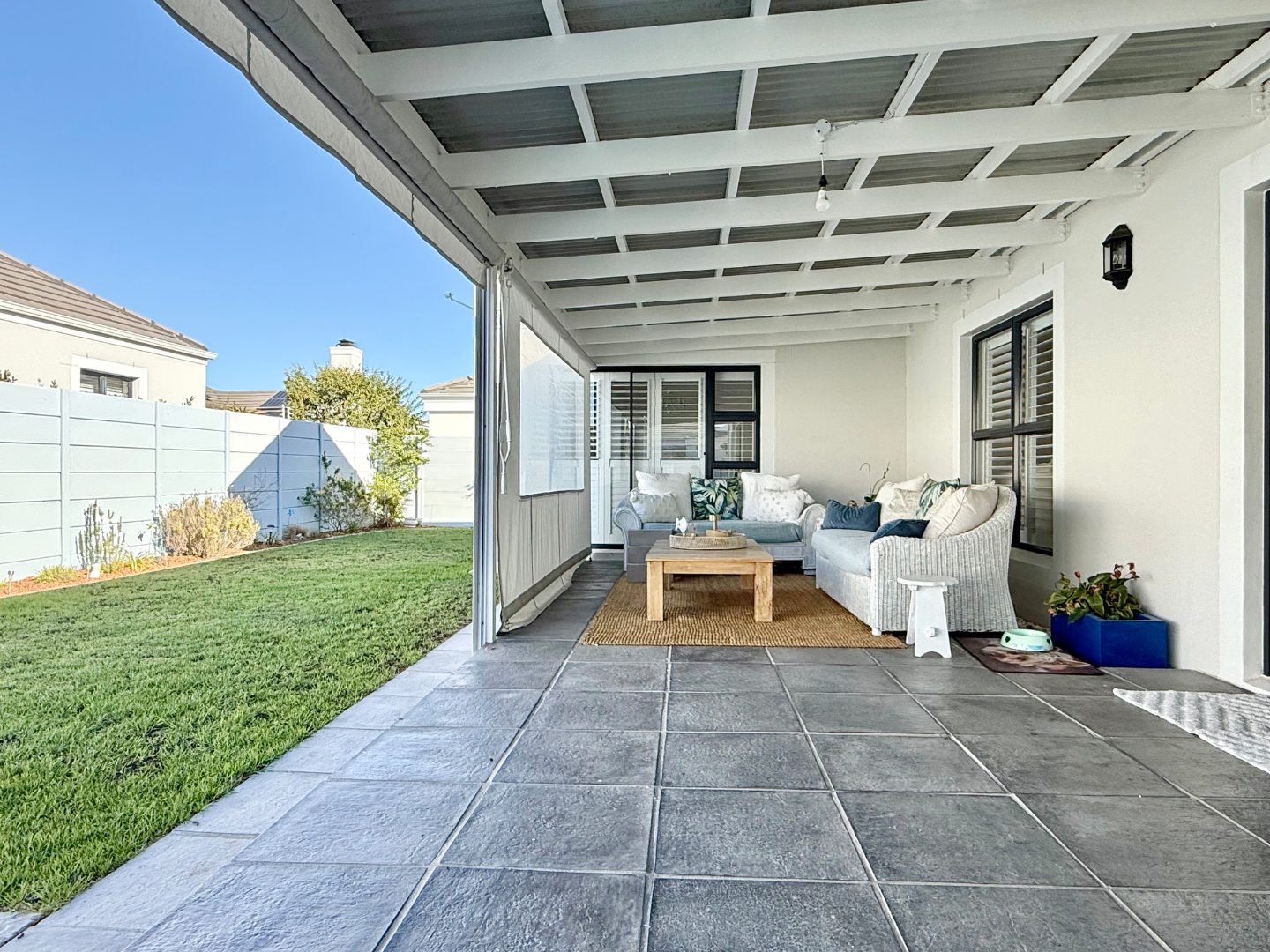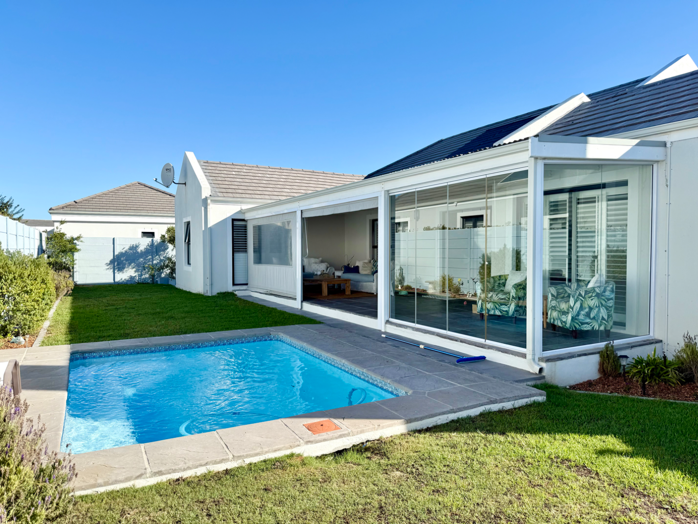 There is a braai room connecting to the living room and both this and the lounge area lead out to an extra large enclosed patio area with glass panels on one side and drop down weather blinds on the other which closes the space up for those rainy winter days. This then flows out to the lush garden with a perfectly positioned splash pool.