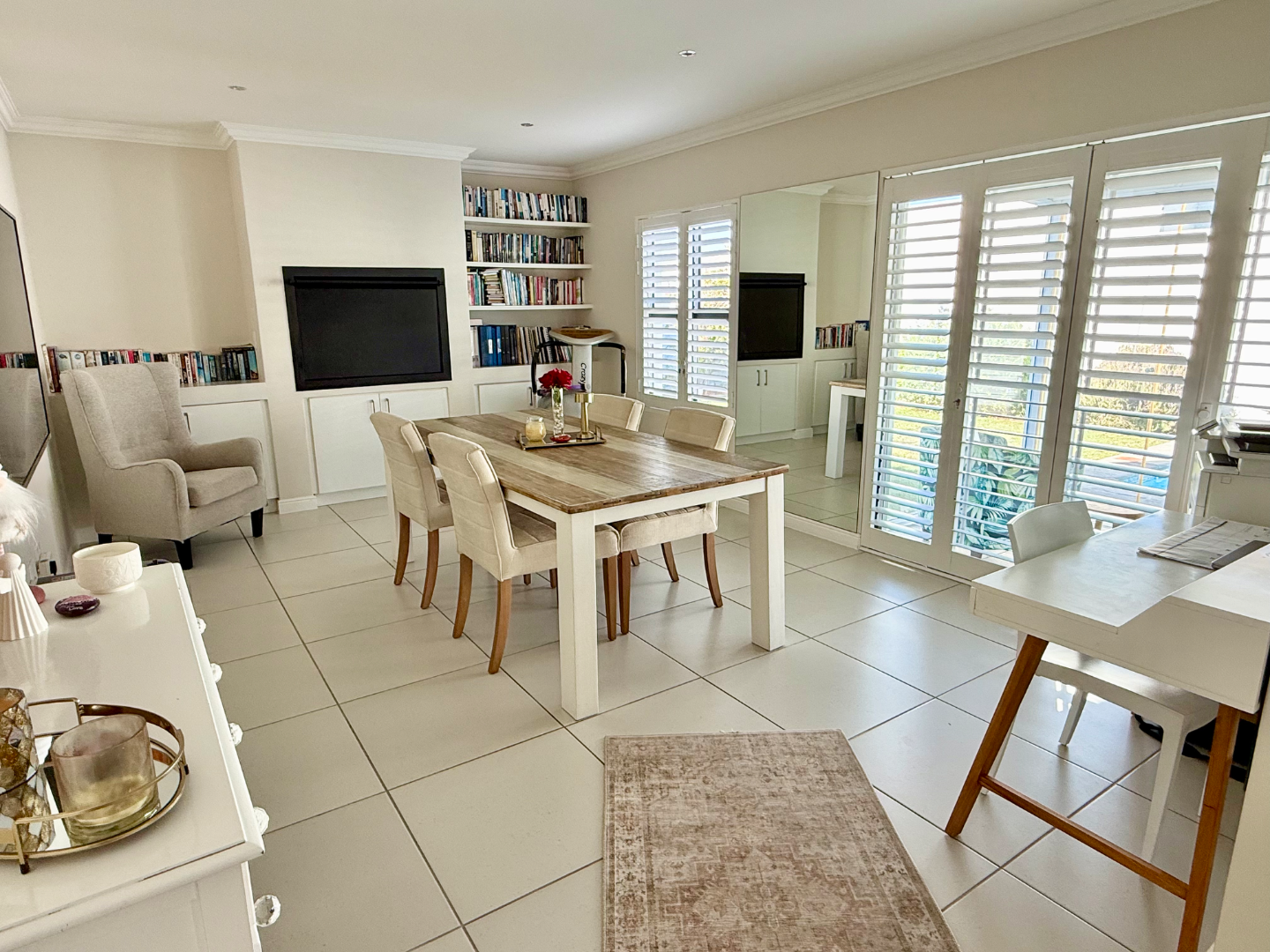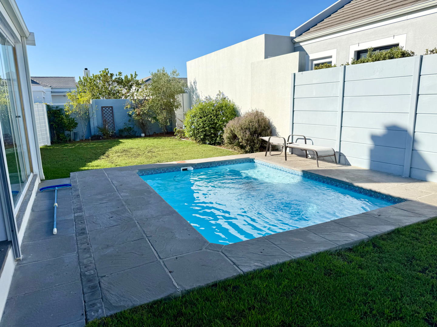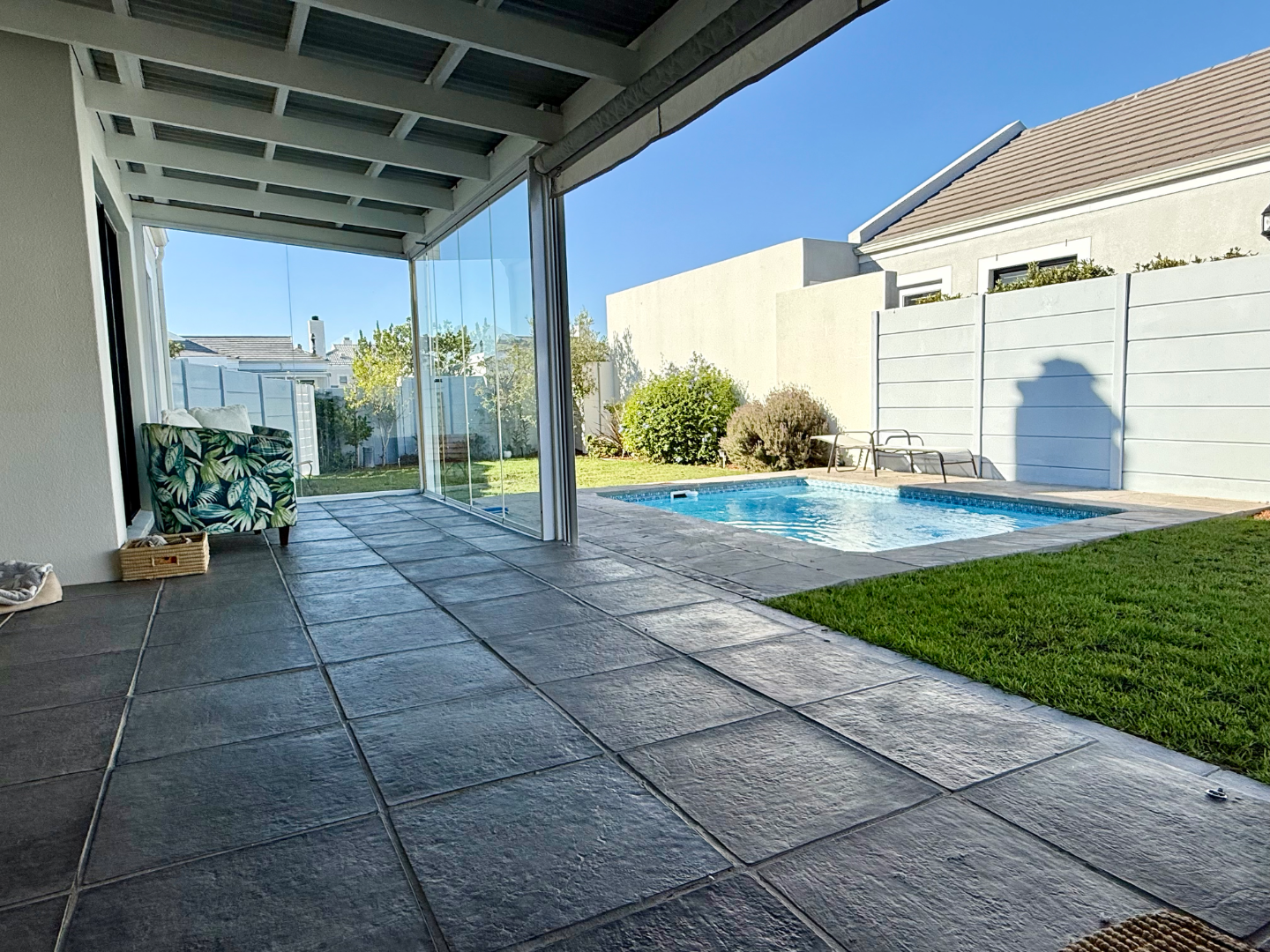 There is a braai room connecting to the living room and both this and the lounge area lead out to an extra large enclosed patio area with glass panels on one side and drop down weather blinds on the other which closes the space up for those rainy winter days. This then flows out to the lush garden with a perfectly positioned splash pool.