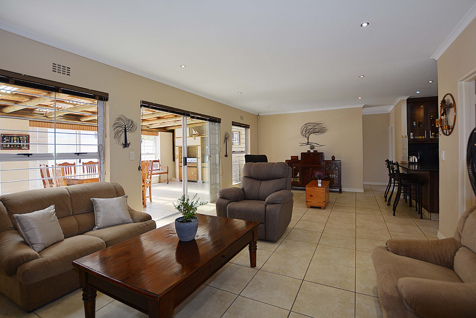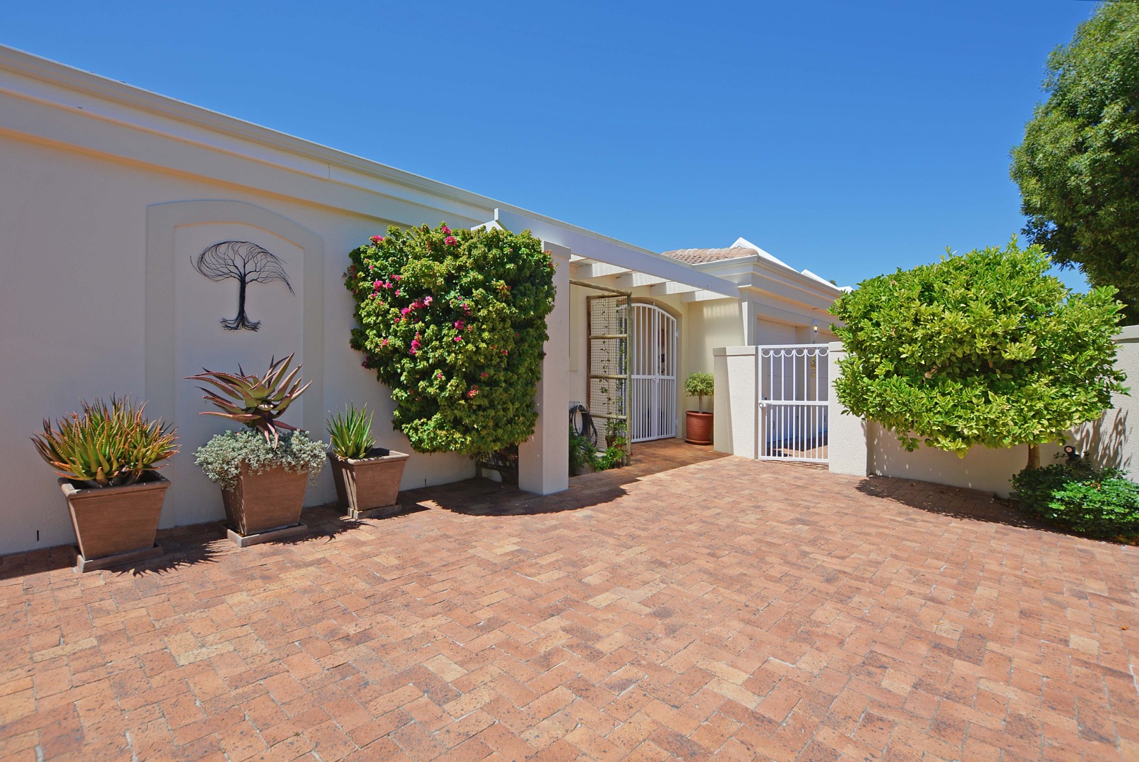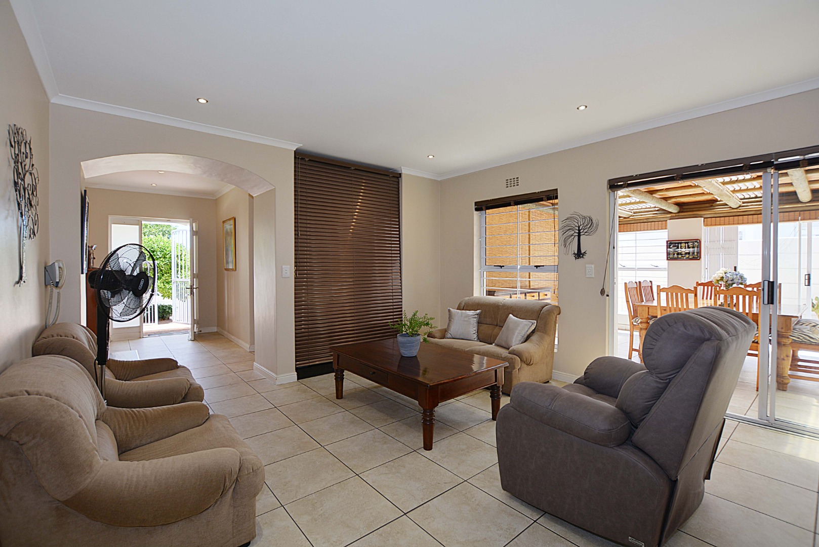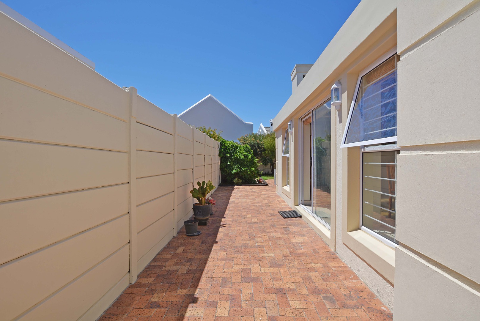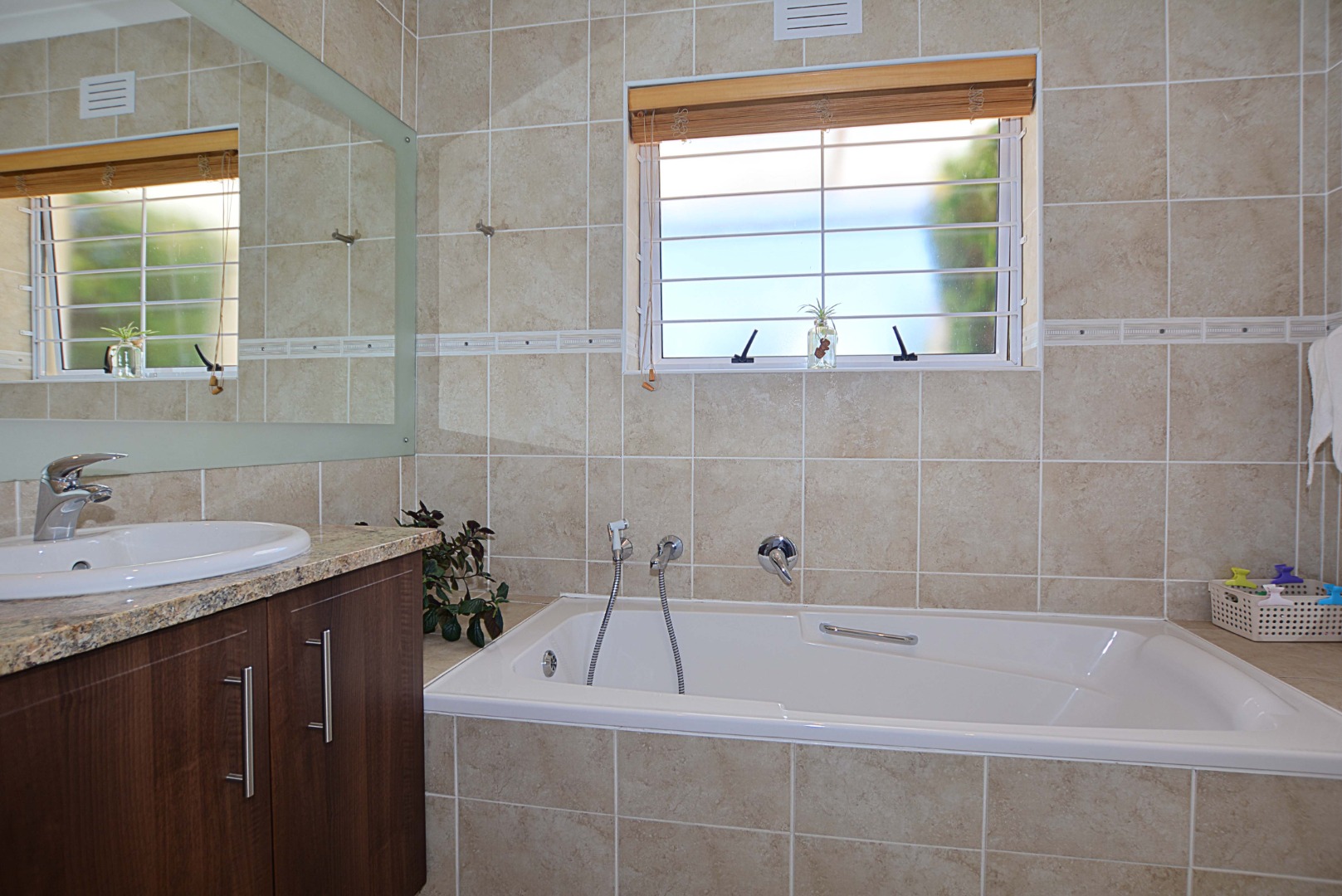 This freehold is situated in the desirable security estate of West-Wood. It is located opposite one of the parks. It offers an inviting entrance hall where the extra-large main bedroom with a full bathroom (double basin, shower, bath) is situated at, by the western side of the house. The automated double garage is tiled with lots of extra cupboards. There is an open plan lounge/dining room and well-equipped kitchen with gas hob, electric oven, extractor fan, two water points, ample cupboards. The kitchen also leads out to a drying area at the southern side. Furthermore, it has a braai room opening up at the northern side to the garden area, with a separate gas braai. It also has a well sized study with ample bics, two large tiled bedrooms at the other end of the house. Additionally, there is also a full family bathroom, an inverter, lots of bics, a linen cupboard, excellent security, a manicured garden and there is space at the front of the house for extra cars. It is close to the MyCiTi bus route and all amenities.