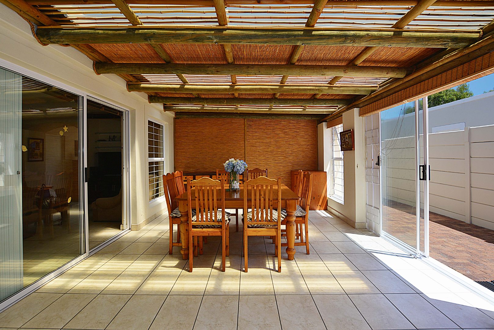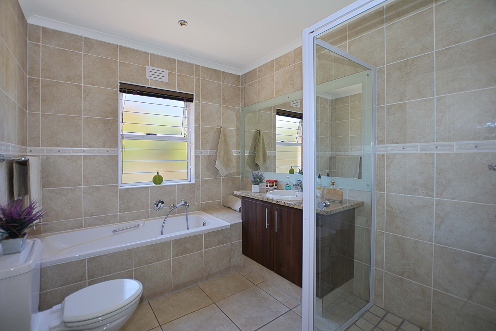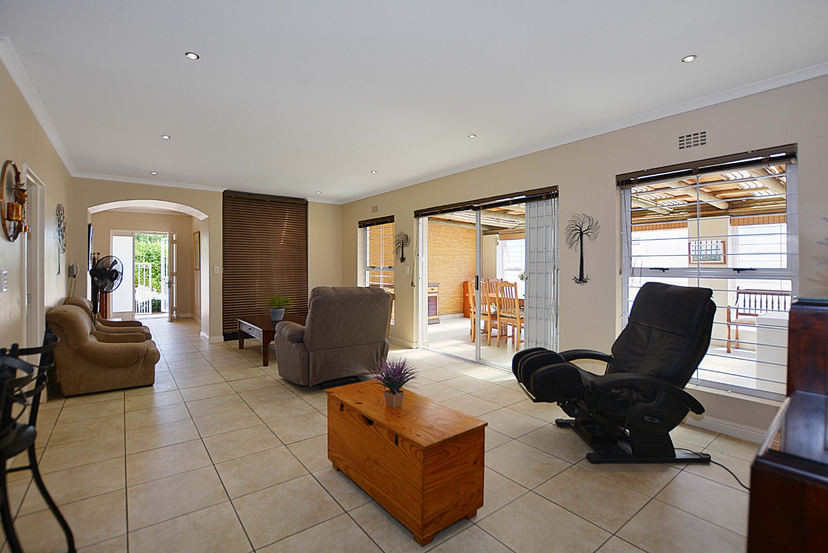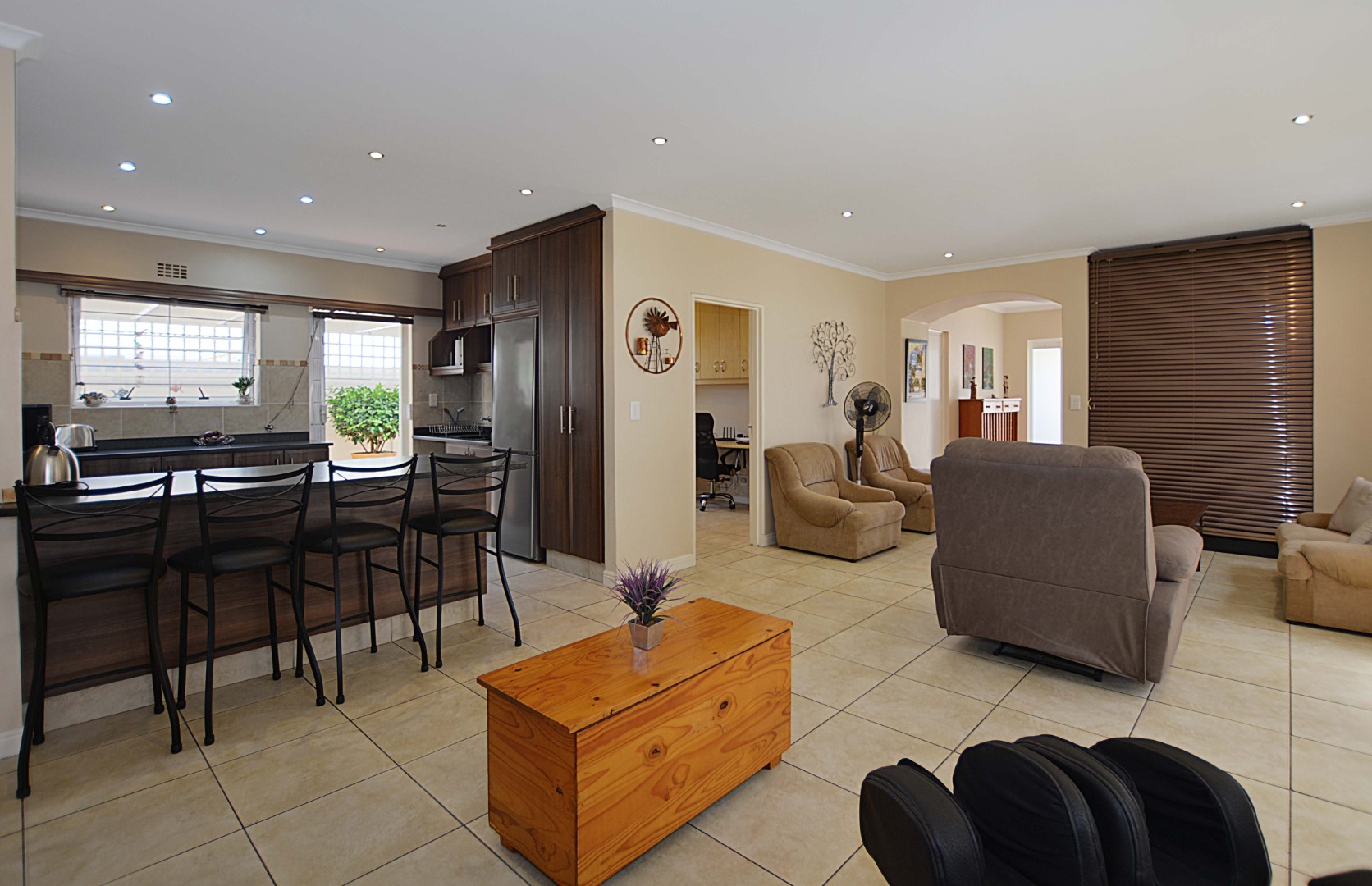 This freehold is situated in the desirable security estate of West-Wood. It is located opposite one of the parks. It offers an inviting entrance hall where the extra-large main bedroom with a full bathroom (double basin, shower, bath) is situated at, by the western side of the house. The automated double garage is tiled with lots of extra cupboards. There is an open plan lounge/dining room and well-equipped kitchen with gas hob, electric oven, extractor fan, two water points, ample cupboards. The kitchen also leads out to a drying area at the southern side. Furthermore, it has a braai room opening up at the northern side to the garden area, with a separate gas braai. It also has a well sized study with ample bics, two large tiled bedrooms at the other end of the house. Additionally, there is also a full family bathroom, an inverter, lots of bics, a linen cupboard, excellent security, a manicured garden and there is space at the front of the house for extra cars. It is close to the MyCiTi bus route and all amenities.