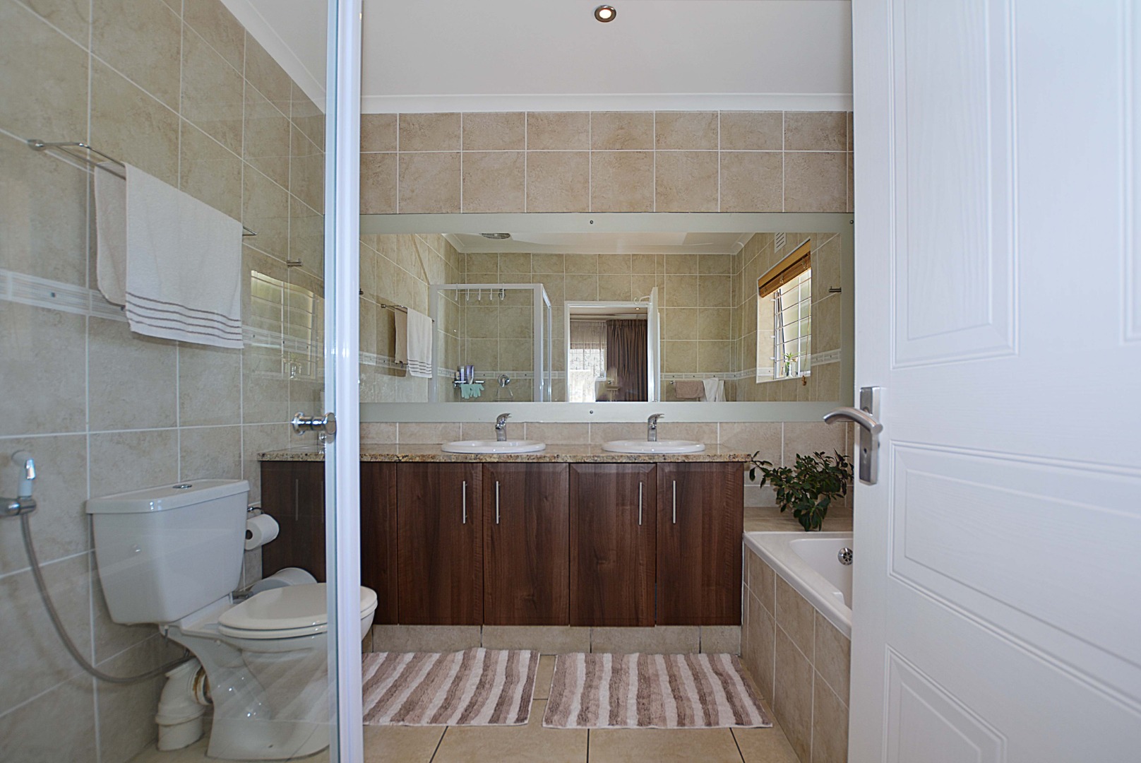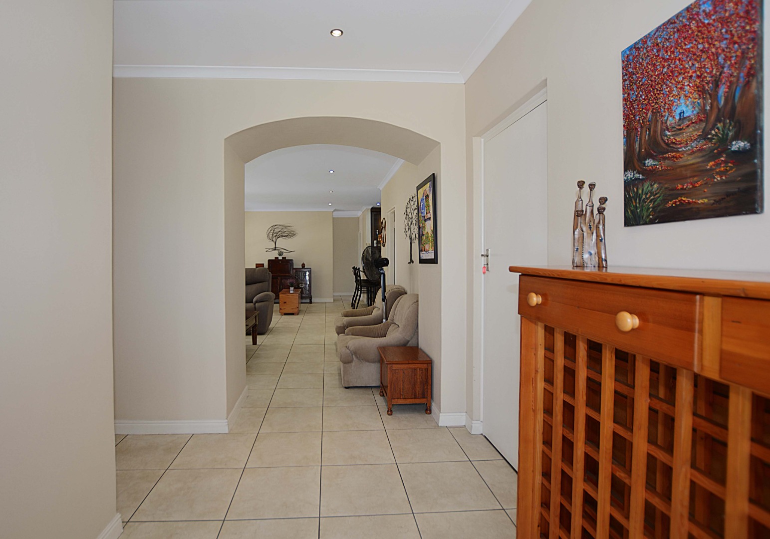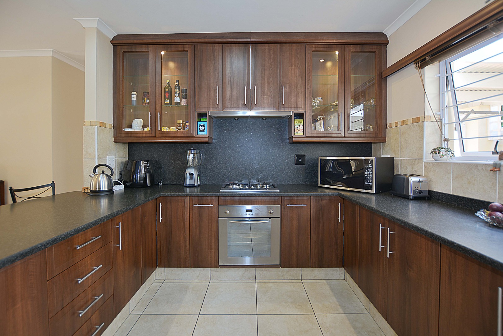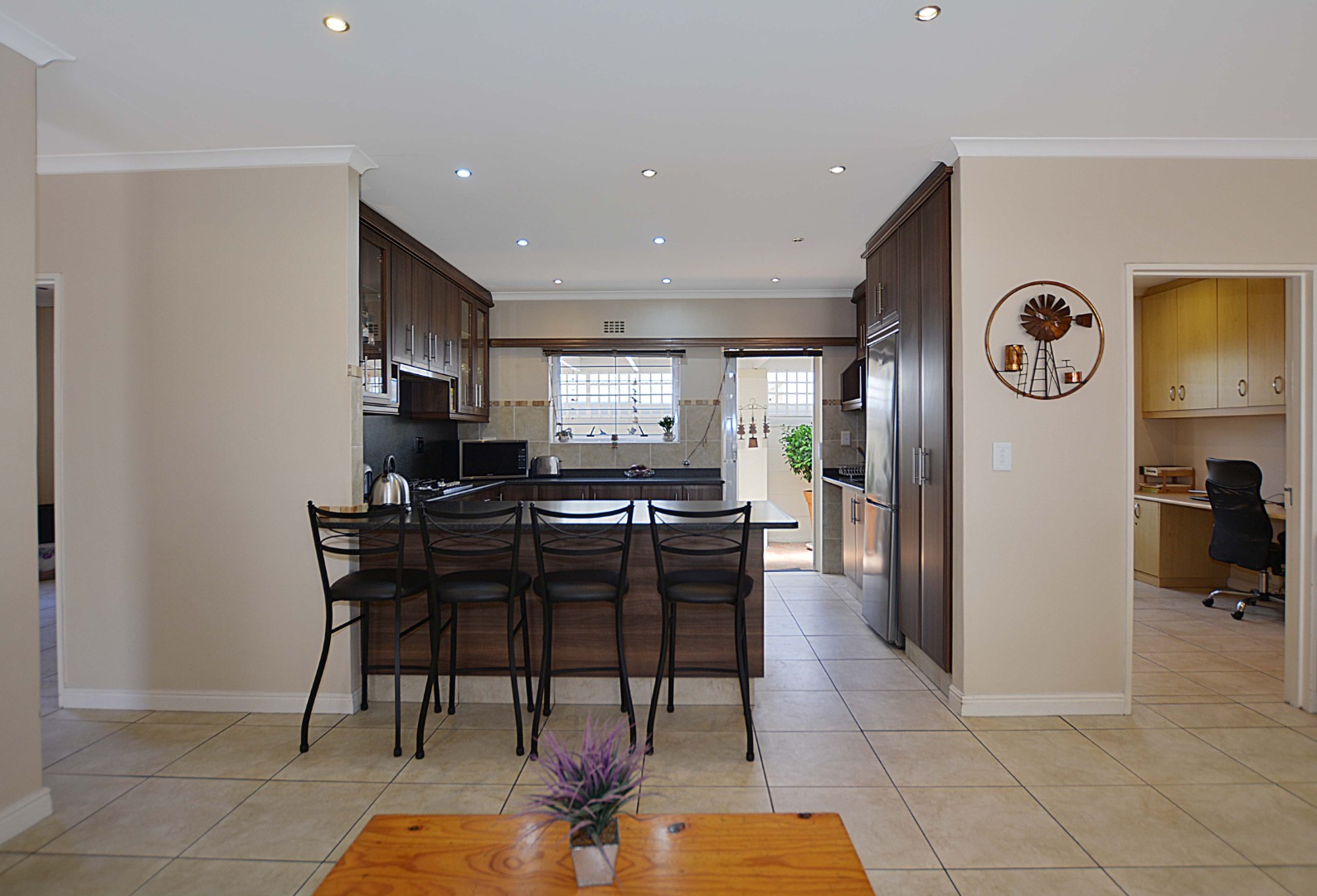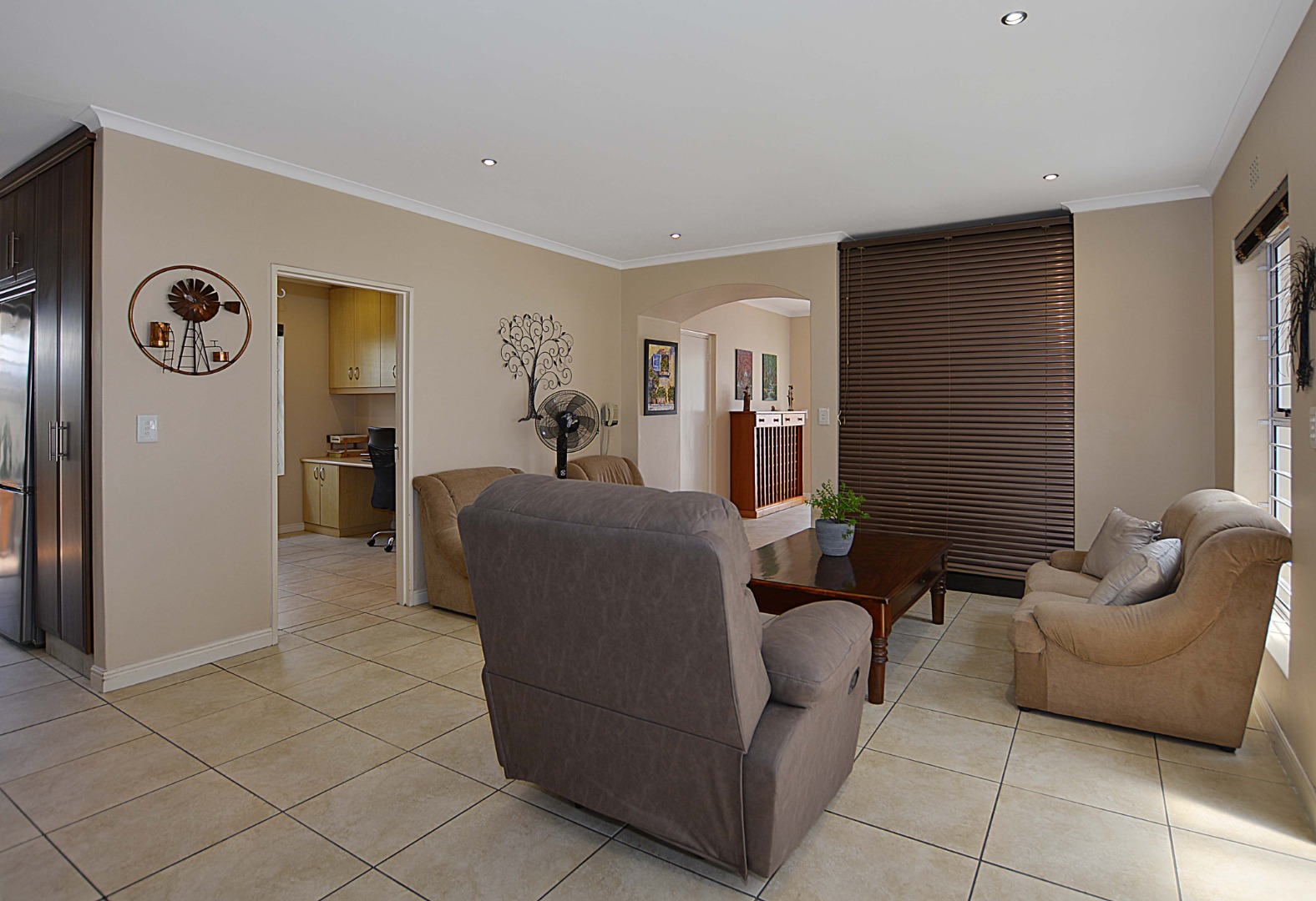 This freehold is situated in the desirable security estate of West-Wood. It is located opposite one of the parks. It offers an inviting entrance hall where the extra-large main bedroom with a full bathroom (double basin, shower, bath) is situated at, by the western side of the house. The automated double garage is tiled with lots of extra cupboards. There is an open plan lounge/dining room and well-equipped kitchen with gas hob, electric oven, extractor fan, two water points, ample cupboards. The kitchen also leads out to a drying area at the southern side. Furthermore, it has a braai room opening up at the northern side to the garden area, with a separate gas braai. It also has a well sized study with ample bics, two large tiled bedrooms at the other end of the house. Additionally, there is also a full family bathroom, an inverter, lots of bics, a linen cupboard, excellent security, a manicured garden and there is space at the front of the house for extra cars. It is close to the MyCiTi bus route and all amenities.