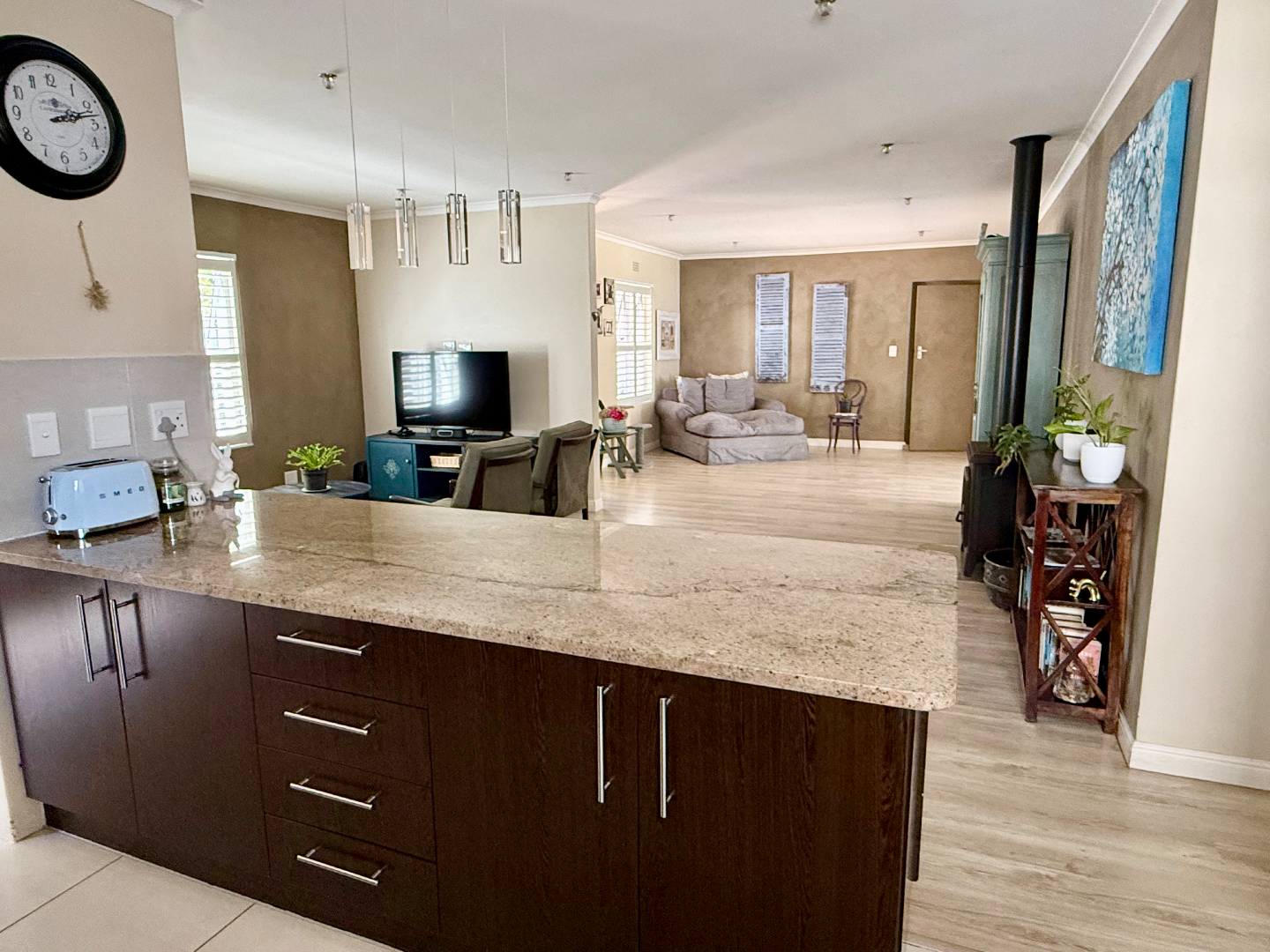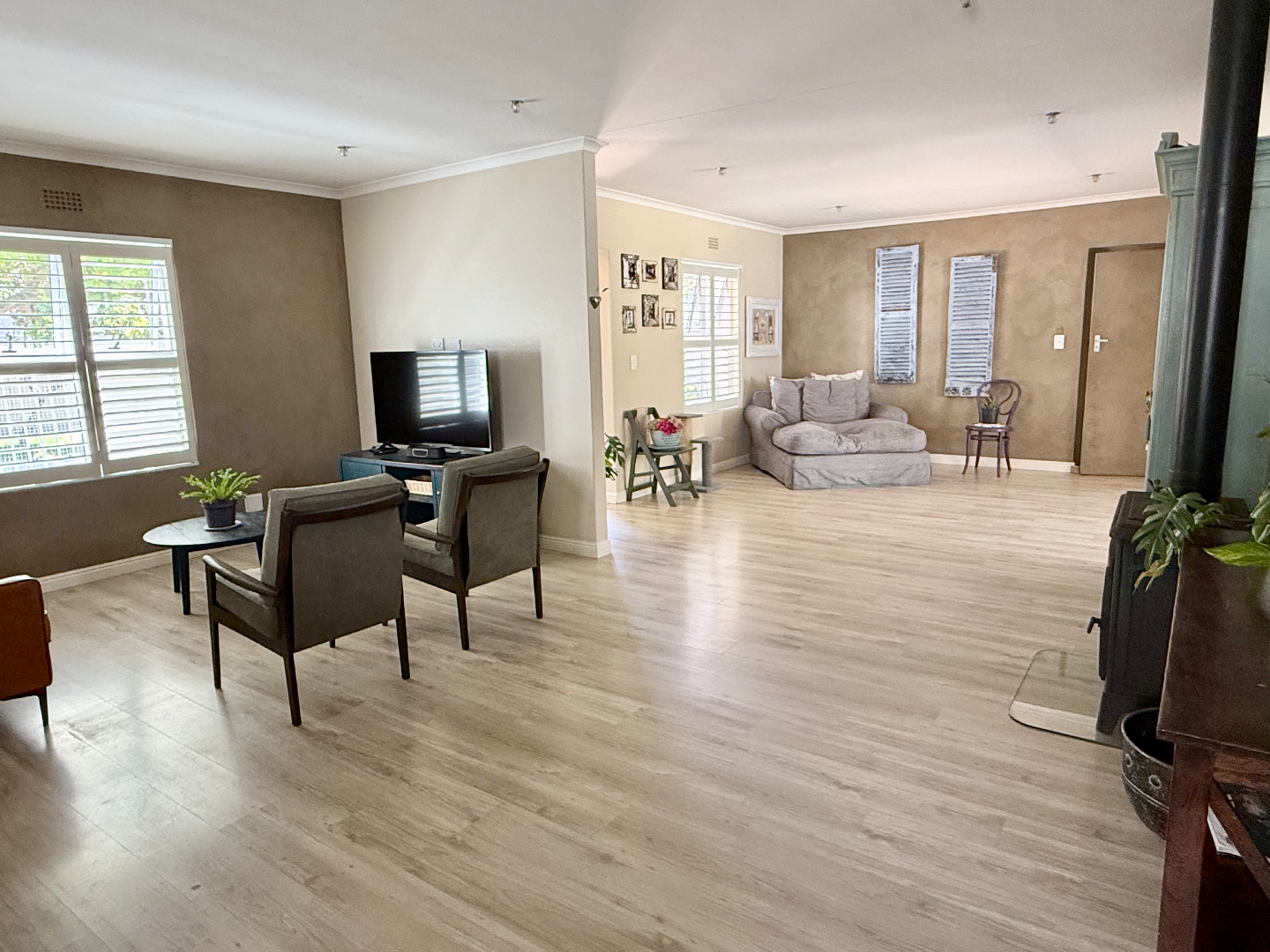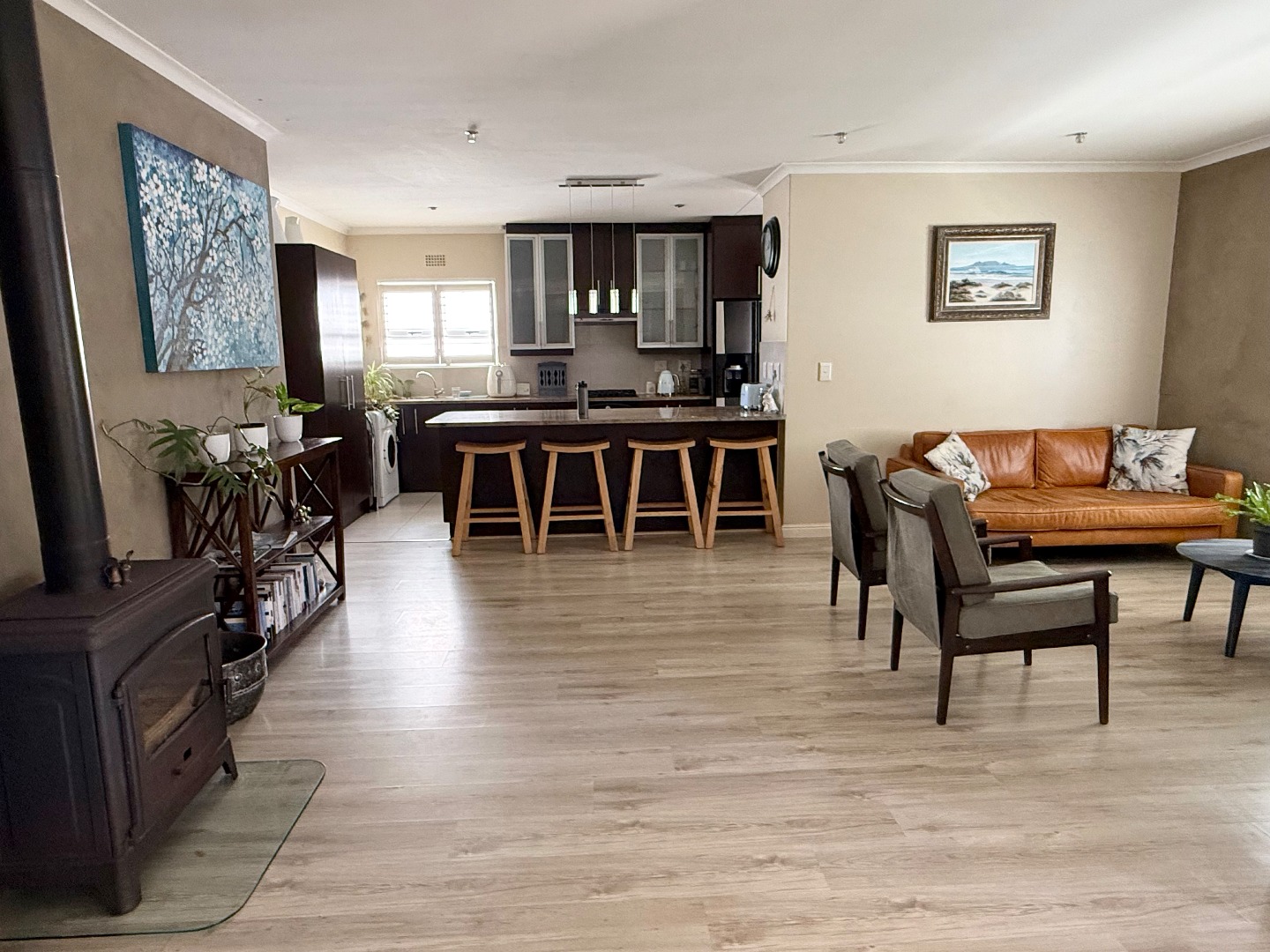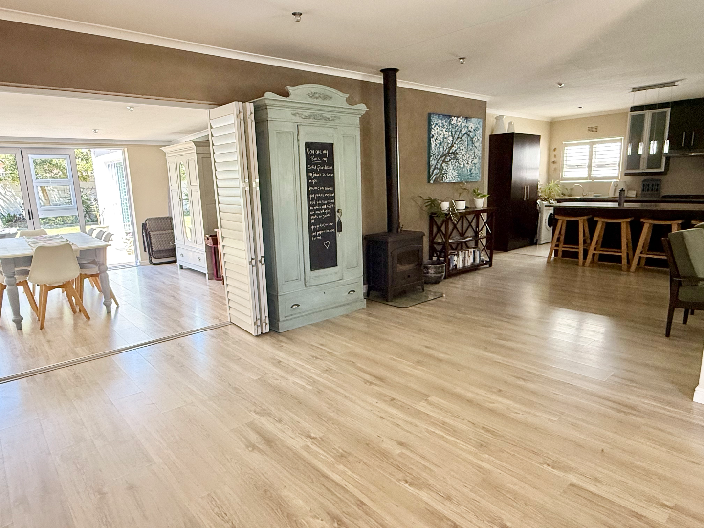 The interior boasts modern wood-look flooring that flows seamlessly through the spacious open-plan living areas. You'll find a cozy lounge featuring a wood-burning fireplace, perfect for those cooler evenings, and plenty of natural light streaming in through windows fitted with stylish white shutters. The kitchen is a real hub, offering a large counter area with bar seating, making it ideal for casual meals or entertaining friends.
