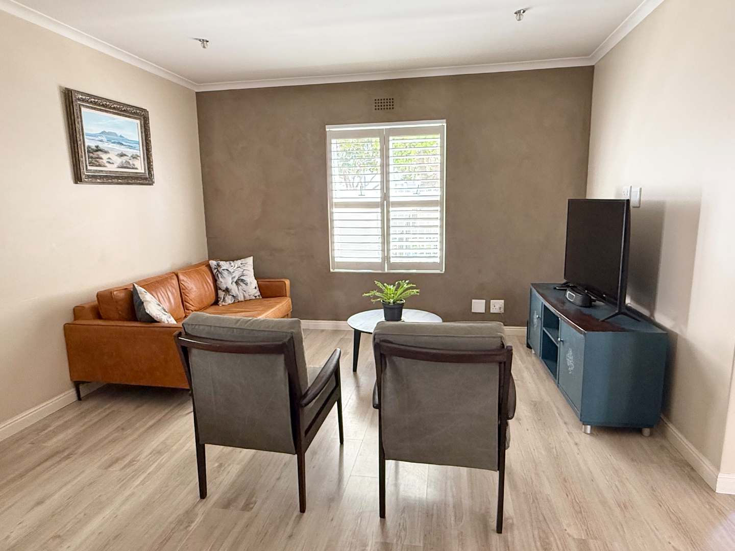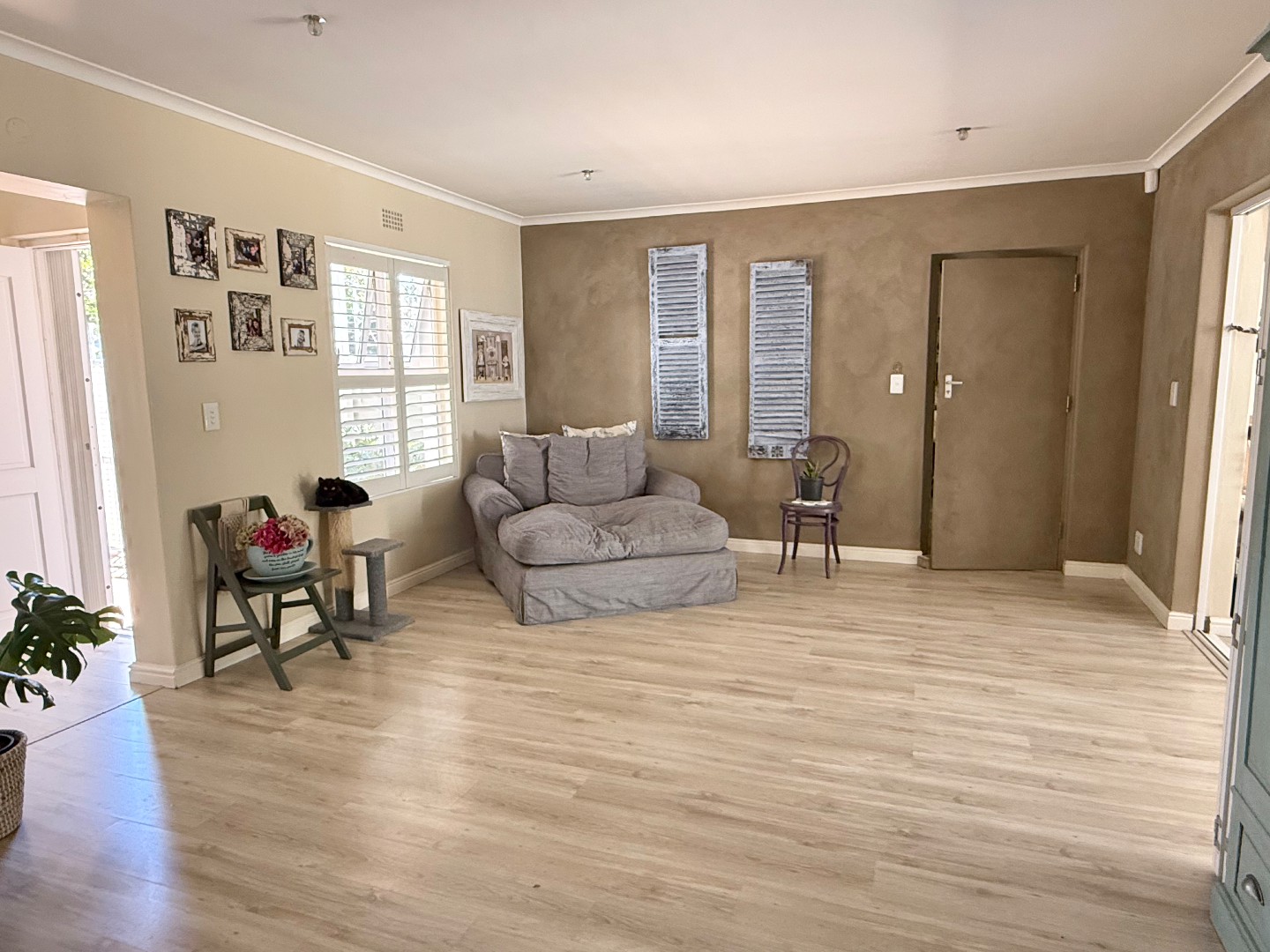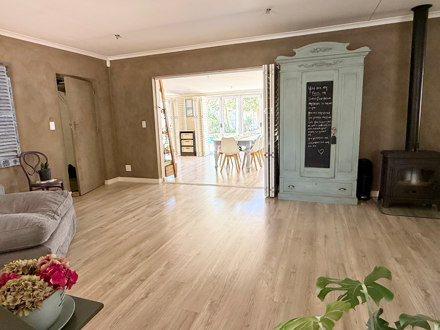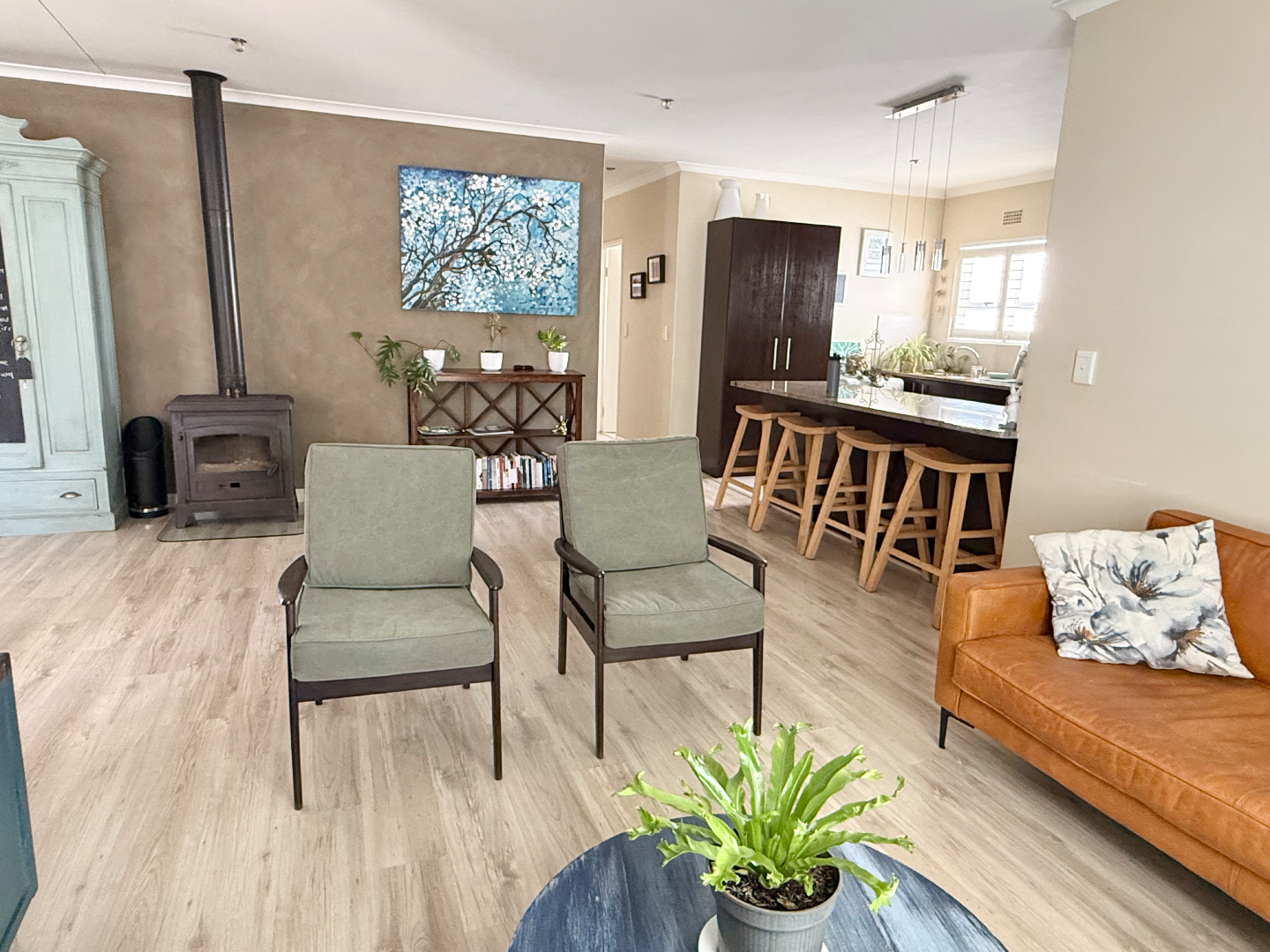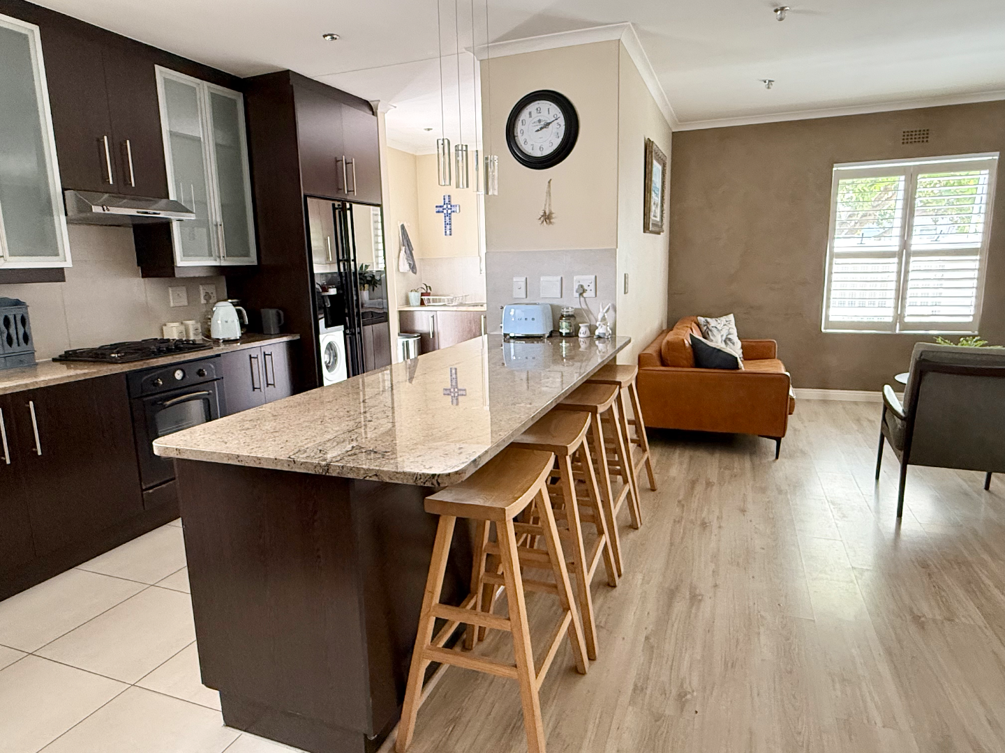The interior boasts modern wood-look flooring that flows seamlessly through the spacious open-plan living areas. You'll find a cozy lounge featuring a wood-burning fireplace, perfect for those cooler evenings, and plenty of natural light streaming in through windows fitted with stylish white shutters. The kitchen is a real hub, offering a large counter area with bar seating, making it ideal for casual meals or entertaining friends.
