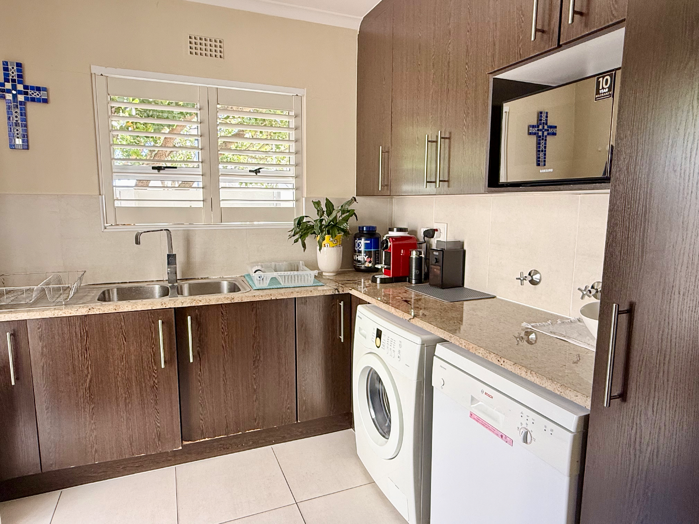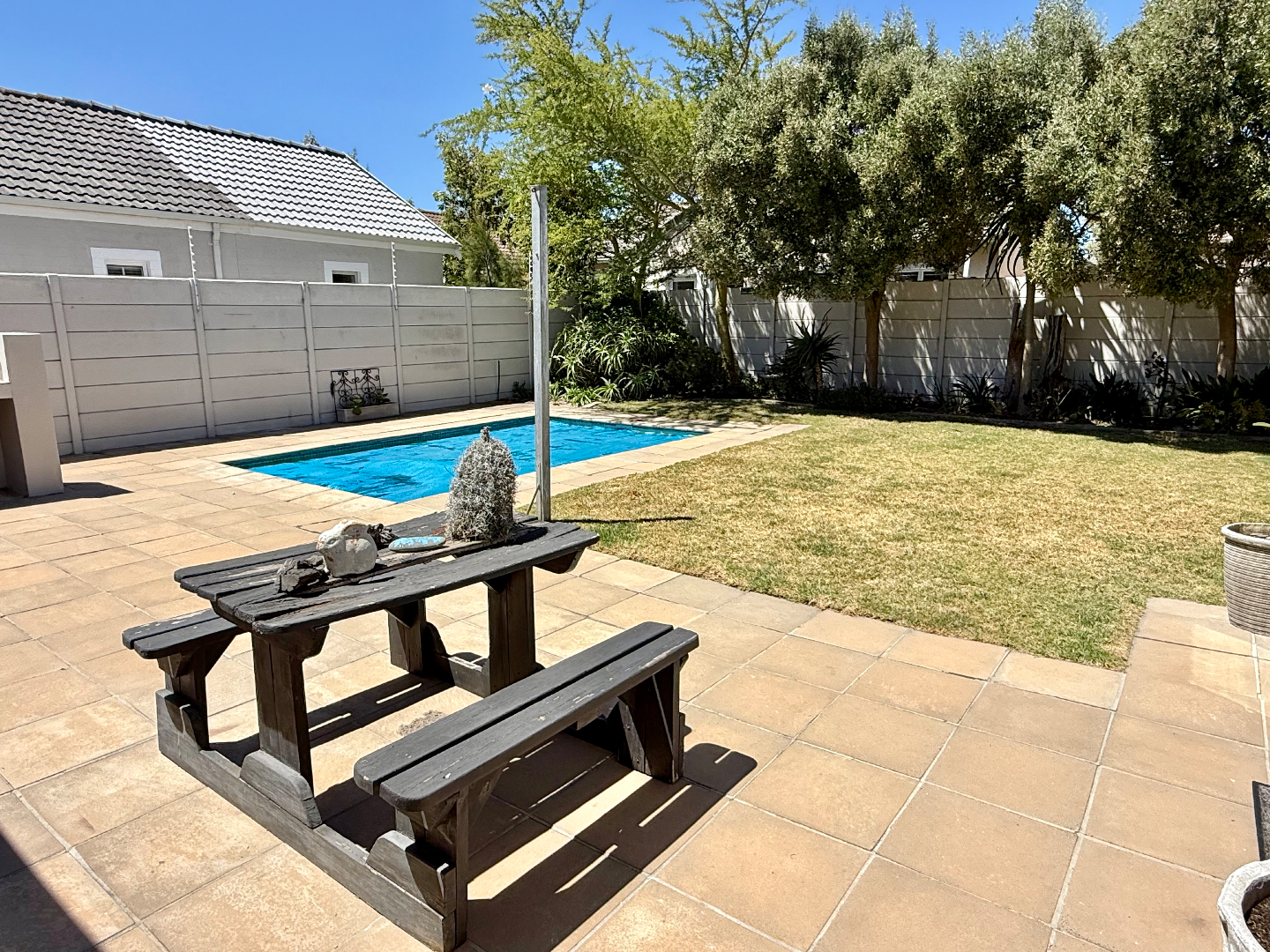 From the moment you arrive, you'll appreciate the neat, single-story facade with its double garage and paved driveway, all secured by a perimeter wall and electrical fencing for your peace of mind.