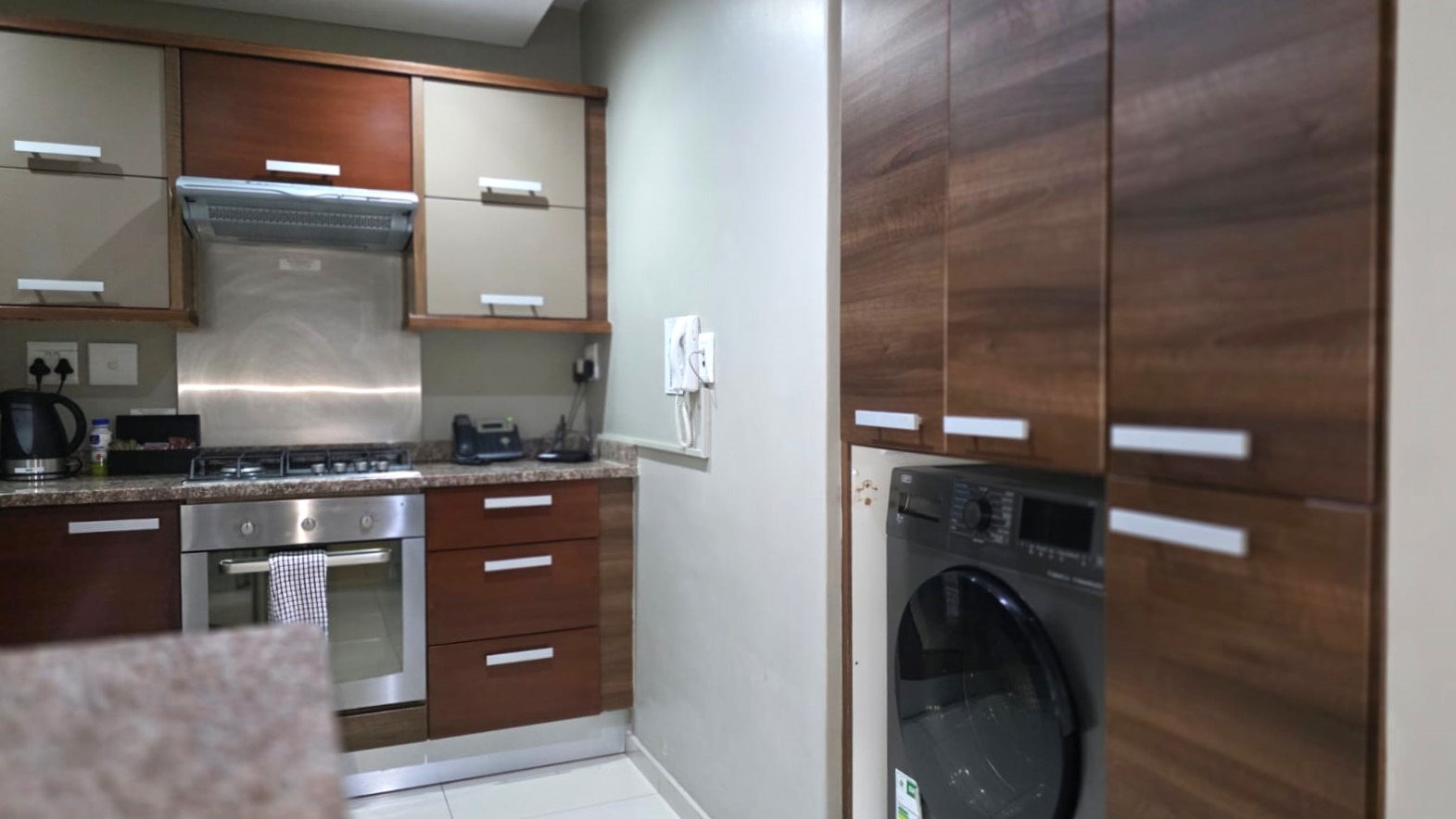 Step inside to an open-plan living and dining area, bathed in natural light from expansive sliding glass doors that lead directly to a private balcony. The modern kitchen boasts two-tone cabinetry, granite-style countertops, and integrated stainless steel appliances, including a built-in oven, gas stovetop, microwave, and a washing machine/dryer, ensuring both style and functionality. The furnished interior presents a clean, contemporary aesthetic.