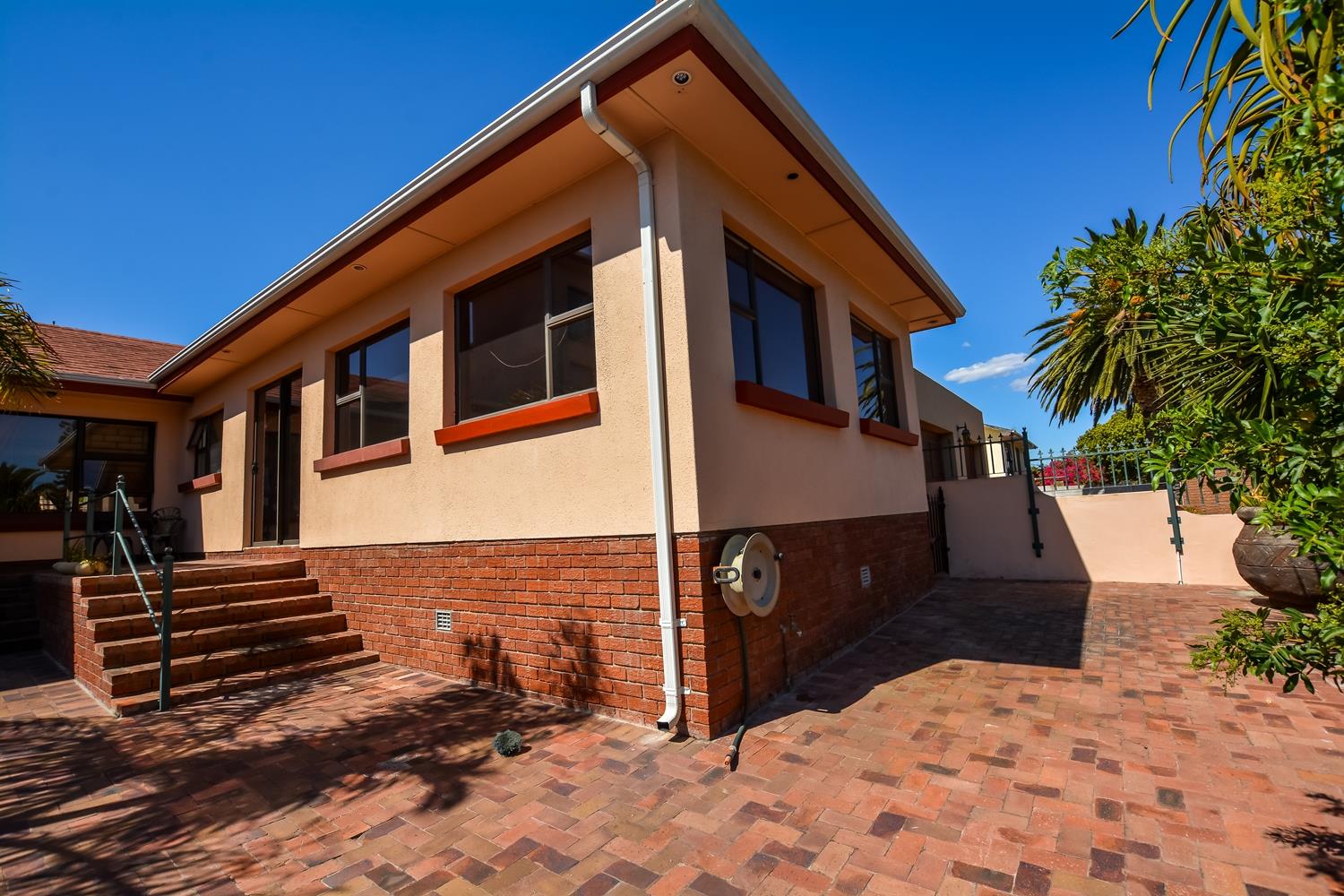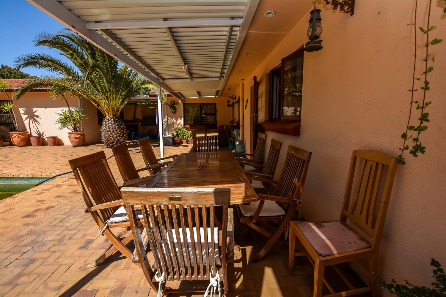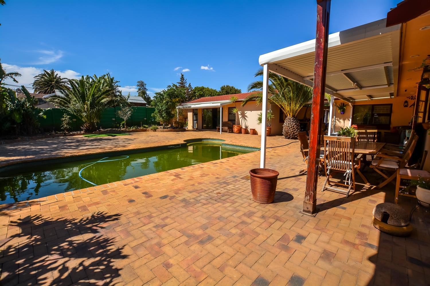 The house is light and spacious with large well-proportioned rooms. The large, open plan tiled lounge and dining area opens out to a paved entertainment area which has a solar heated swimming pool and covered braai area perfect for entertaining and family living.