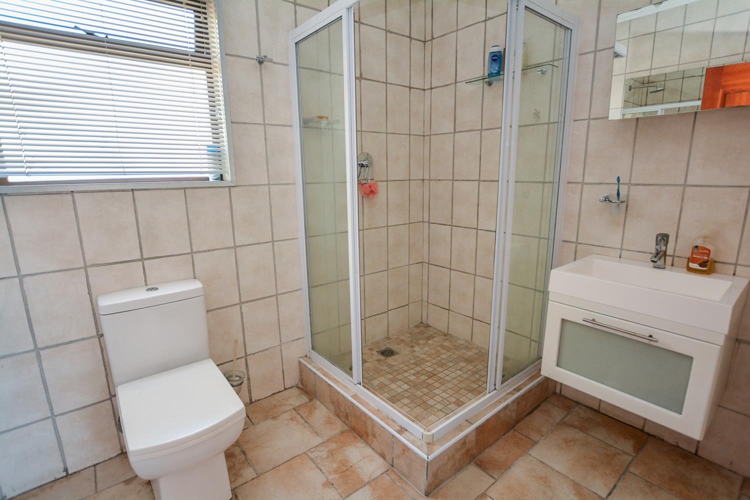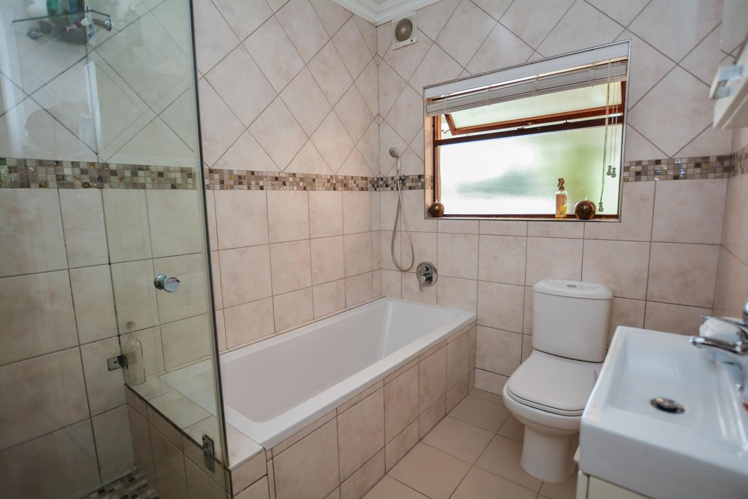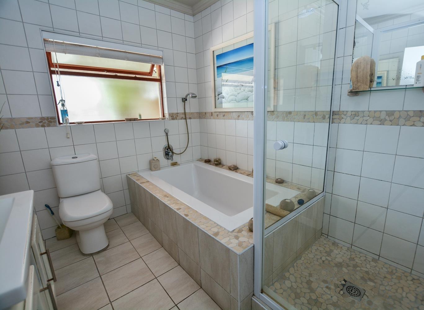 The larger than usual main bedroom has ample built in cupboards. There is a inverter air conditioning unit which provides cold air in summer and heating in winter. It is wired for internet access and DSTV. The well-appointed on-suite bathroom has a free-standing shower, bath, basin and toilet.