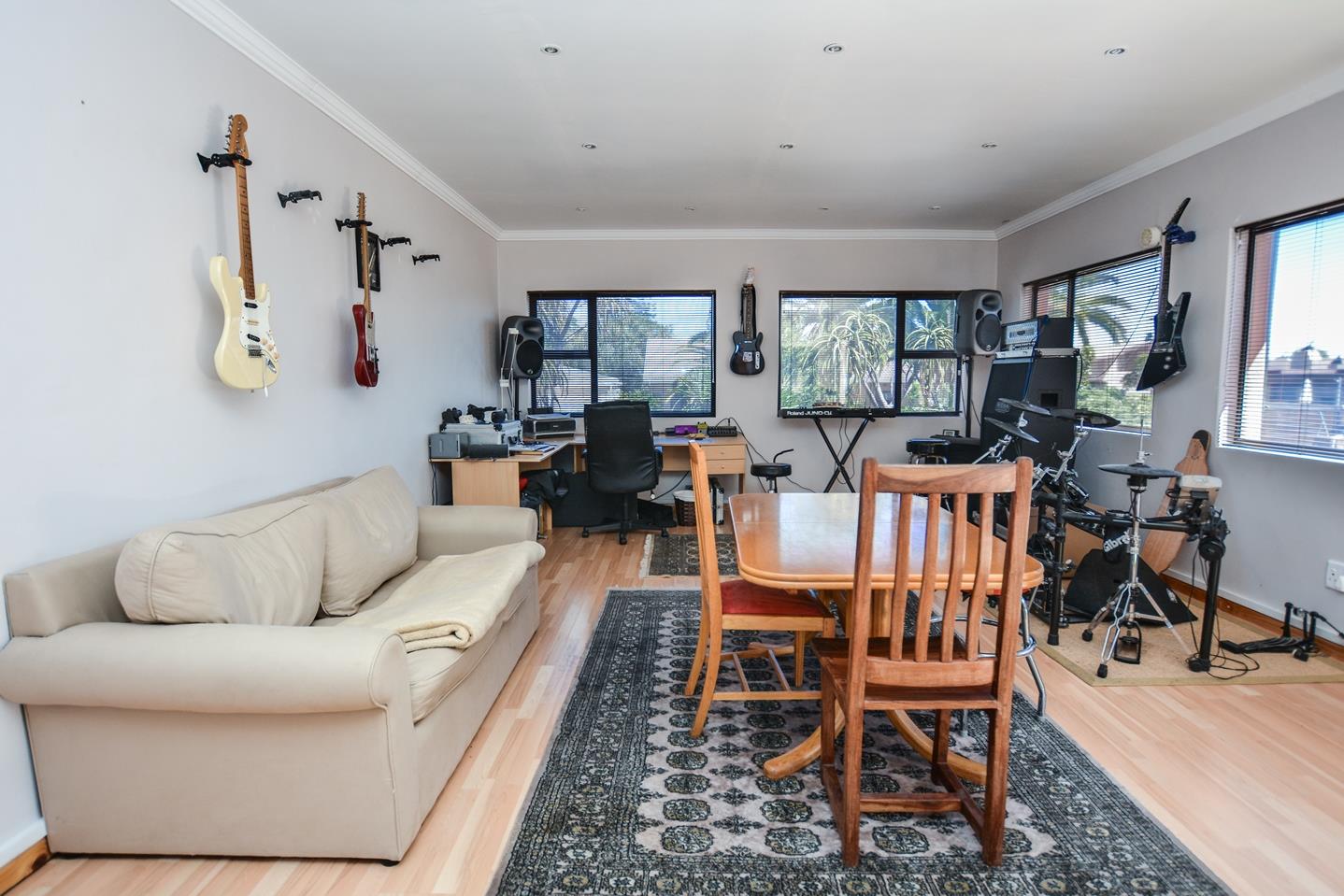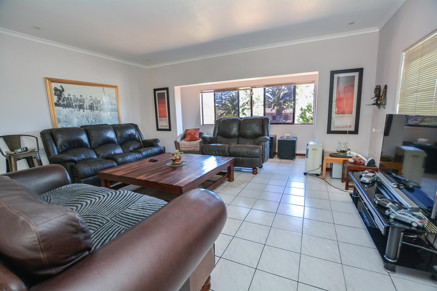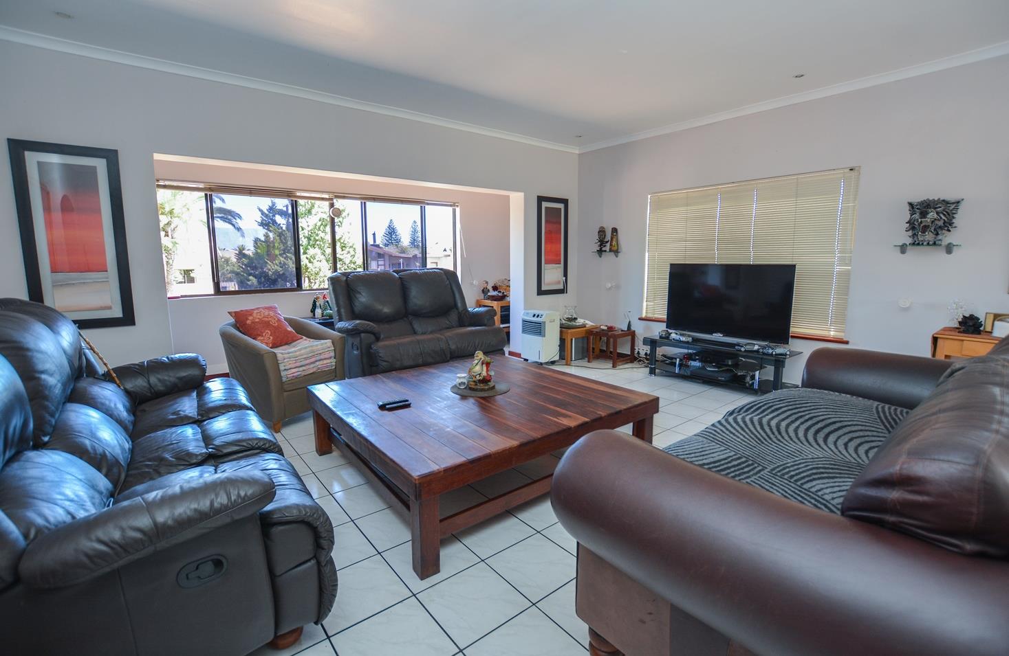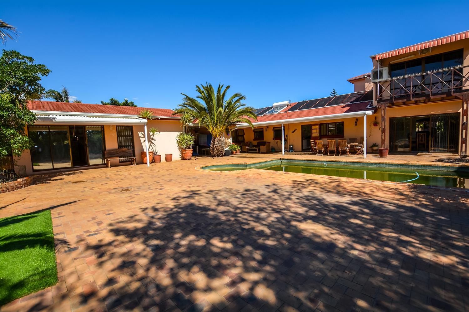 Externally at the front there is a double garage with additional parking for four cars and plenty of on street parking. There is an electric fence for improved security. There is a well point, energy saving LCD lighting and inverter air-conditioners throughout the property, a solar geyser, solar panels and a wind turbine.