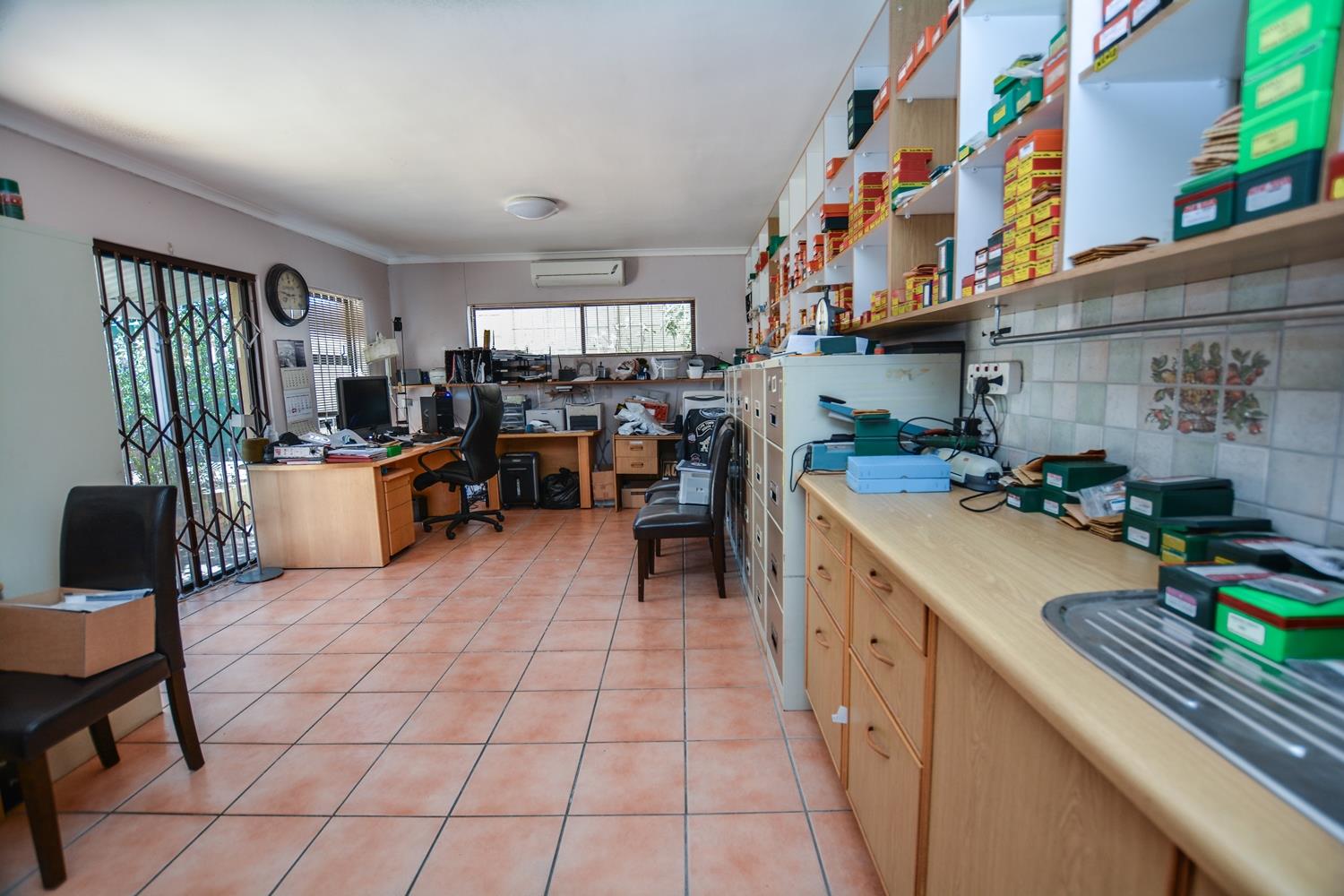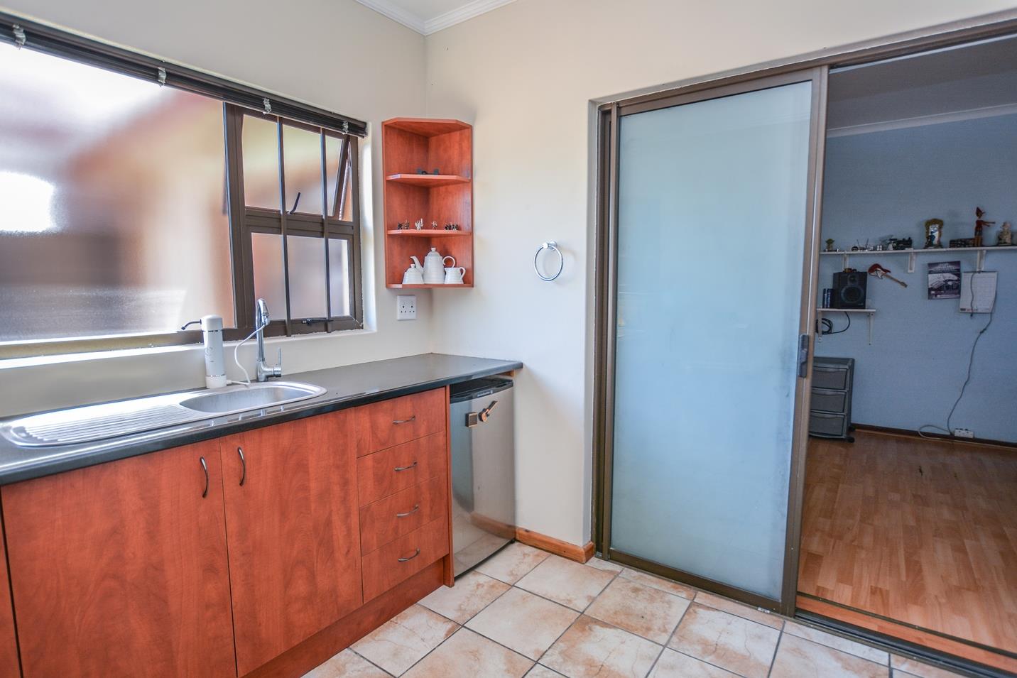 The practical tiled kitchen has white units and a row of full length built-in cupboards providing ample storage. The stove has gas top burners and an electric oven. Water is heated by a solar geyser which together with a wind turbine, solar panels and LCD lighting reduces energy costs throughout the house. There is also an opportunity to install additional solar panels and potentially go completely off grid.
