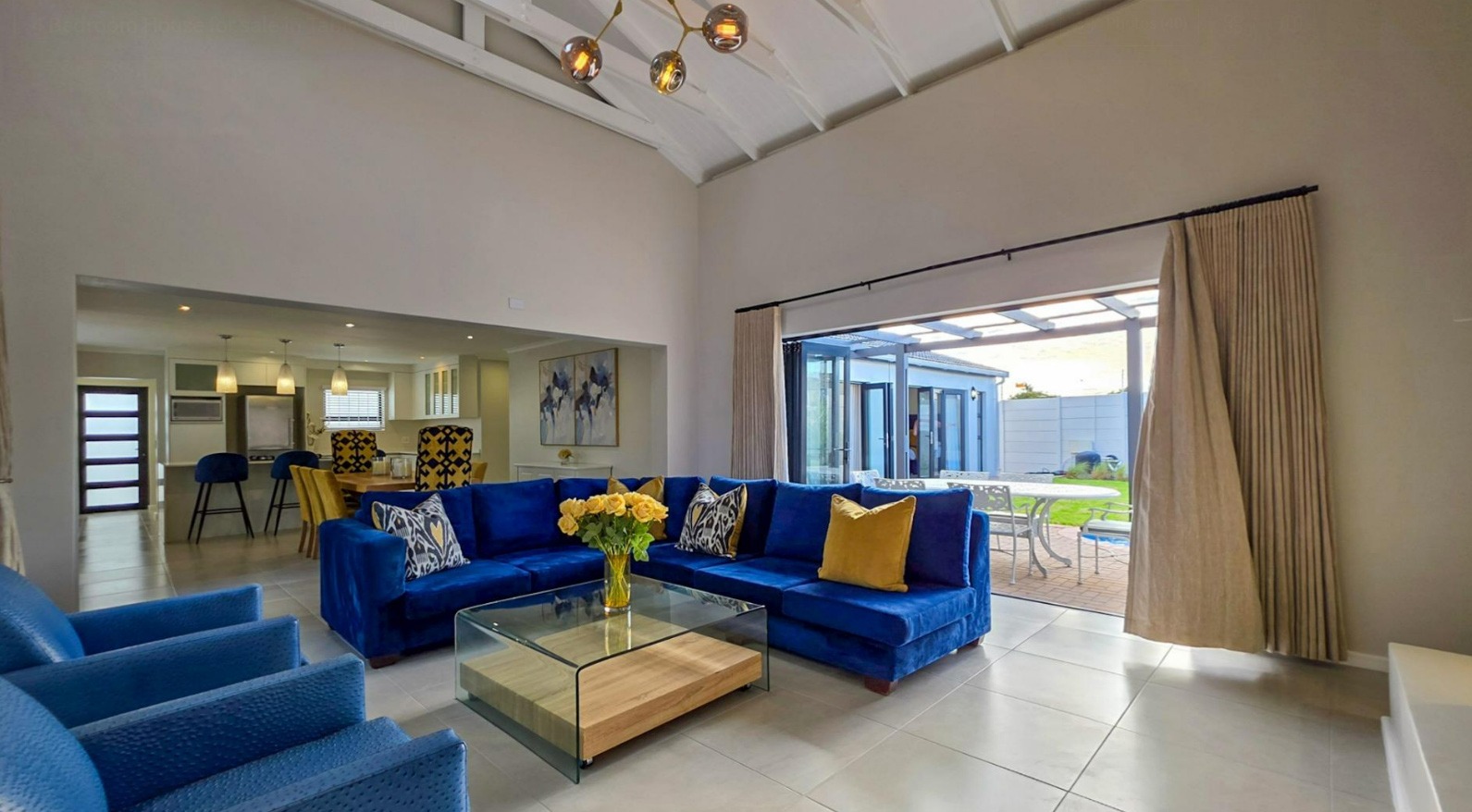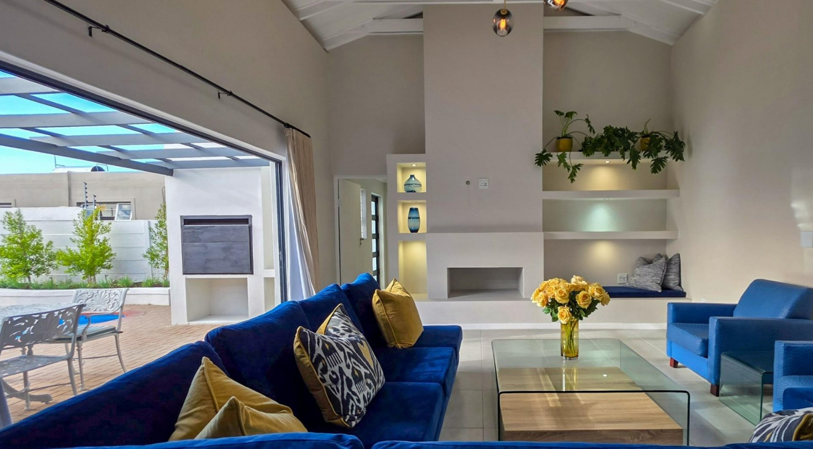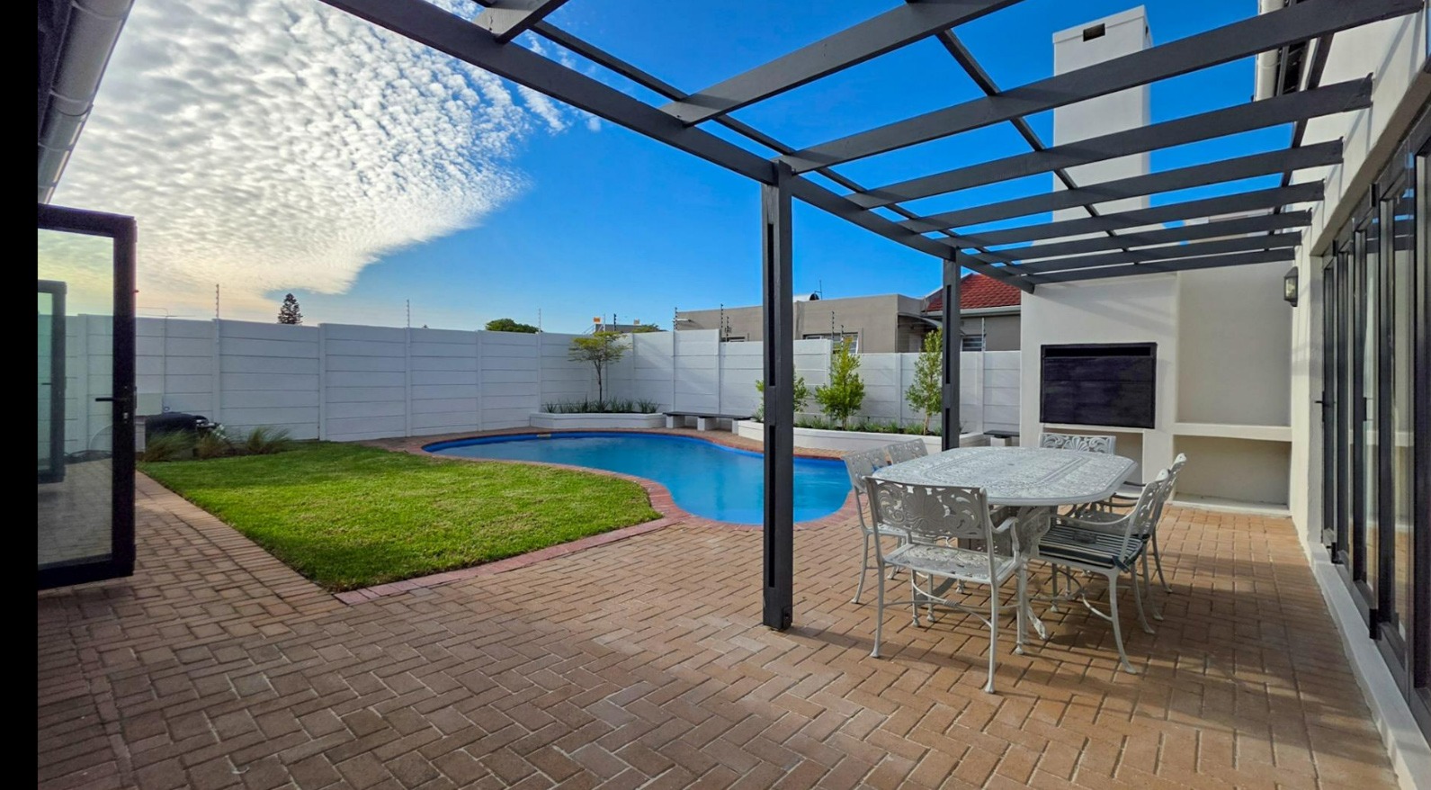 The spacious open-plan living and dining area centres around a built-in fireplace and opens through stacker doors to a sunlit patio with built-in braai, overlooking the garden and swimming pool — ideal for family gatherings and entertaining.