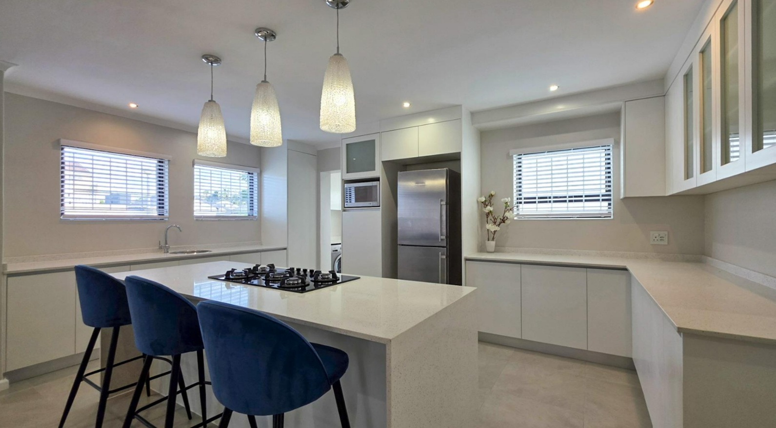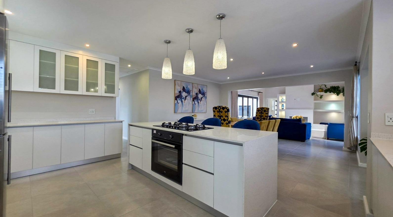 The modern kitchen features a large island, gas hob, electric oven, ample storage, and a separate scullery.