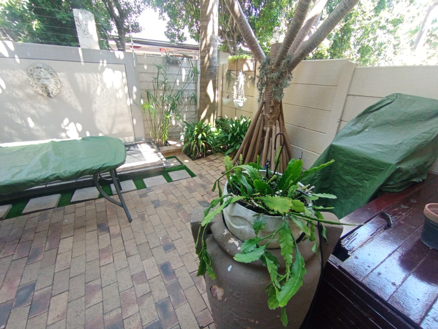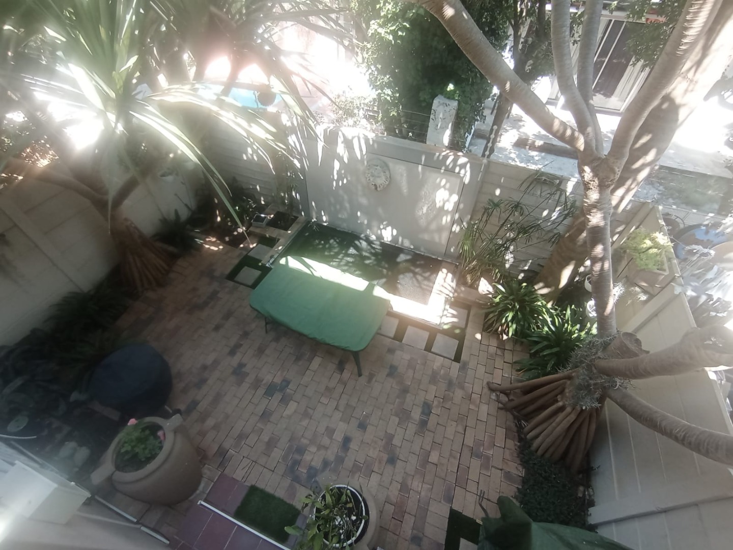 Step outside to a brick-paved, enclosed courtyard featuring established trees, creating a private and tranquil outdoor space.
