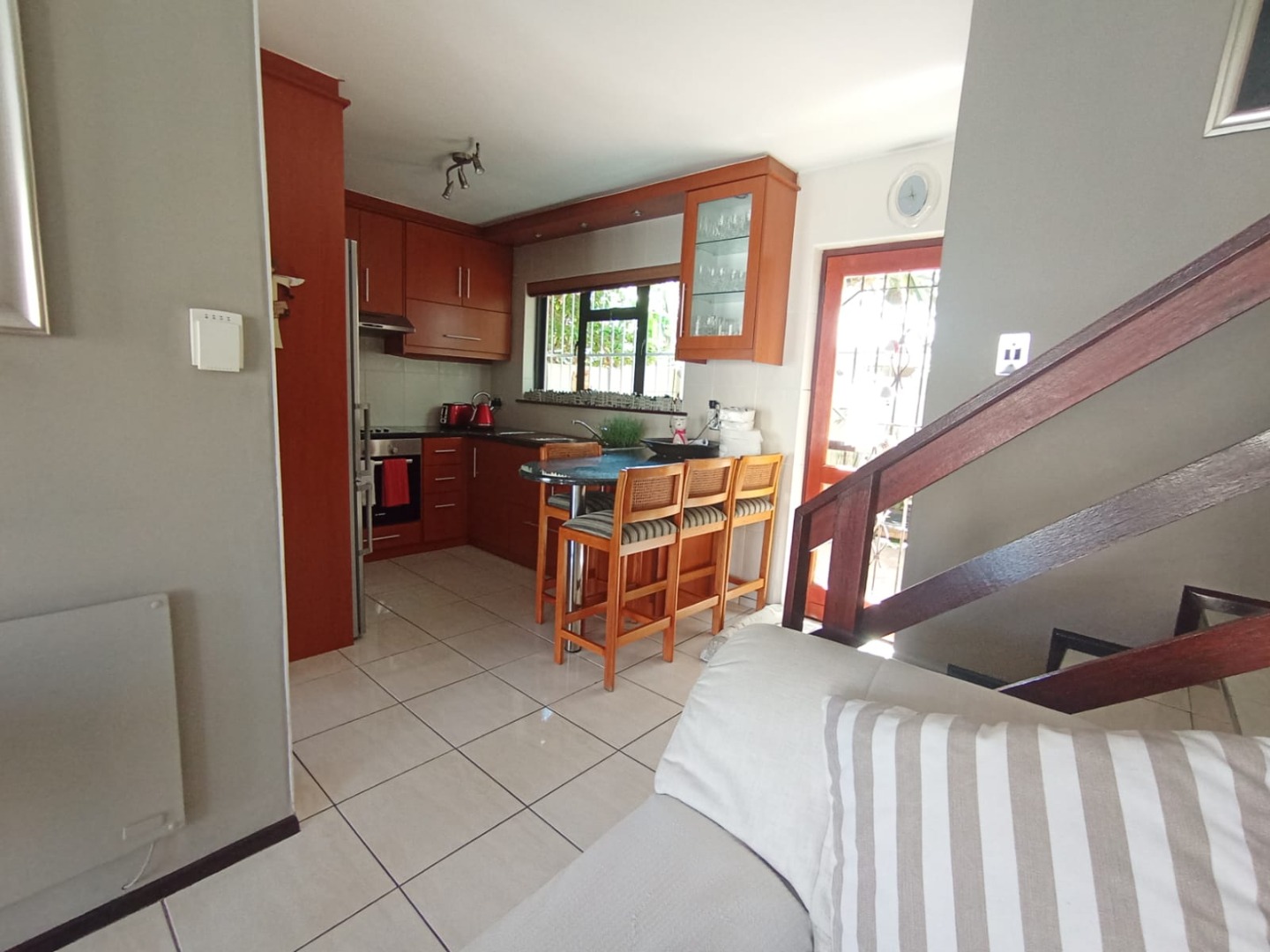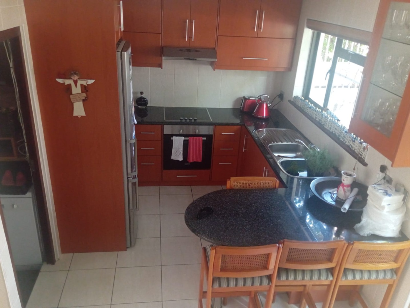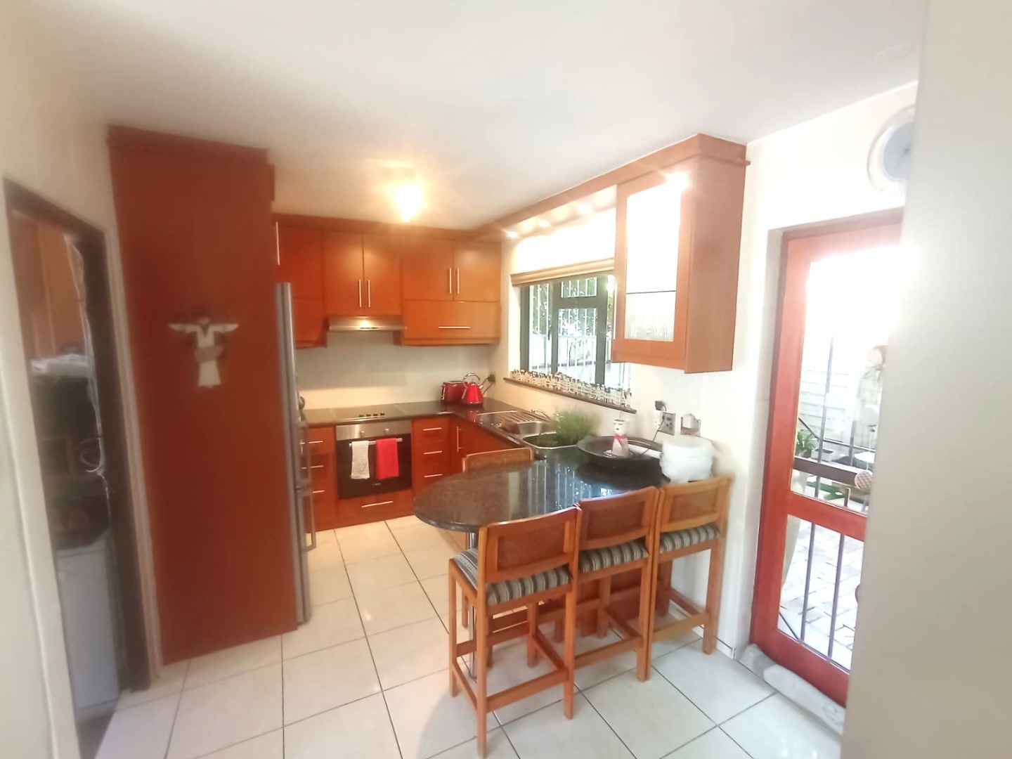 The tiled lounge flows into a neat practical kitchen with granite countertops and a breakfast counter nook, ideal for casual dining. It is also fitted with a Bosch under-counter oven, hob, and extractor fan. A guest cloakroom is conveniently located downstairs.