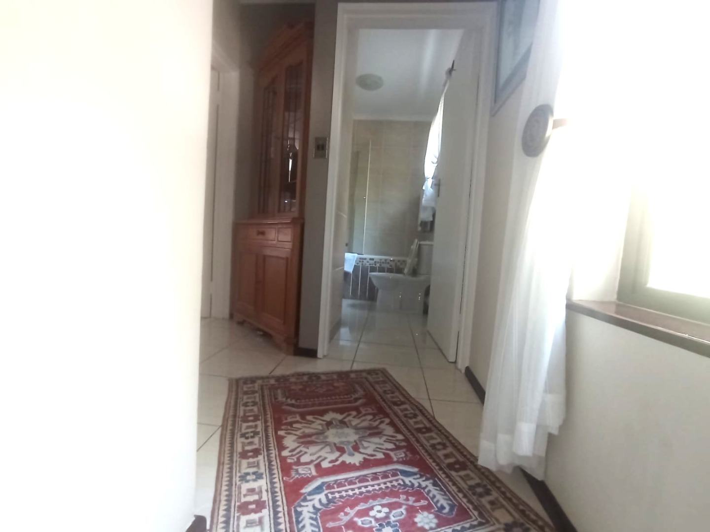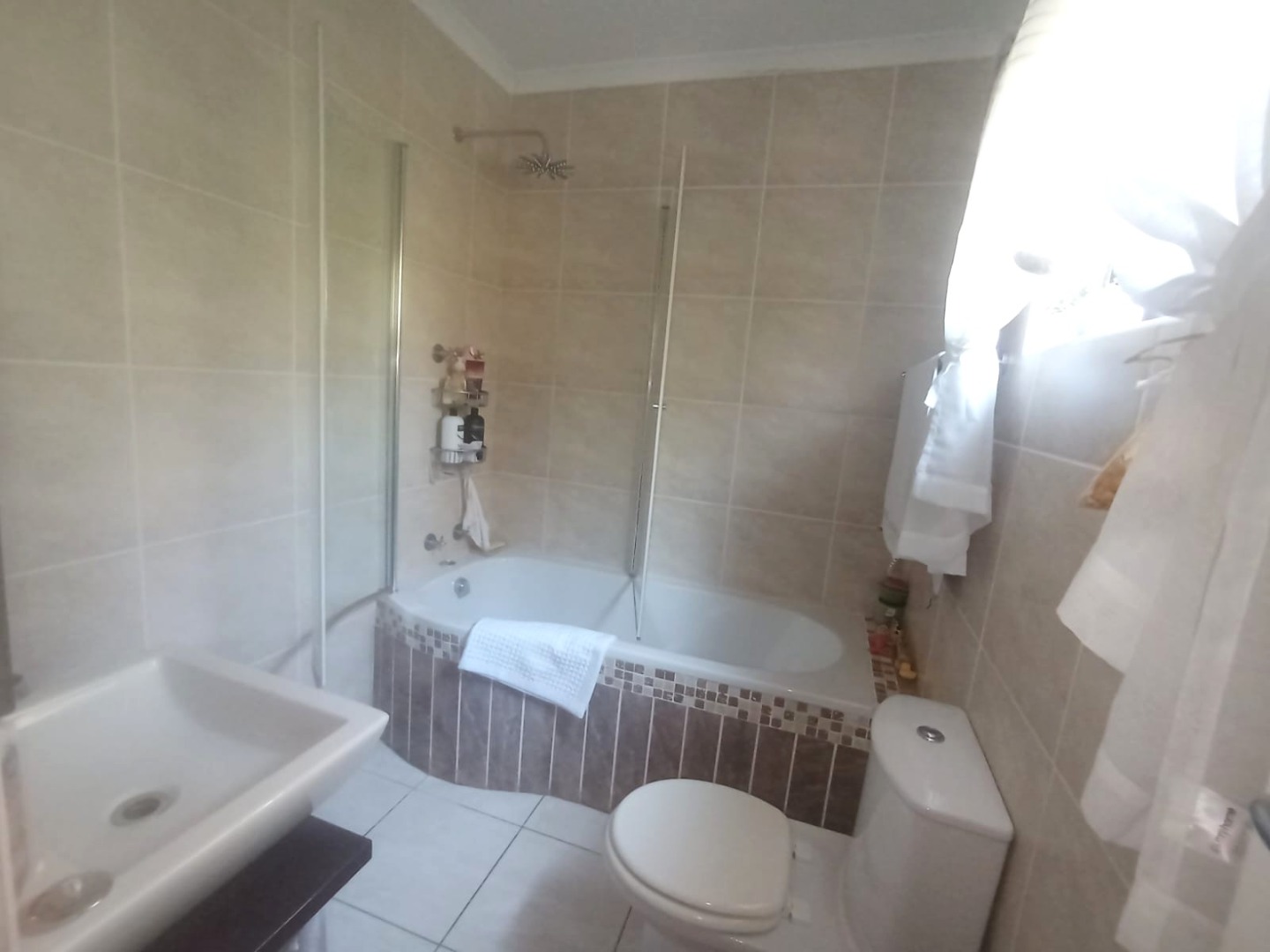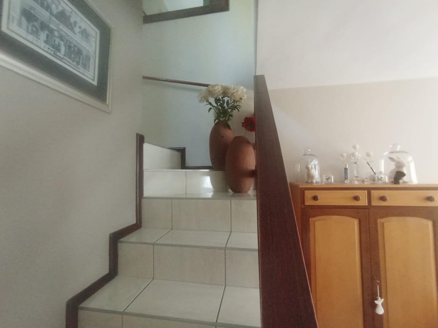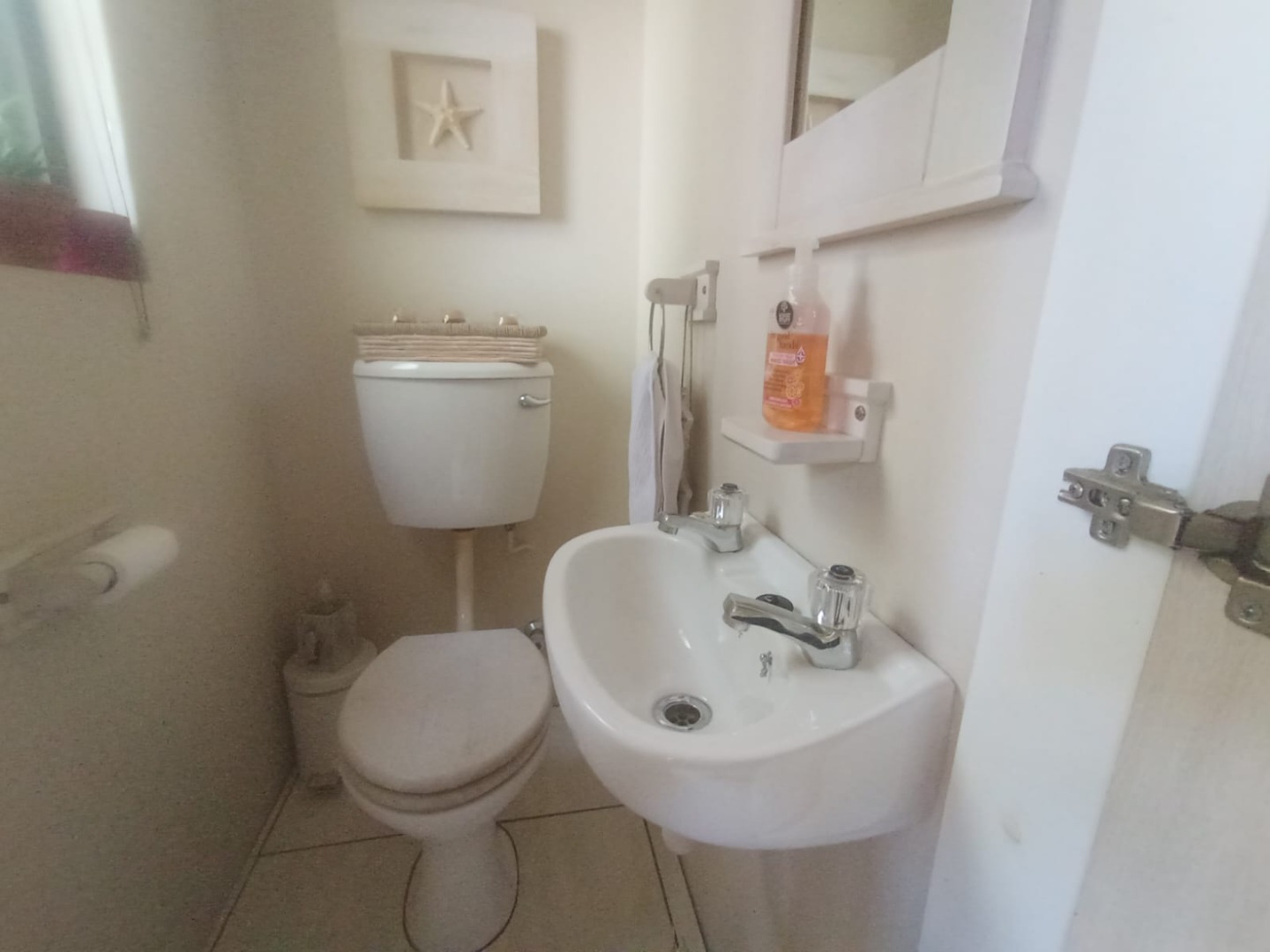 The tiled lounge flows into a neat practical kitchen with granite countertops and a breakfast counter nook, ideal for casual dining. It is also fitted with a Bosch under-counter oven, hob, and extractor fan. A guest cloakroom is conveniently located downstairs.