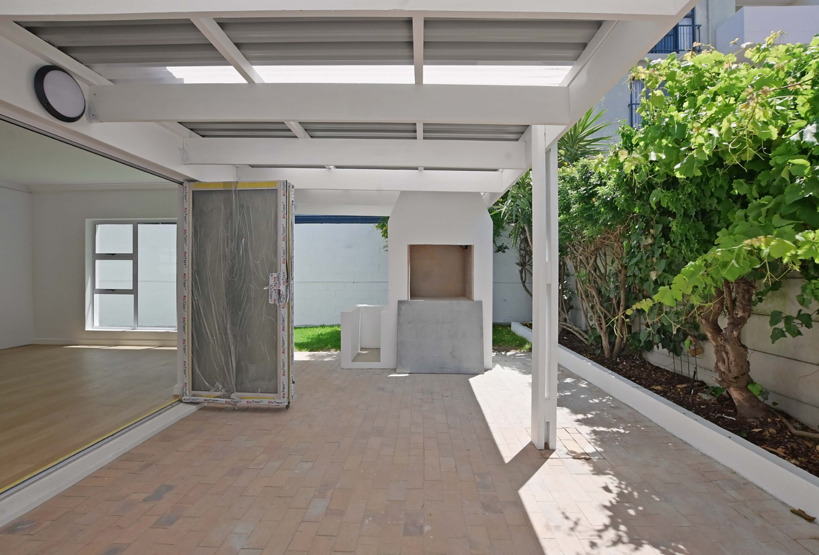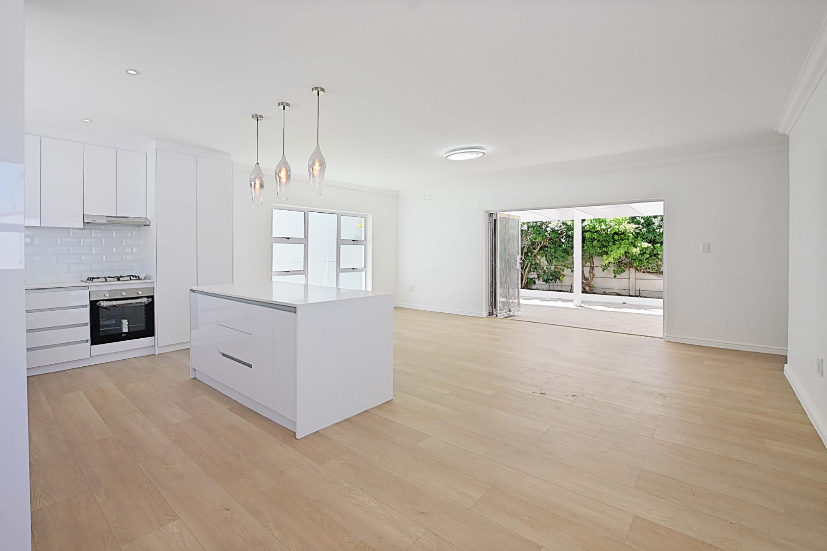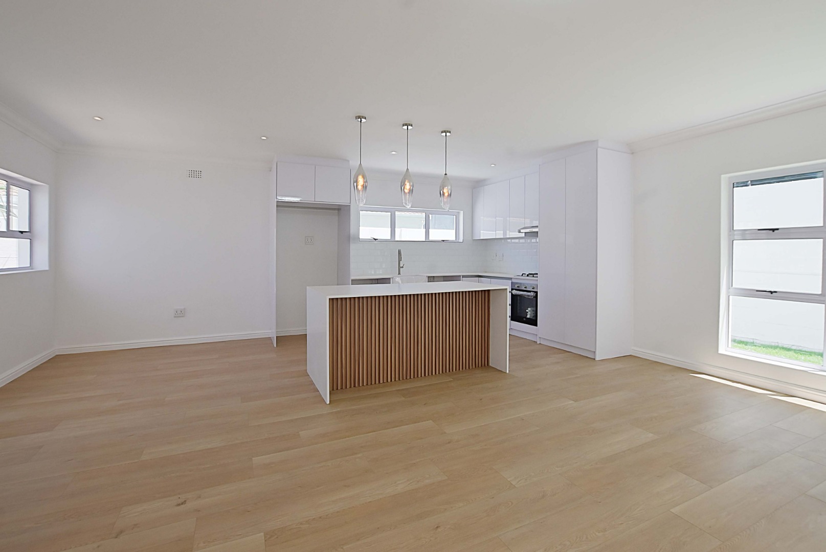 The kitchen and lounge are open plan. The kitchen has a gas hob, a scullery with water points for a washing machine, and a second water point for a dishwasher. The living area leads to a patio and a wraparound garden, complete with a built braai.