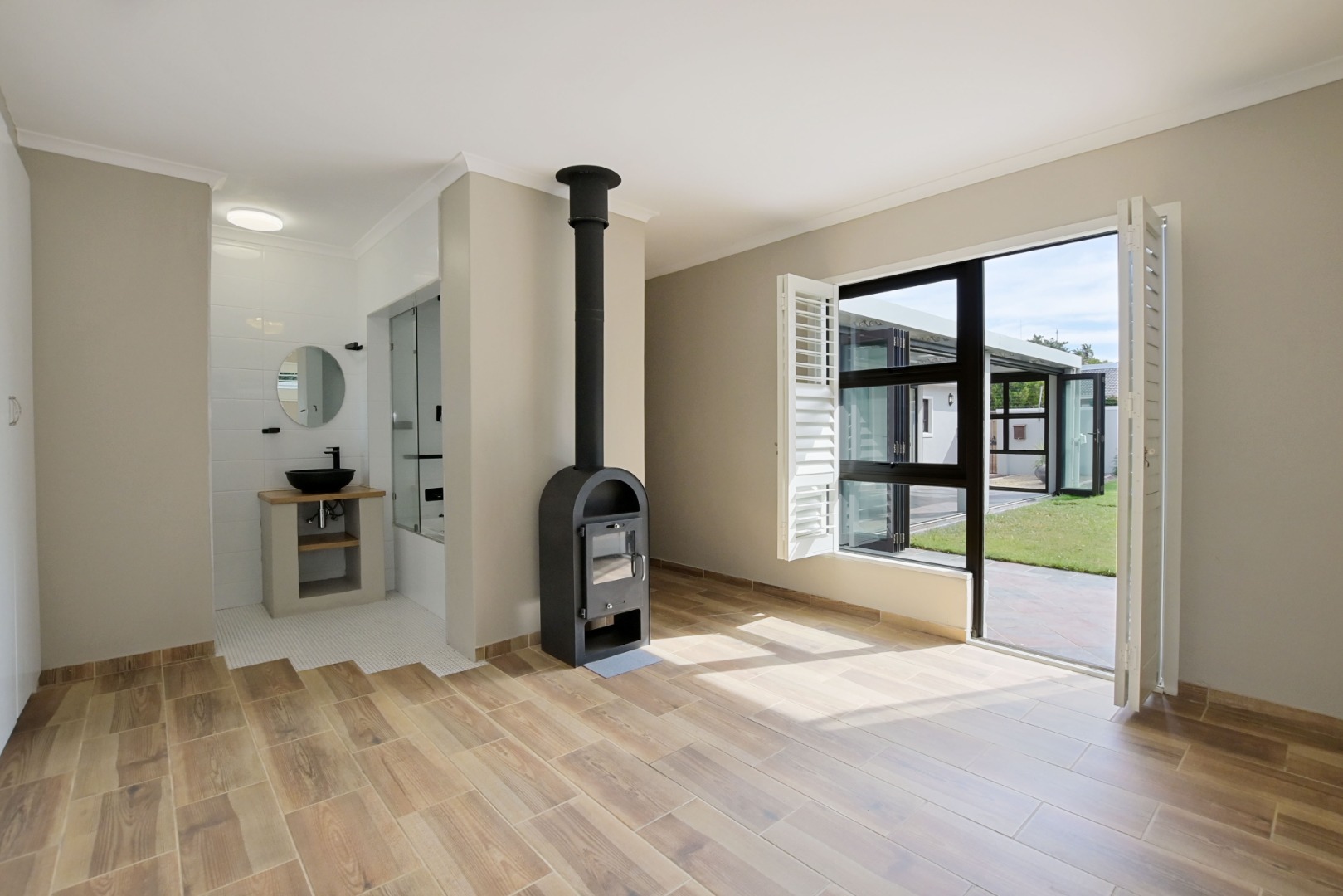 The open-plan lounge and dining area features inverter air-conditioning and flows seamlessly onto an undercover patio and sunroom, overlooking the manicured garden — ideal for year-round living and entertaining.