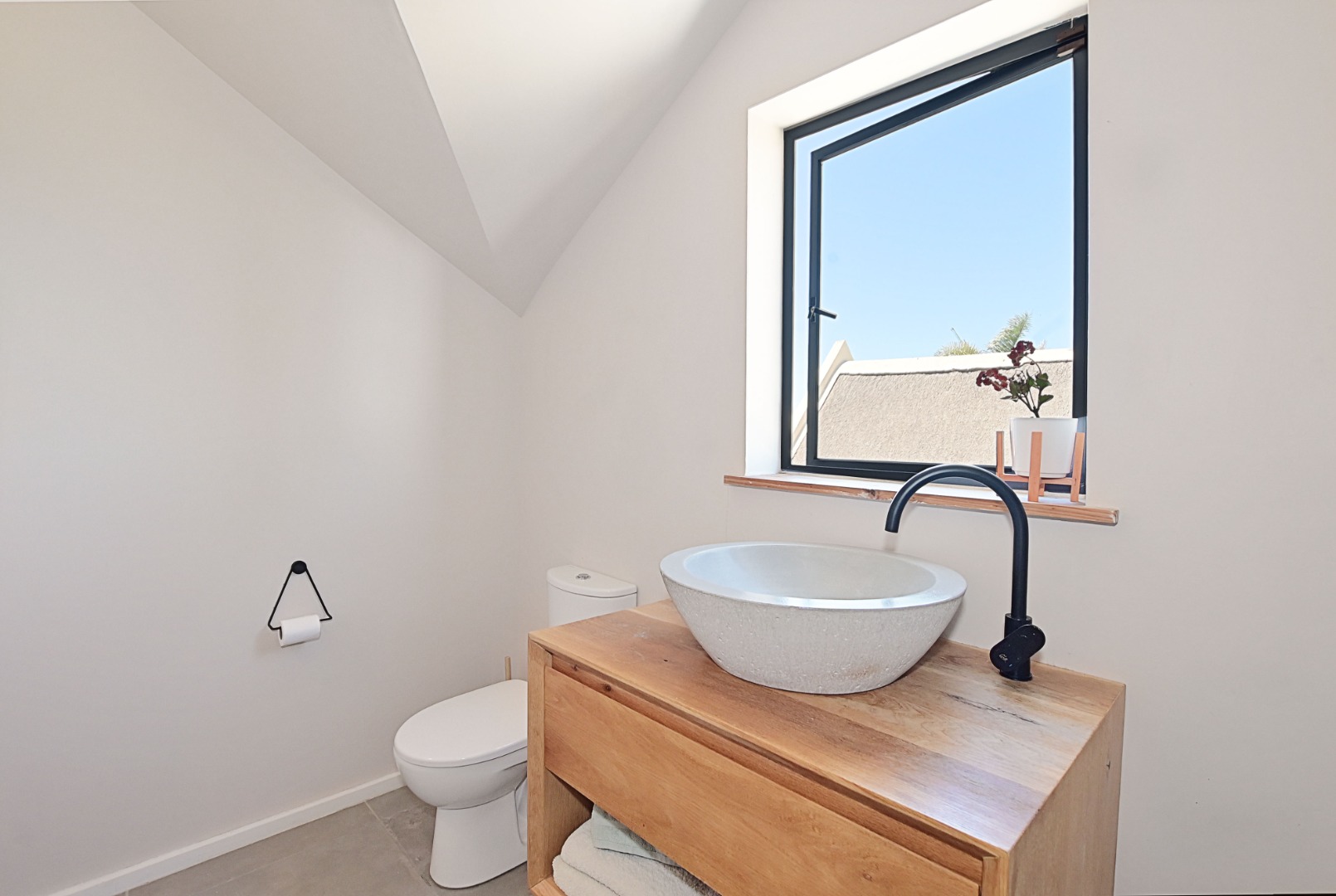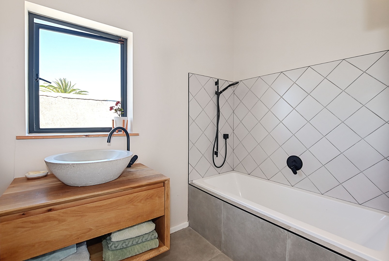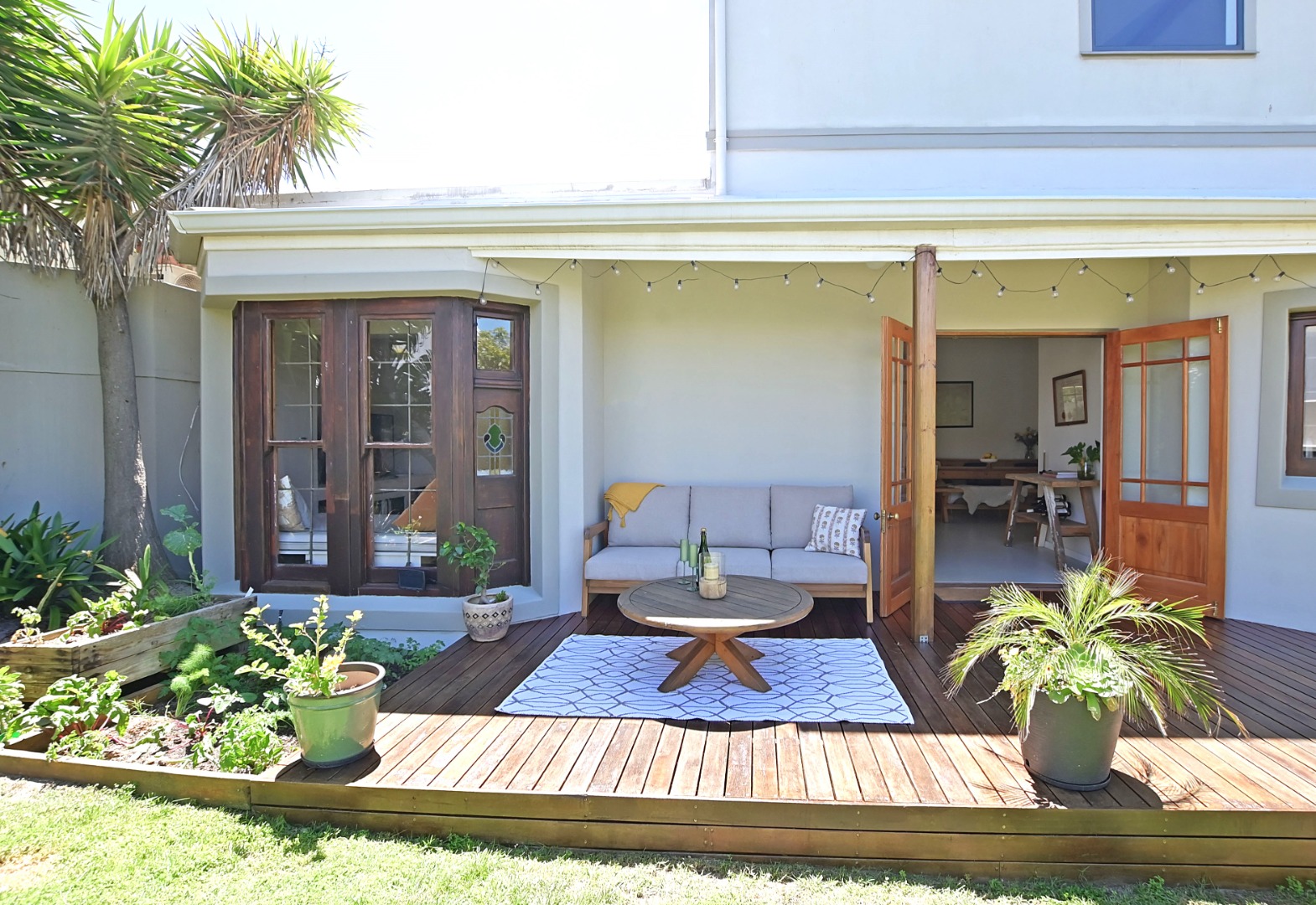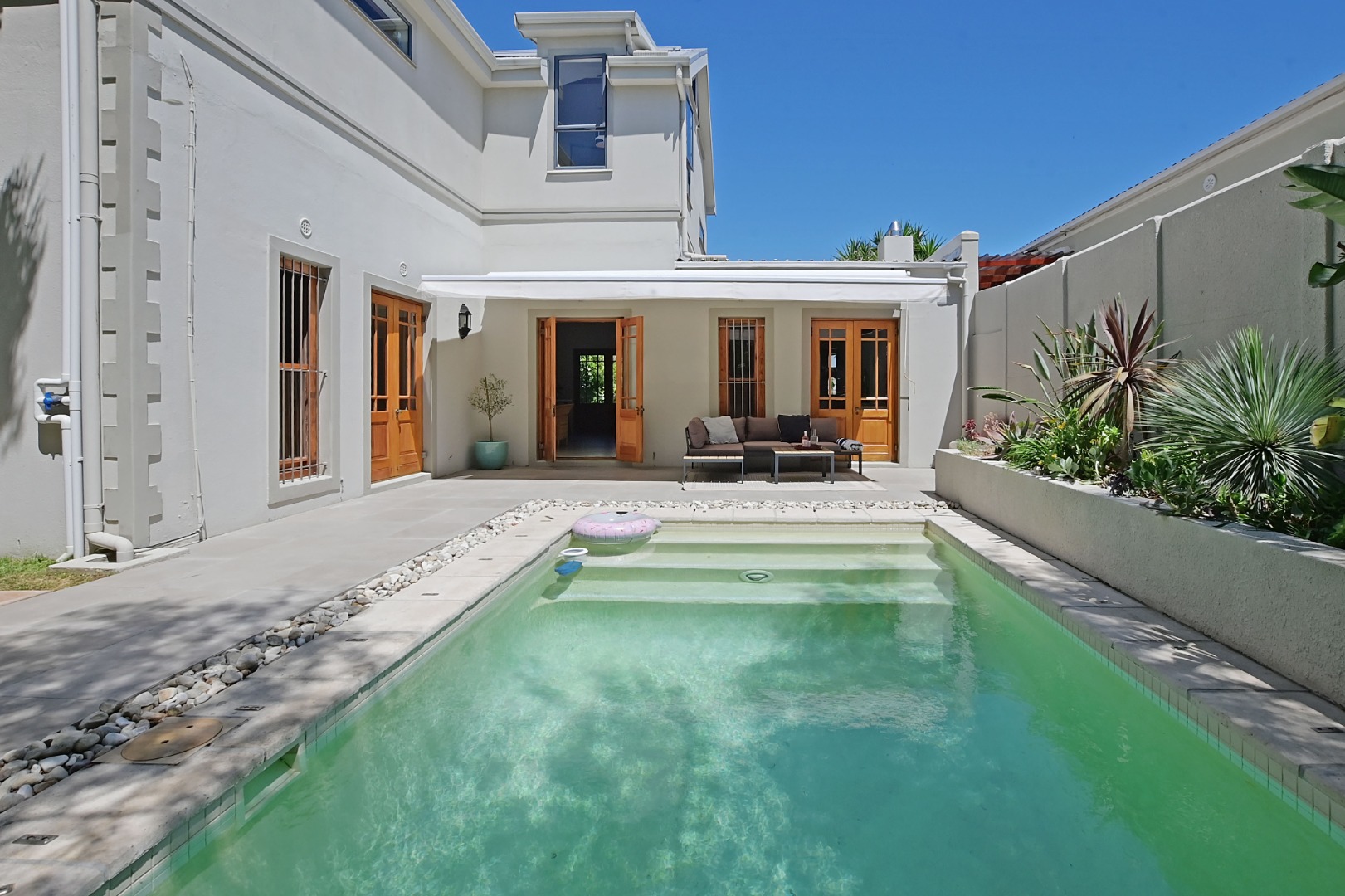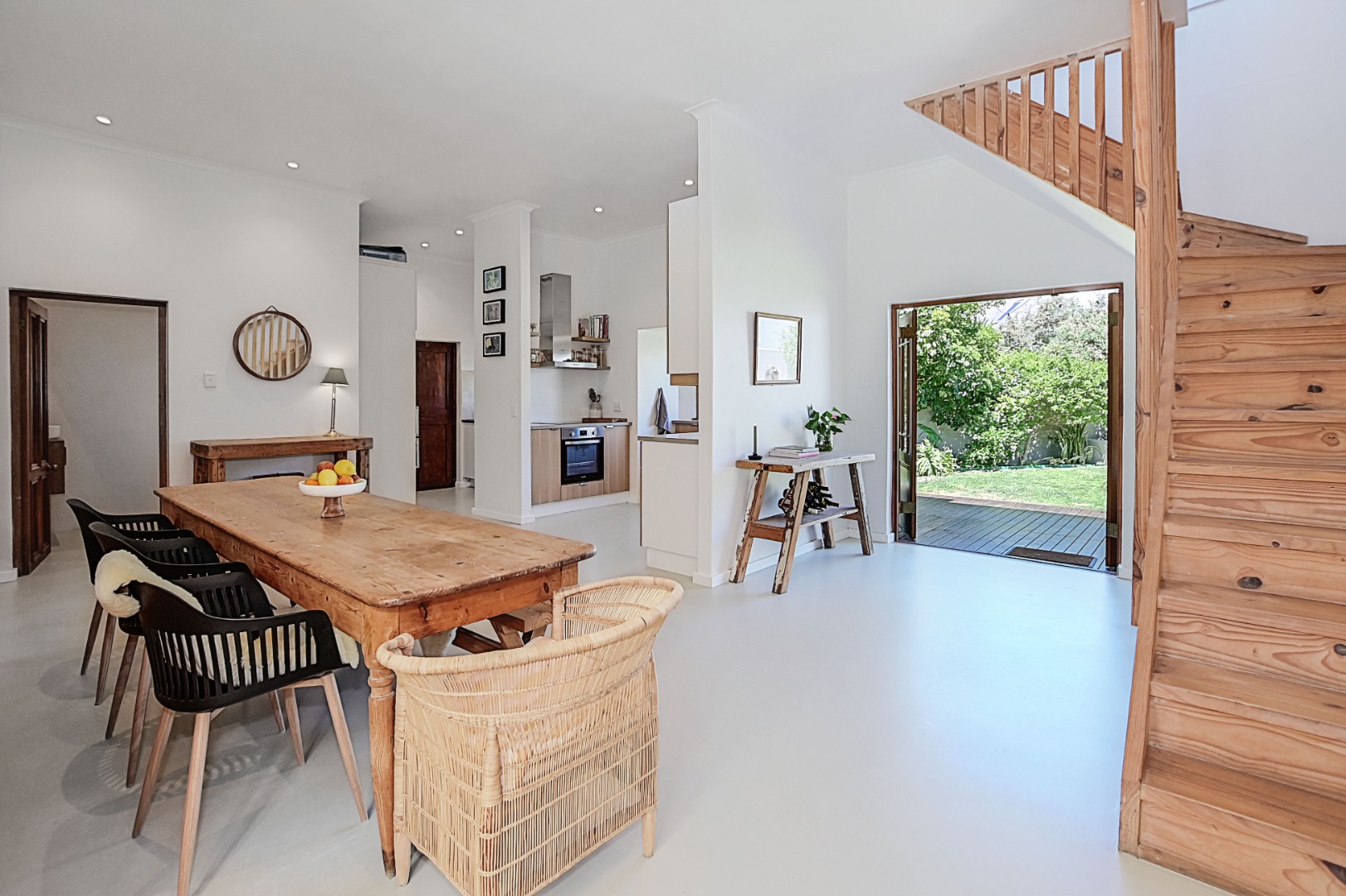 The wind-protected, north-facing courtyard, boasting an inviting heated swimming pool and seamless indoor–outdoor flow. The open-plan living and dining area spills out onto the back garden, offering the ideal setting for relaxed gatherings.