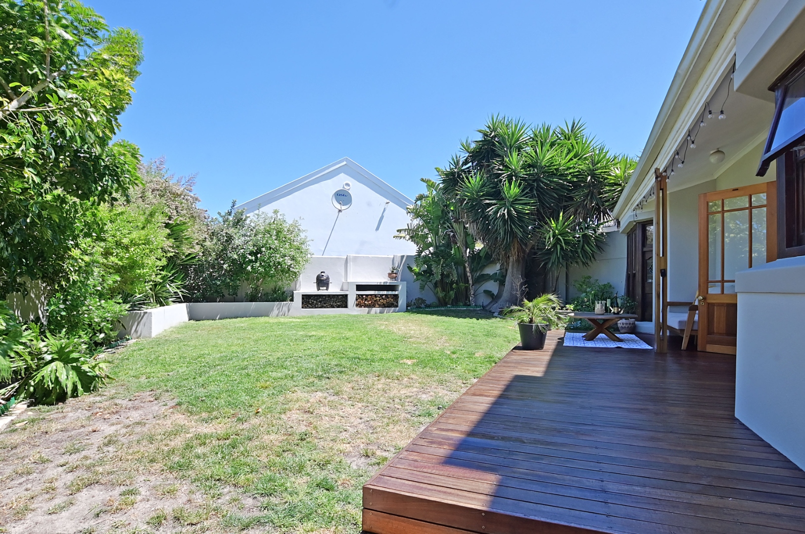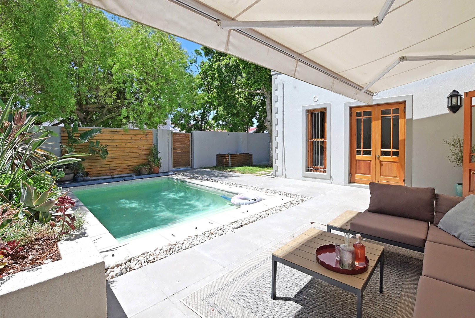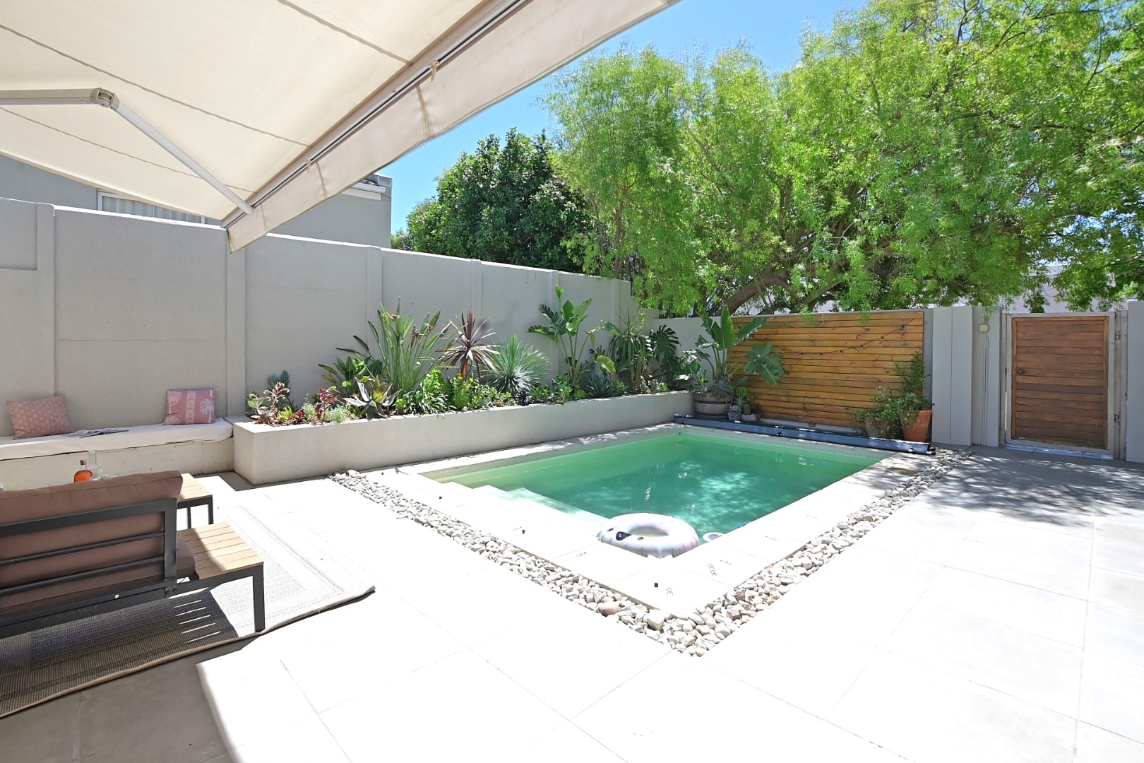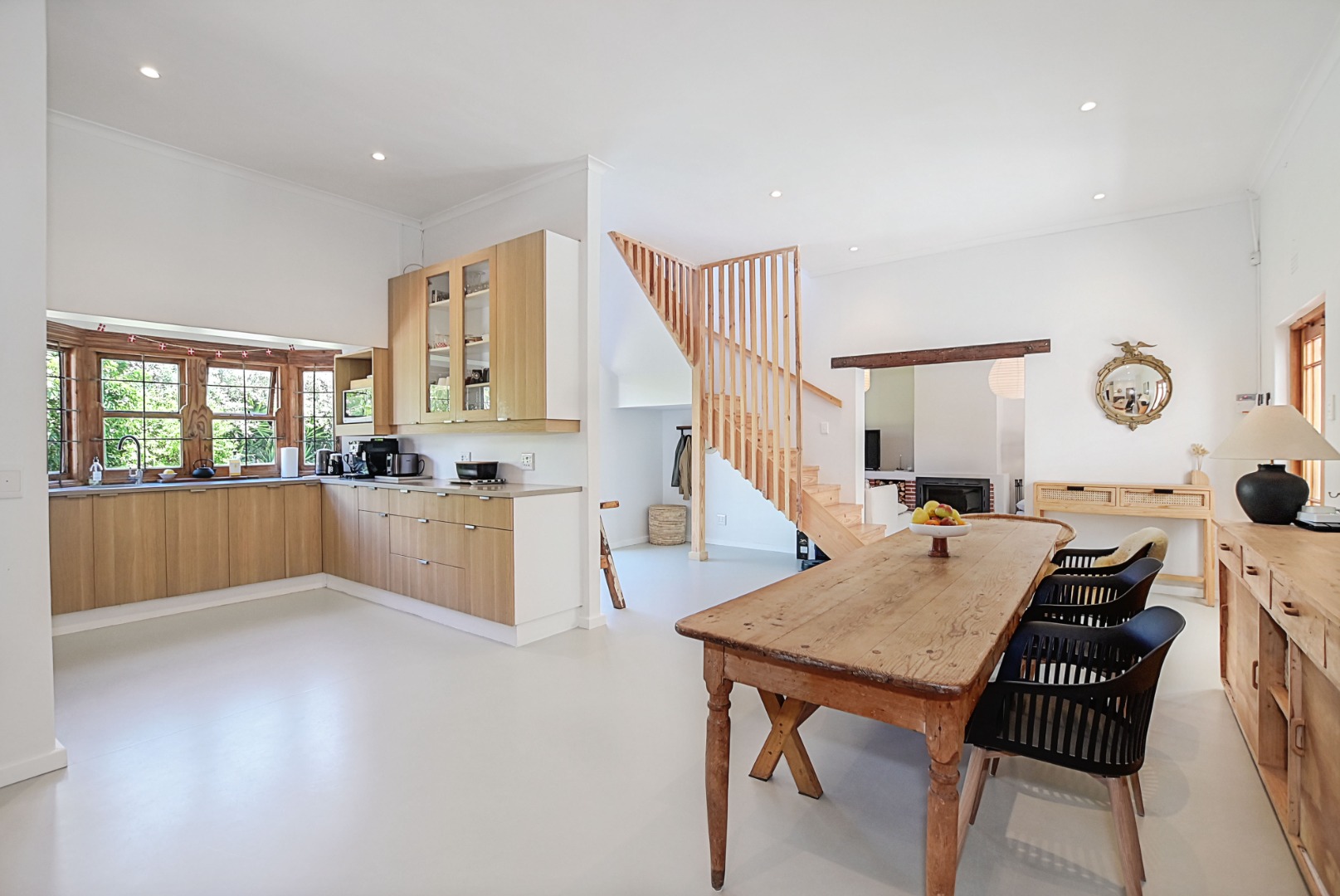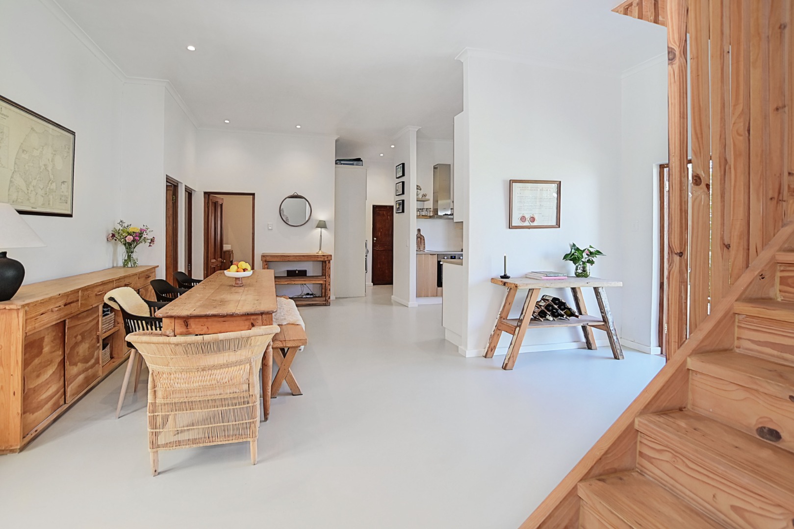 The wind-protected, north-facing courtyard, boasting an inviting heated swimming pool and seamless indoor–outdoor flow. The open-plan living and dining area spills out onto the back garden, offering the ideal setting for relaxed gatherings.