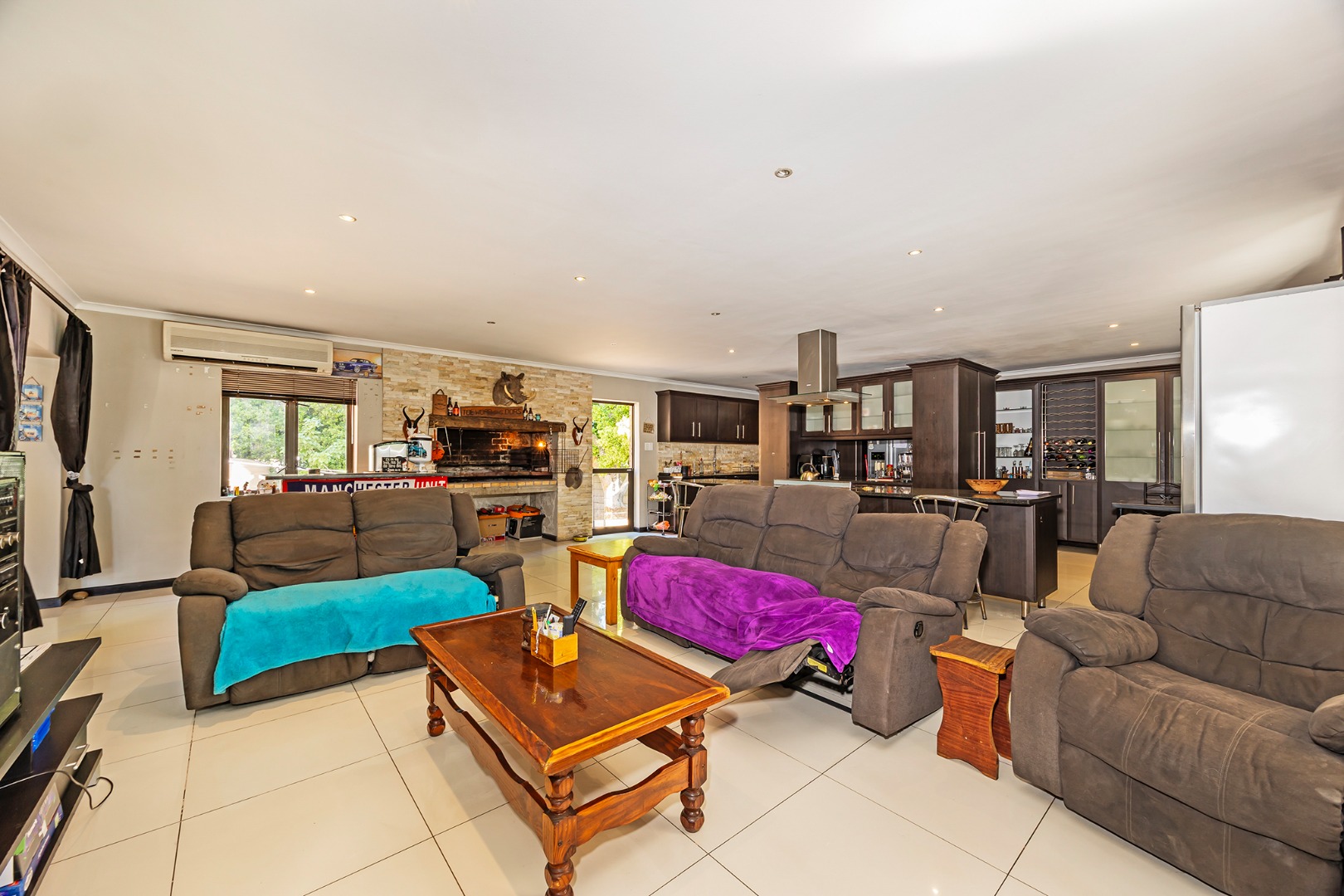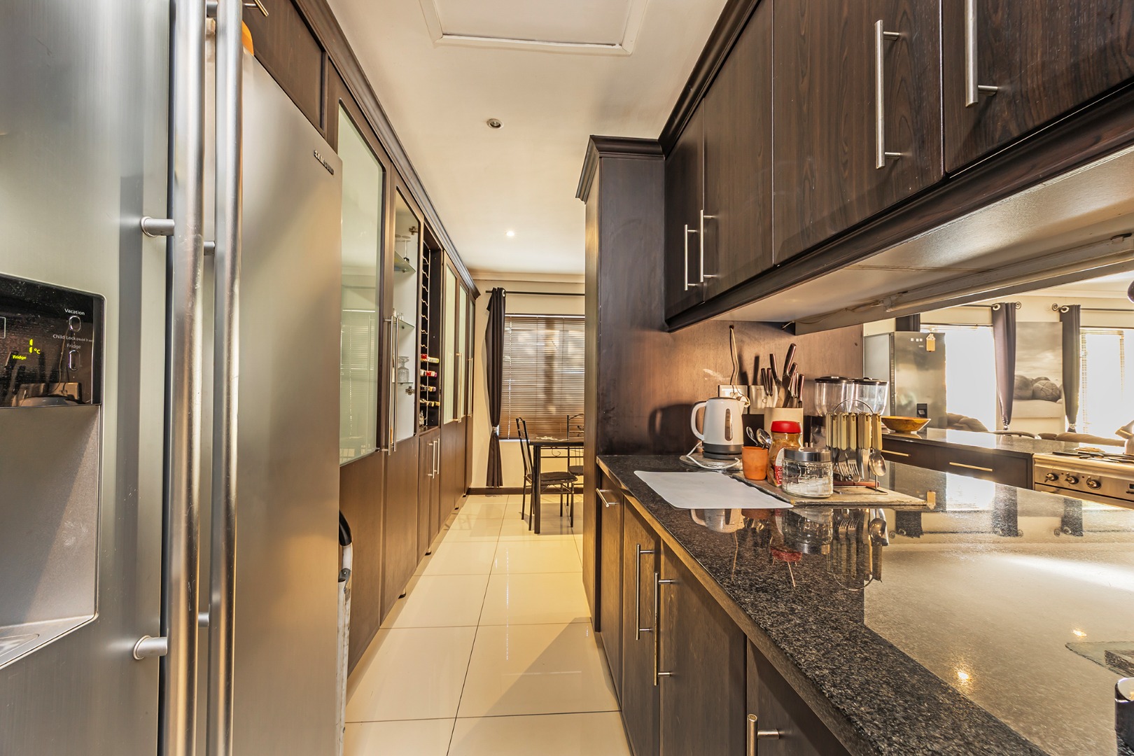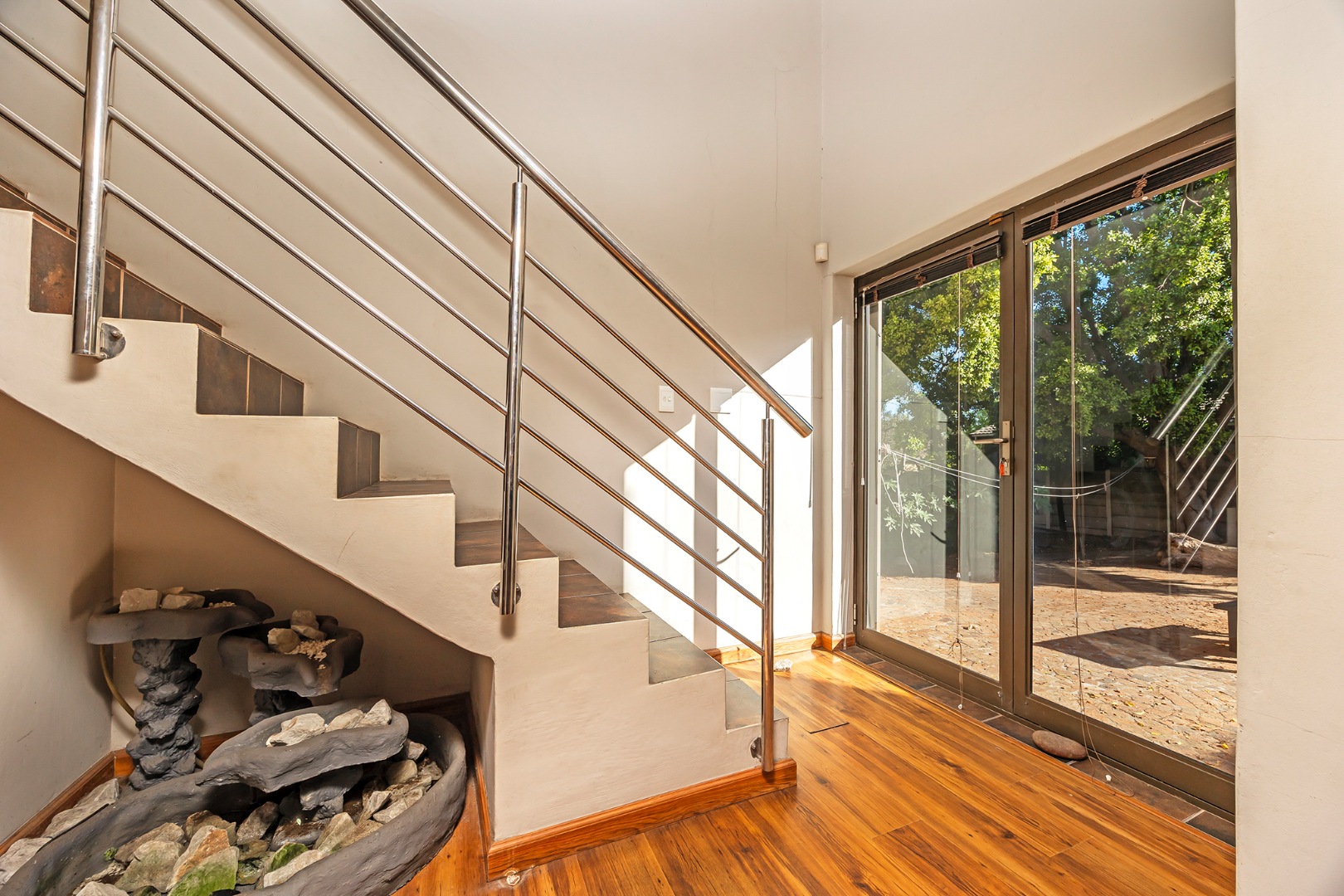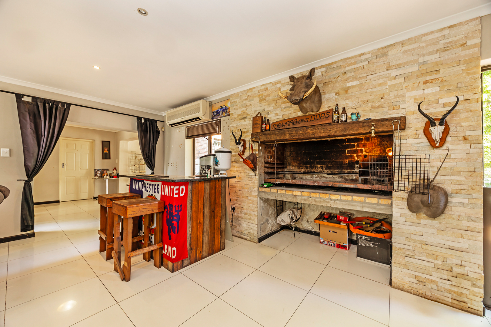 A generous entrance hall sets the tone for what is to come: wide-open rooms, superb flow and living spaces designed for both relaxation and entertaining. To the right of the entrance, a truly remarkable entertainment room awaits — complete with a built-in braai, bar area and enough floor space to host large gatherings with ease. This room opens directly to the private back garden, where mature trees create a shaded, tranquil setting ideal for outdoor living. There is ample room to install a swimming pool or to design a fully landscaped entertainment area to your taste.