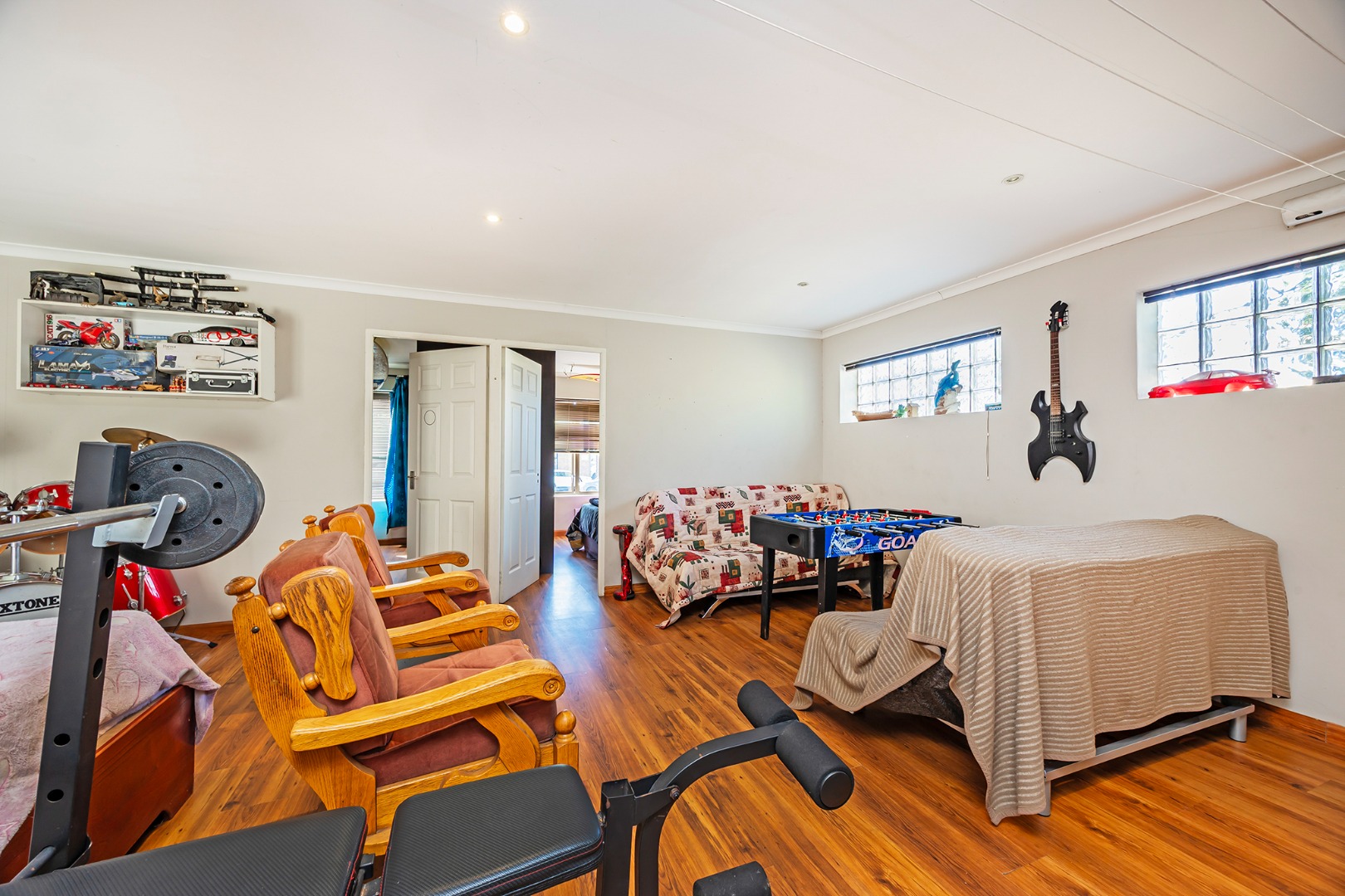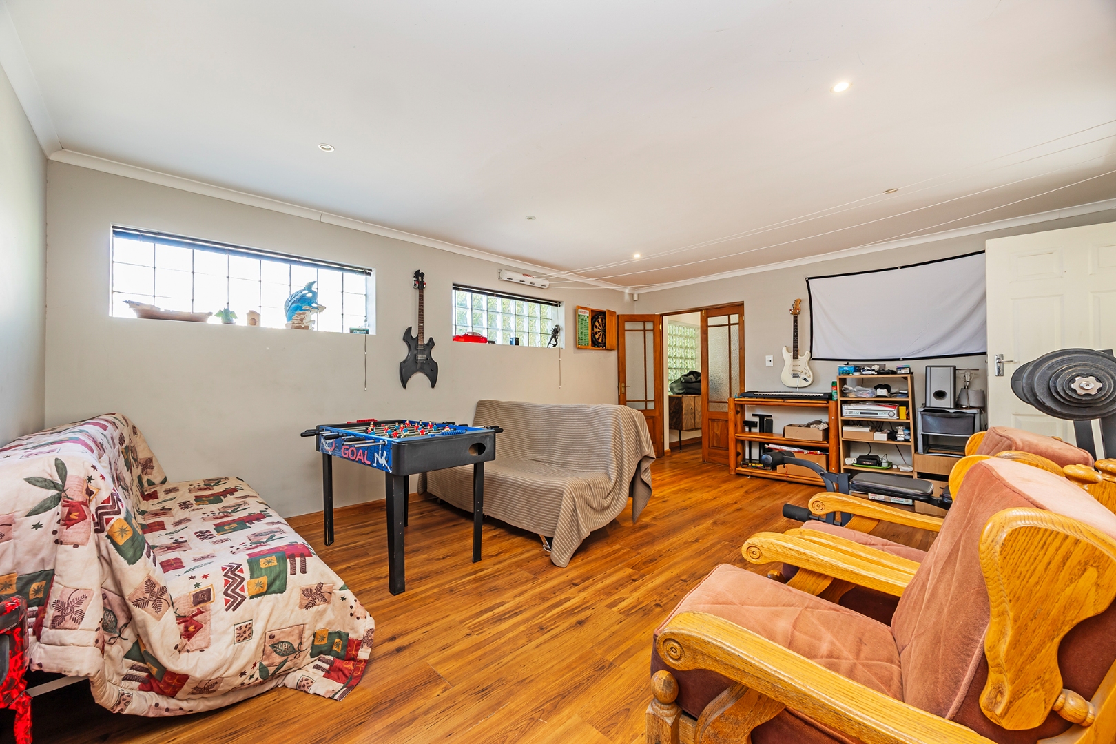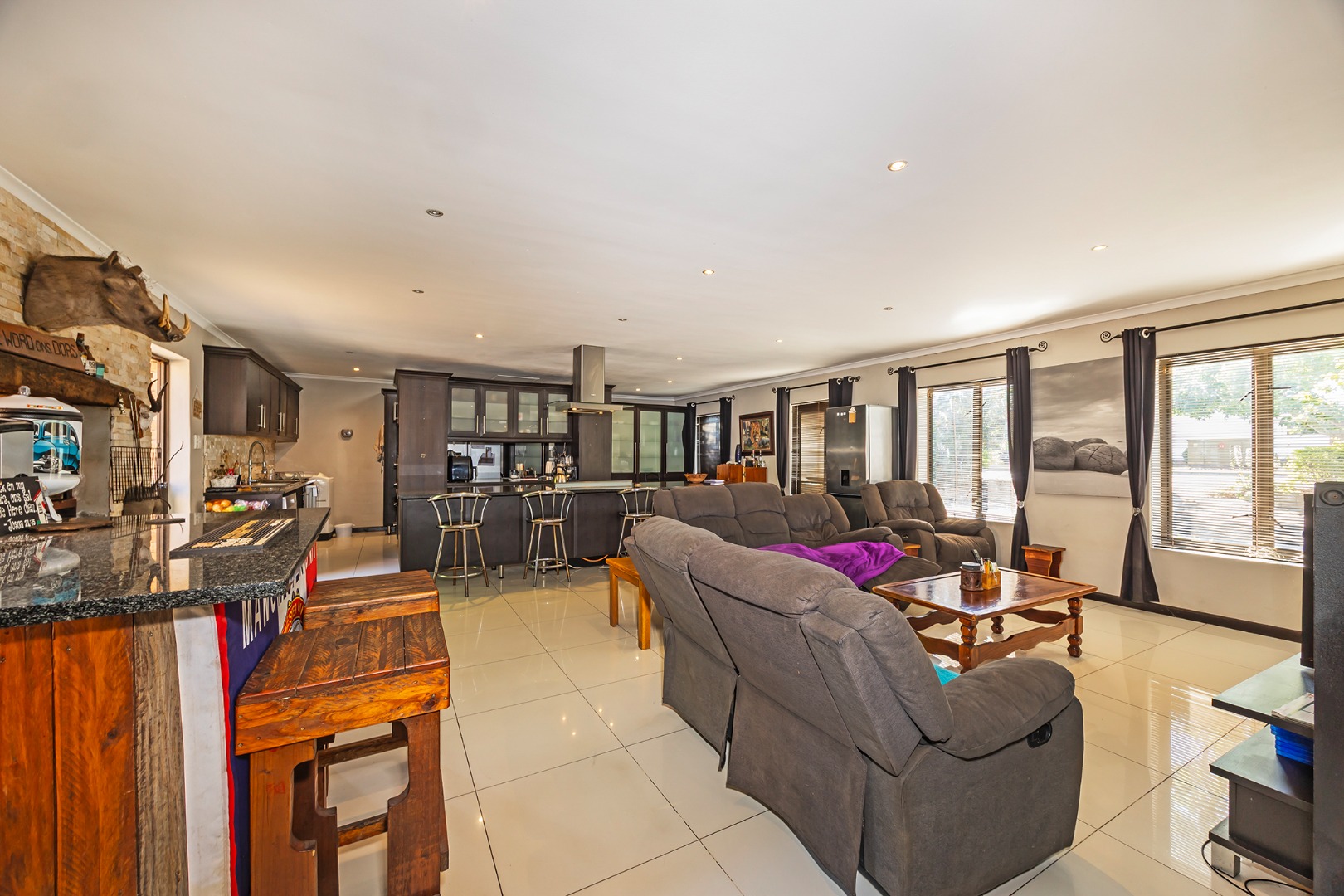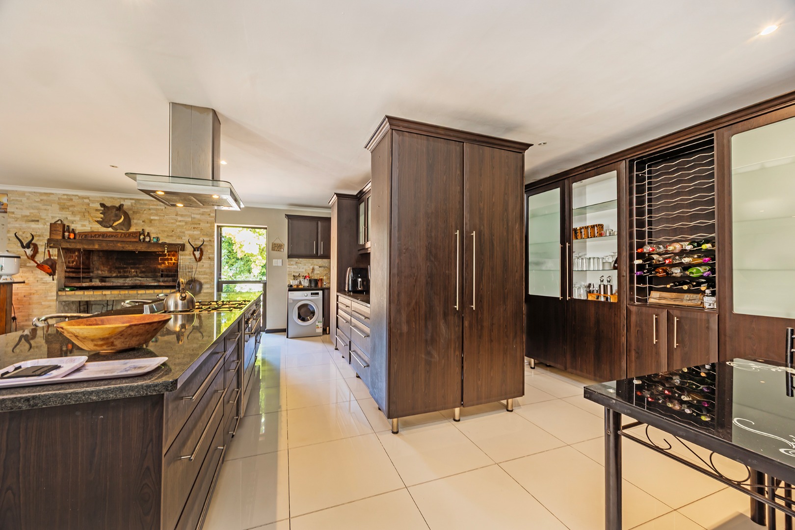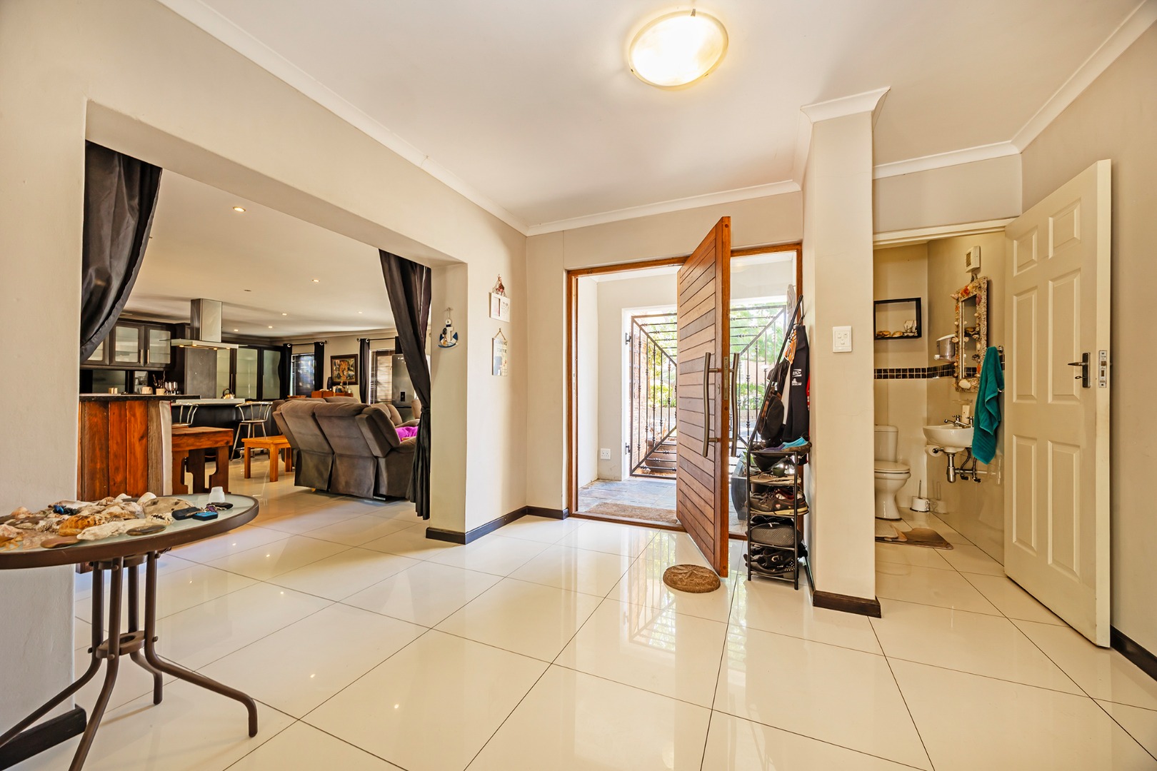 A generous entrance hall sets the tone for what is to come: wide-open rooms, superb flow and living spaces designed for both relaxation and entertaining. To the right of the entrance, a truly remarkable entertainment room awaits — complete with a built-in braai, bar area and enough floor space to host large gatherings with ease. This room opens directly to the private back garden, where mature trees create a shaded, tranquil setting ideal for outdoor living. There is ample room to install a swimming pool or to design a fully landscaped entertainment area to your taste.