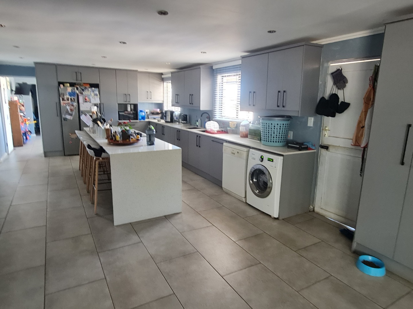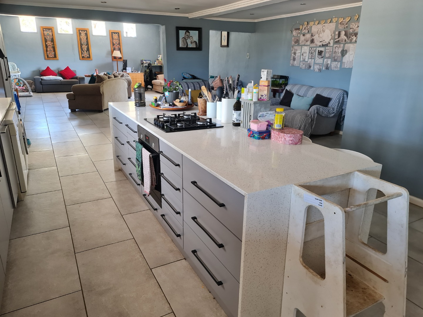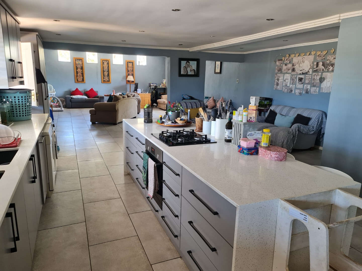 Open plan lounge , dining room and white Caesar stone kitchen that leads out on to your private pool and entertainment are for those afternoon sundowners or family gatherings .