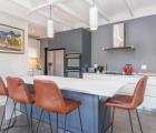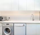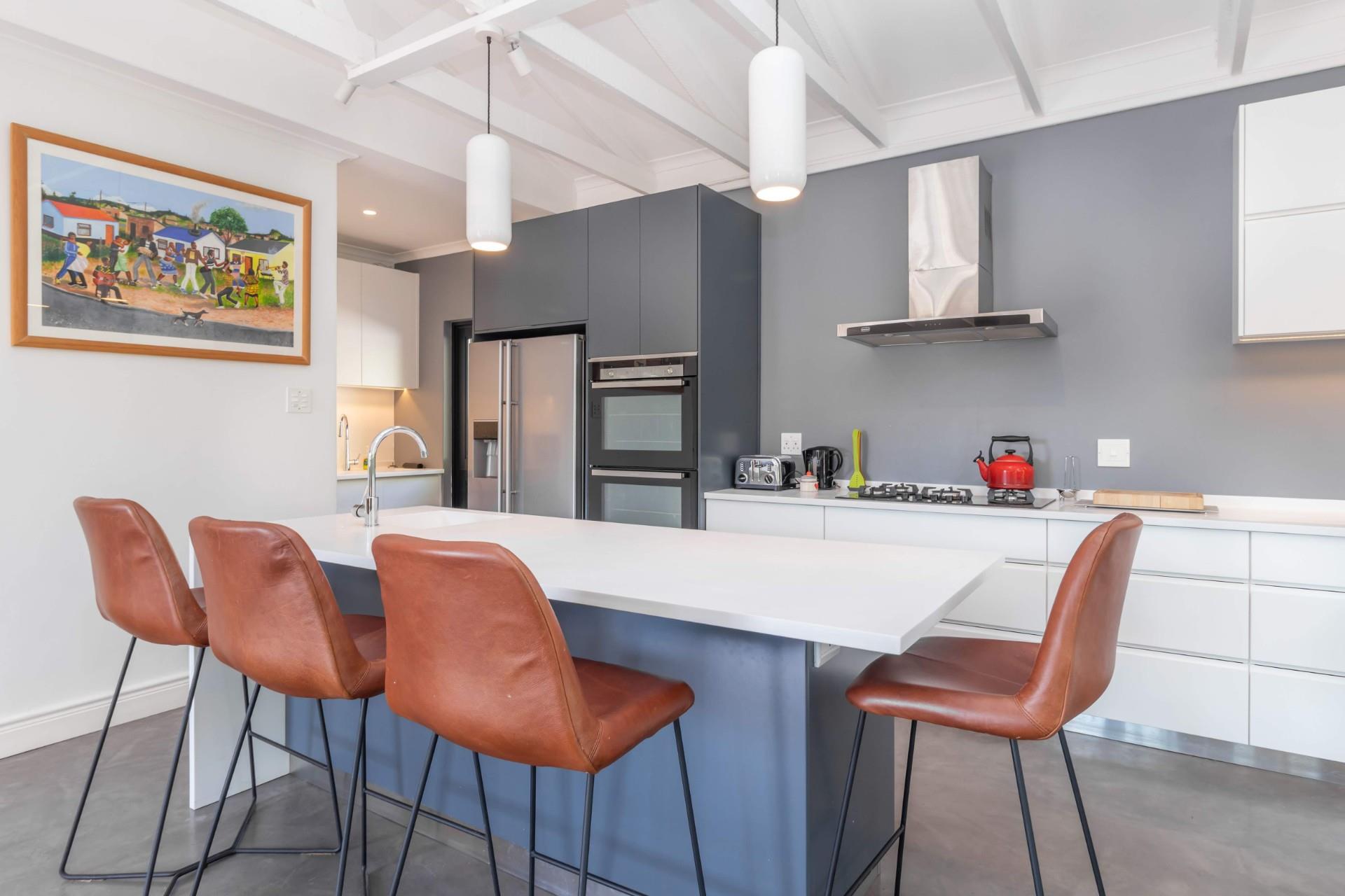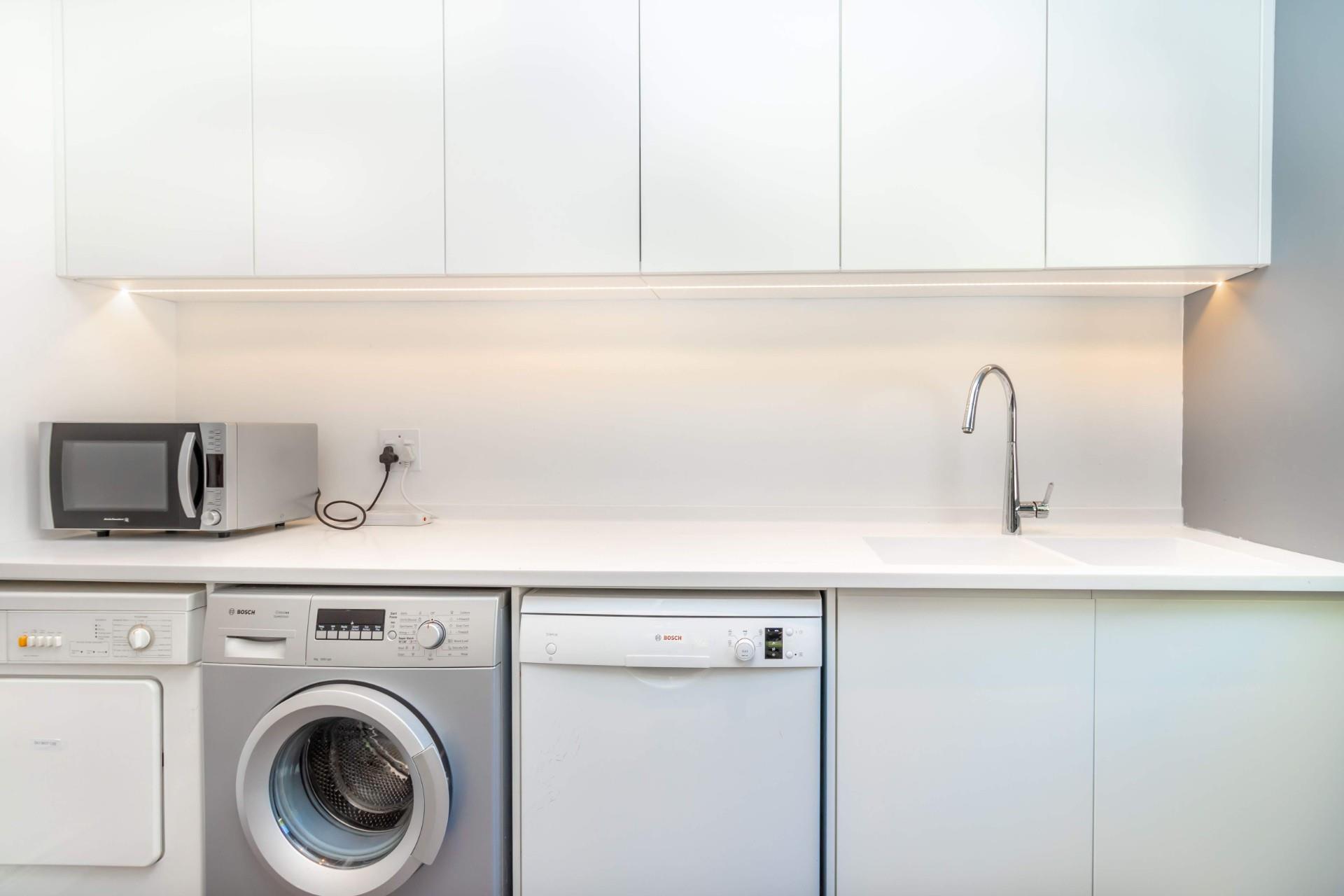 The modern, white and grey kitchen has a large island where your guests can sit and chat while you finish off dinner. There is a built-in Grundig eye level, double oven, a gas hob and space for an American-style fridge. Adjacent to the kitchen area is a scullery with space for three appliances, plenty of extra cupboards, extra work surfaces and a wash up area.