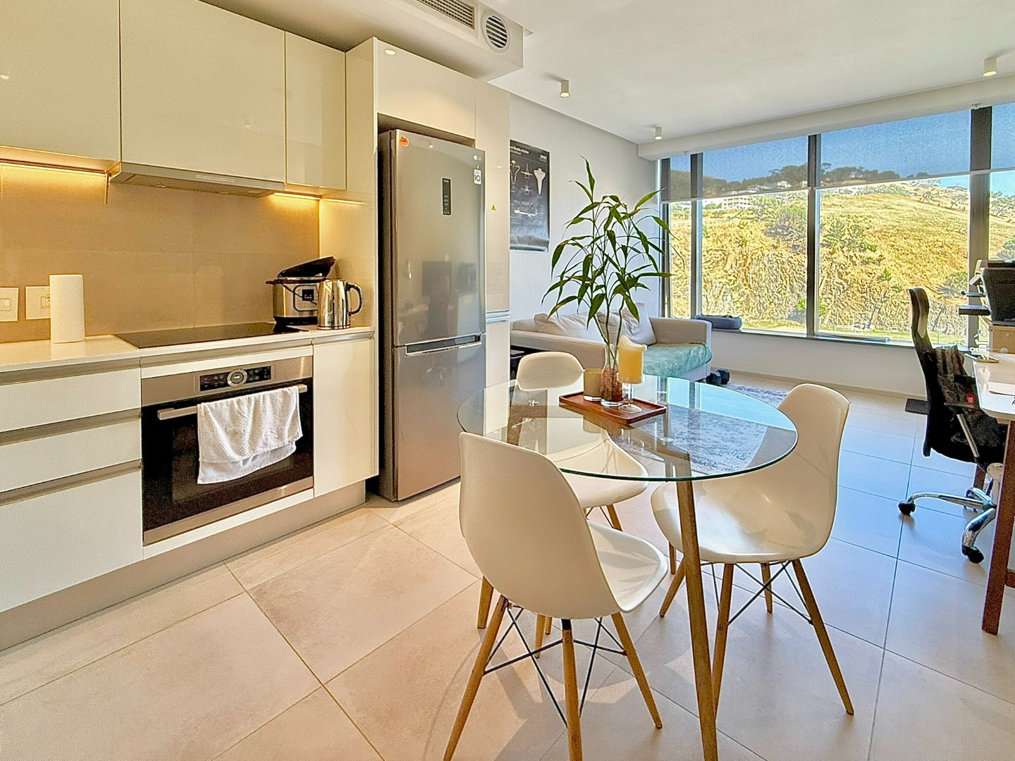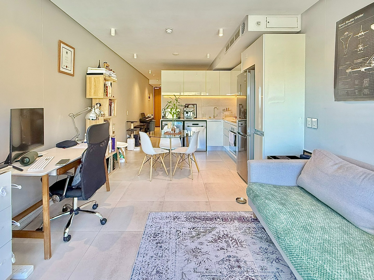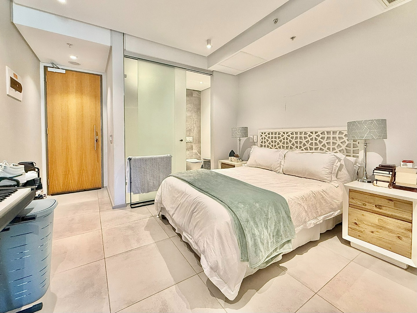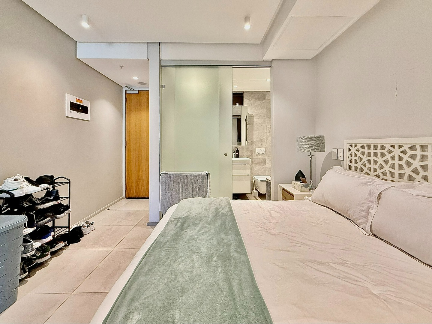 This studio apartment in 117 on Strand offers modern city living in a secure and central location. The open-plan layout includes a sleek, modern kitchen with an electric hob and stove, two water points for a washing machine and dishwasher, and LED lighting under the cabinets. Built-in cupboards create a subtle separation between the kitchen and living space. A large window fills the apartment with natural light and offers partial ocean views.
